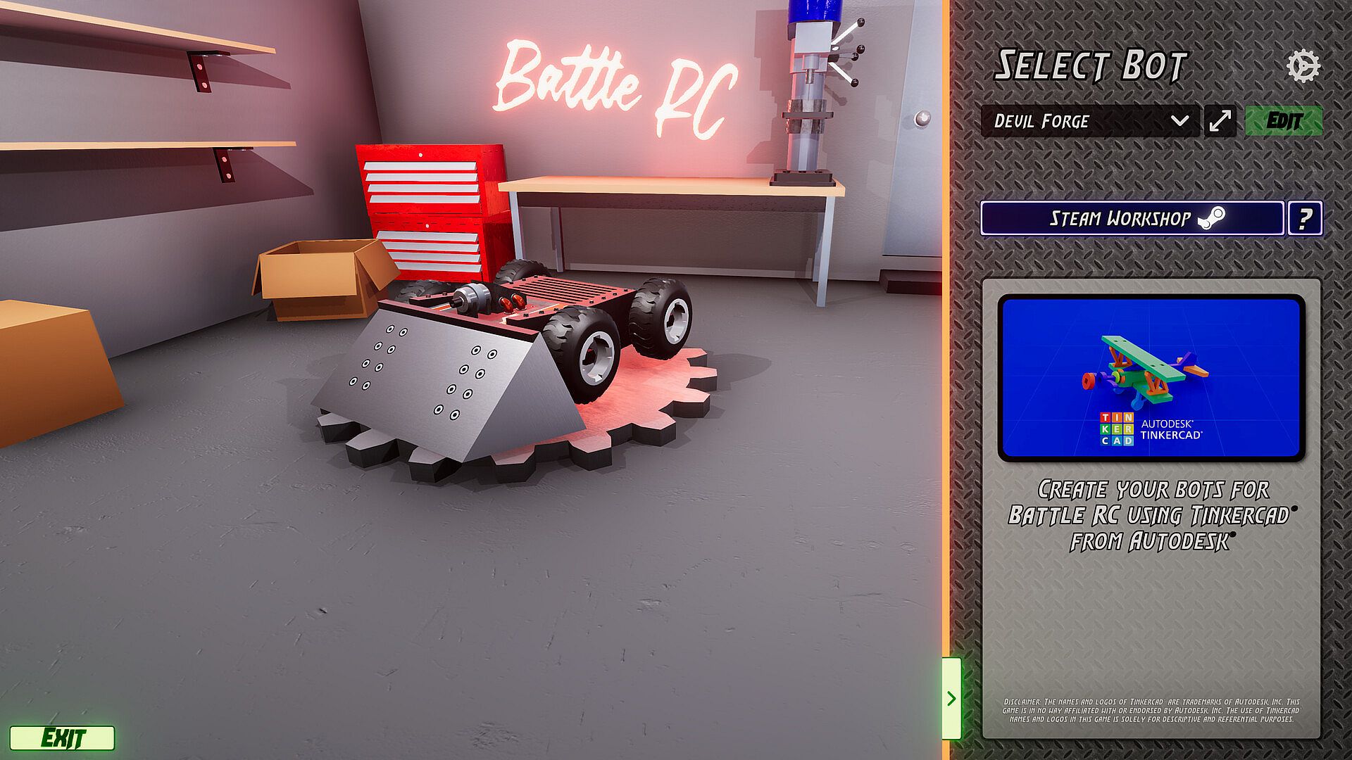 Bring your own designs to the game by importing them through the workshop! You can create your own bots using any CAD software of your choice and add them to the game. From spinners of all kinds to drums, flippers, lifters, and even flamethrowers! The game also features the Steam Workshop to download a wide selection of designs made by the awesome community. You can upload your own designs right from the game as well and engage with the community through Discord, accessing even more designs!