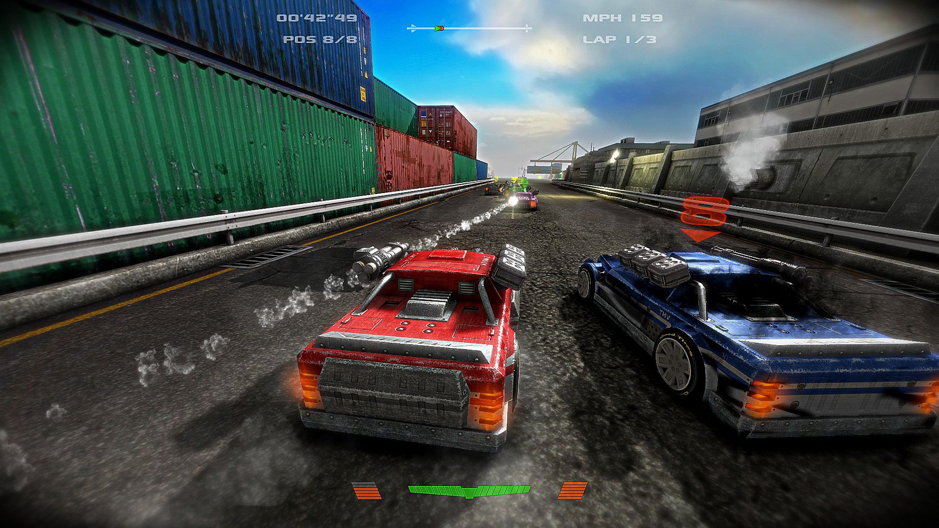 Choose from 7 unique cars, specially built to sustain the challenges of combat racing. The cars performance and visuals can be customized.• POWERFUL WEAPONS