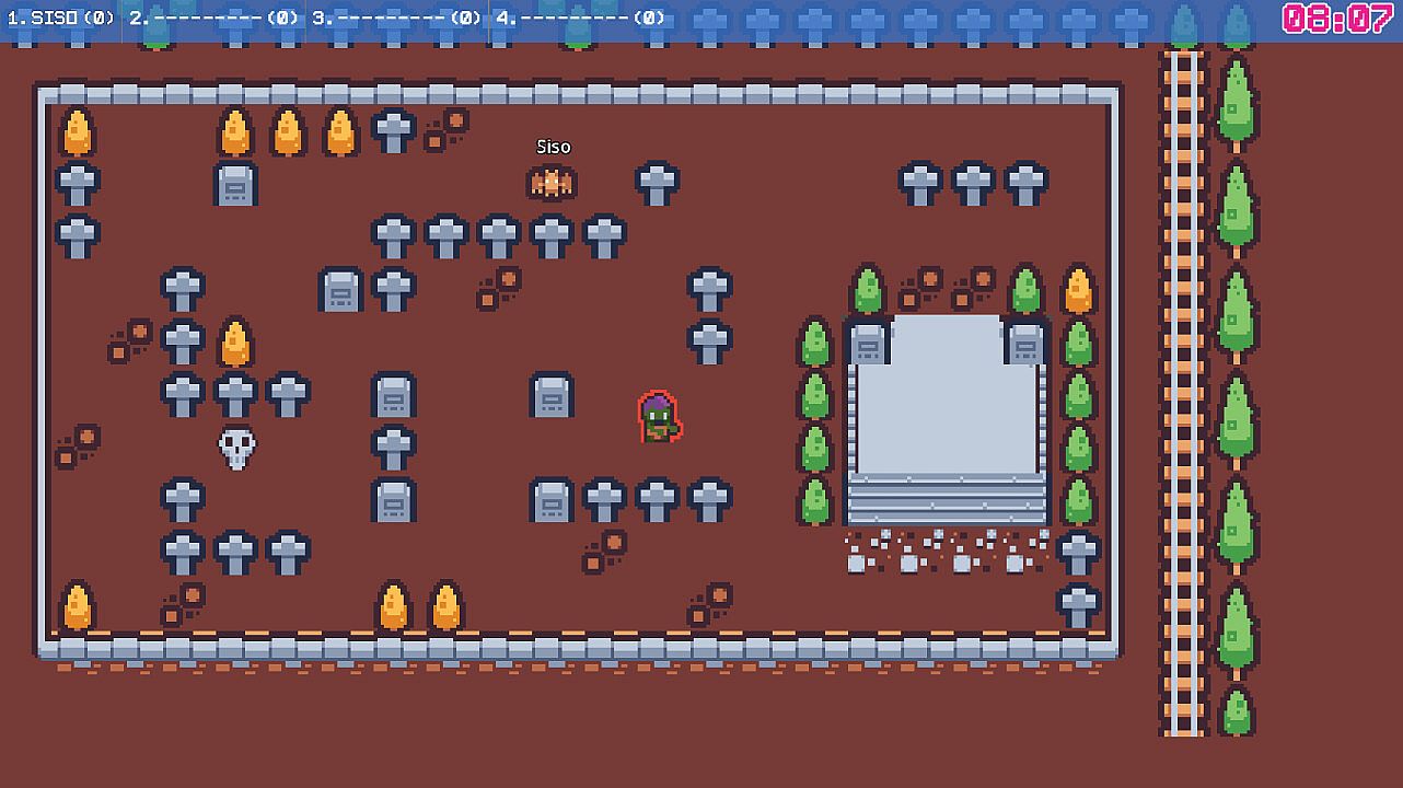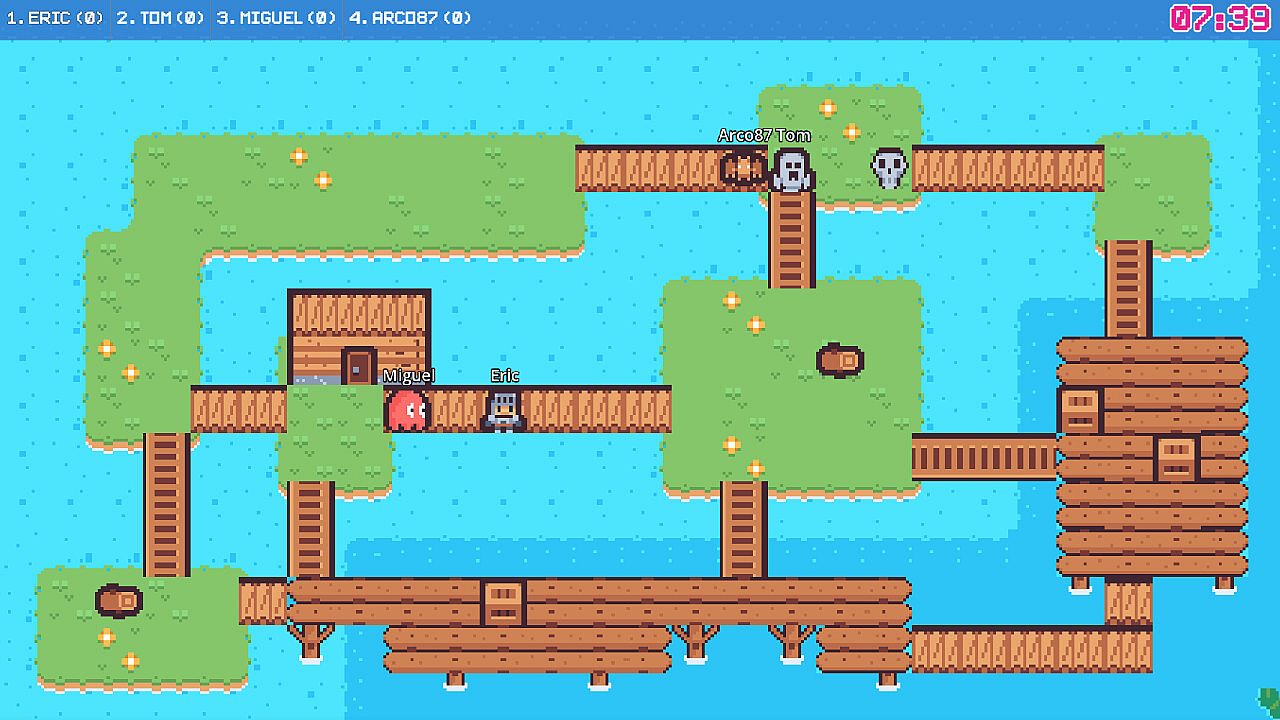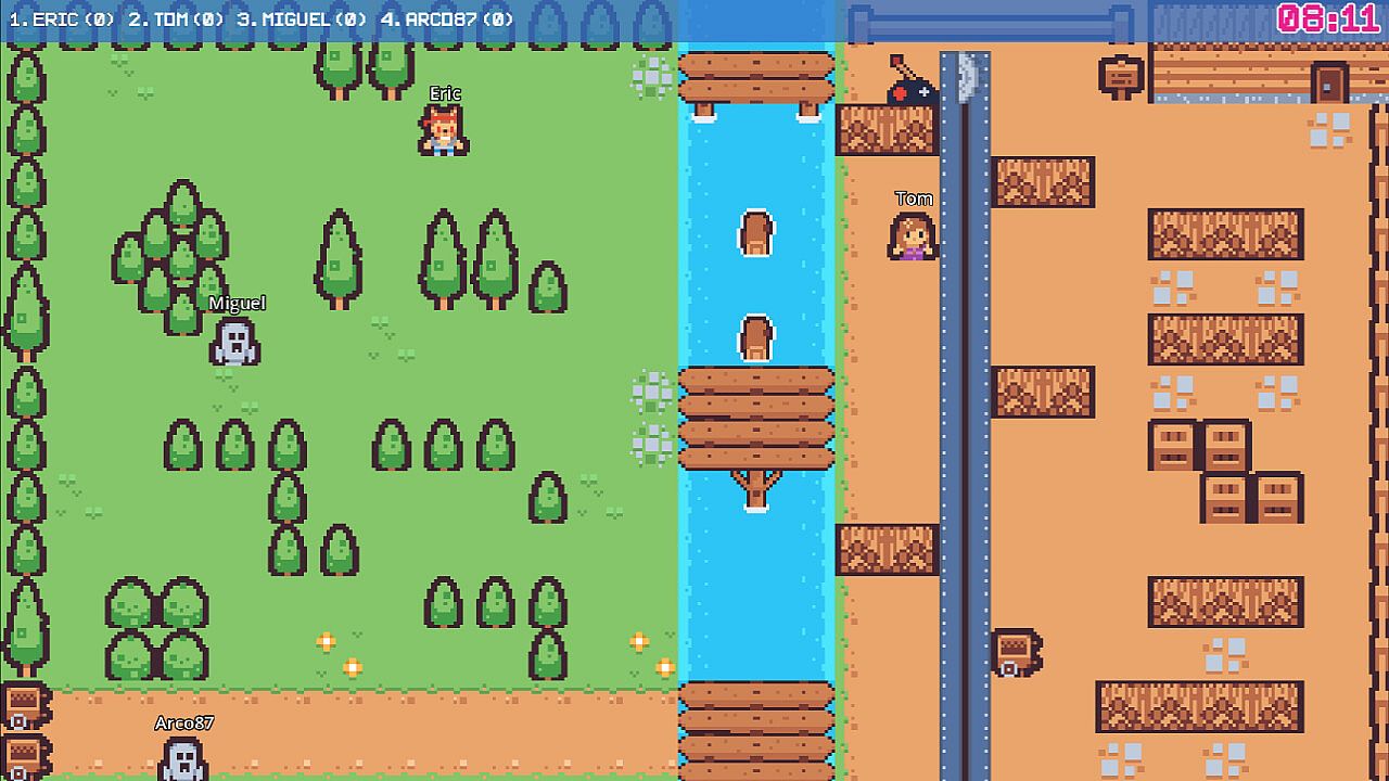 Twitch streamers host explosive battles in this 2D multiplayer action game as followers clash on grid-based maps. Players navigate the terrain, drop bombs to blast rivals, and grab powerups that expand blast radii, boost speed, cut explosion delays, or risk lives on contact. Streamers jump into the fray or oversee matches by spawning powerups, capping player counts, and setting time limits.