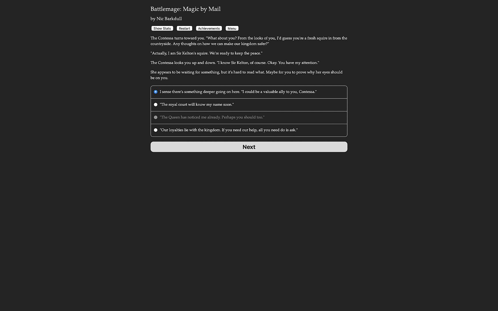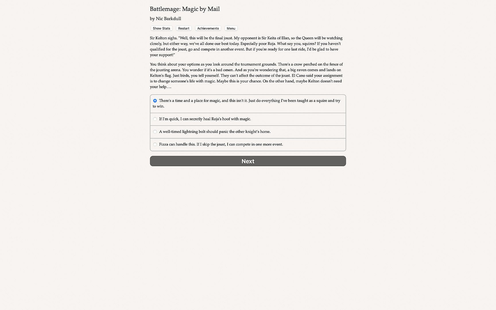 Battlemage: Magic by Mail is a 168,000-word interactive novel by Nic Vasudeva-Barkdull. It's entirely text-based, without graphics or sound effects, and fueled by the vast, unstoppable power of your imagination.