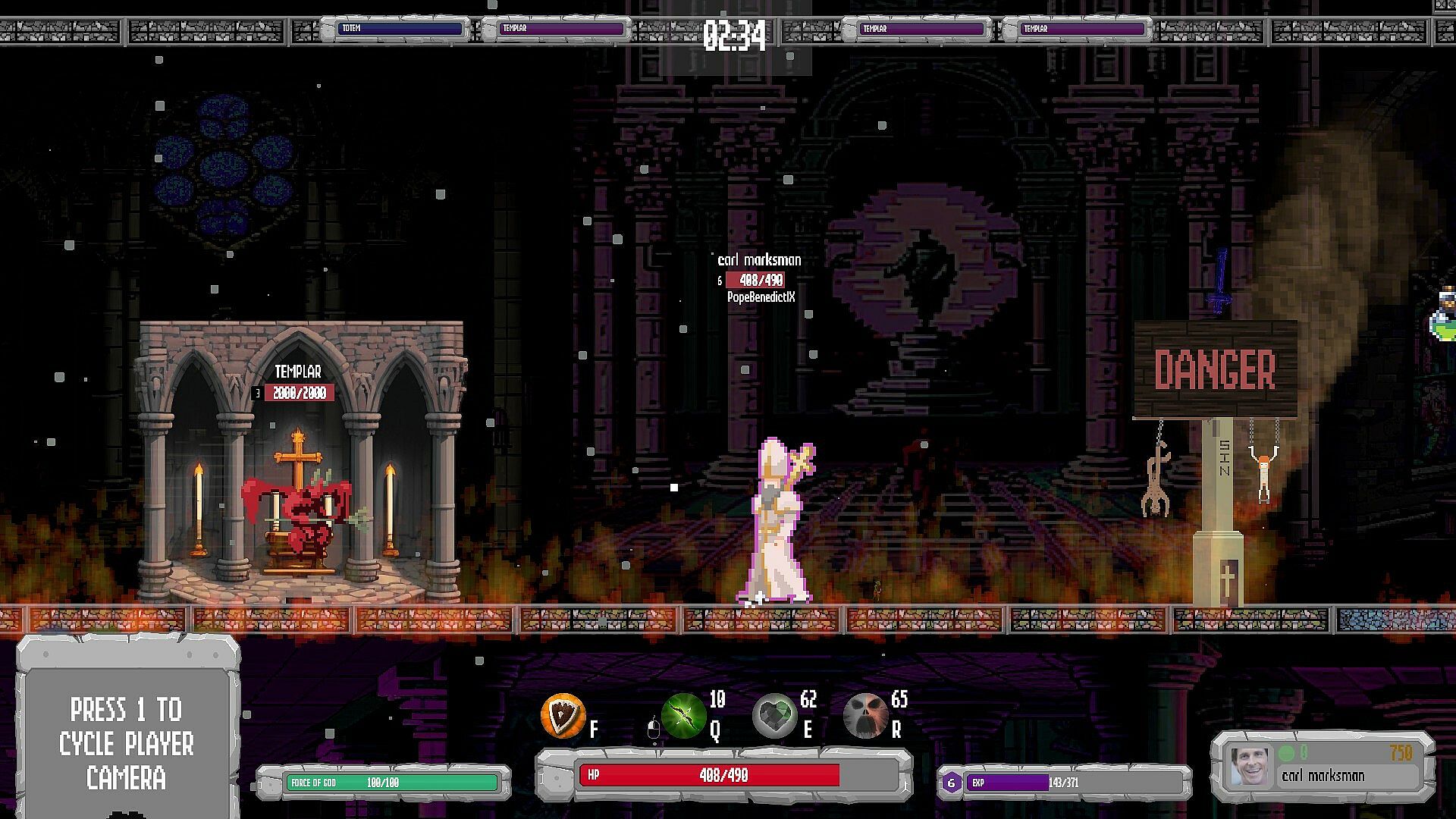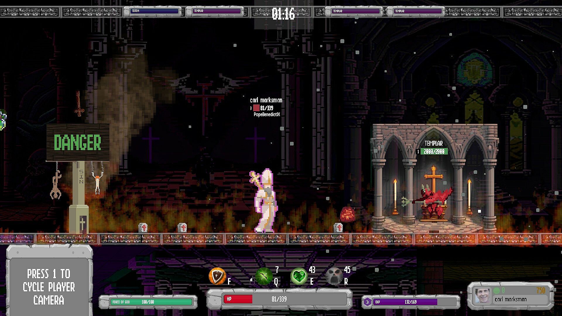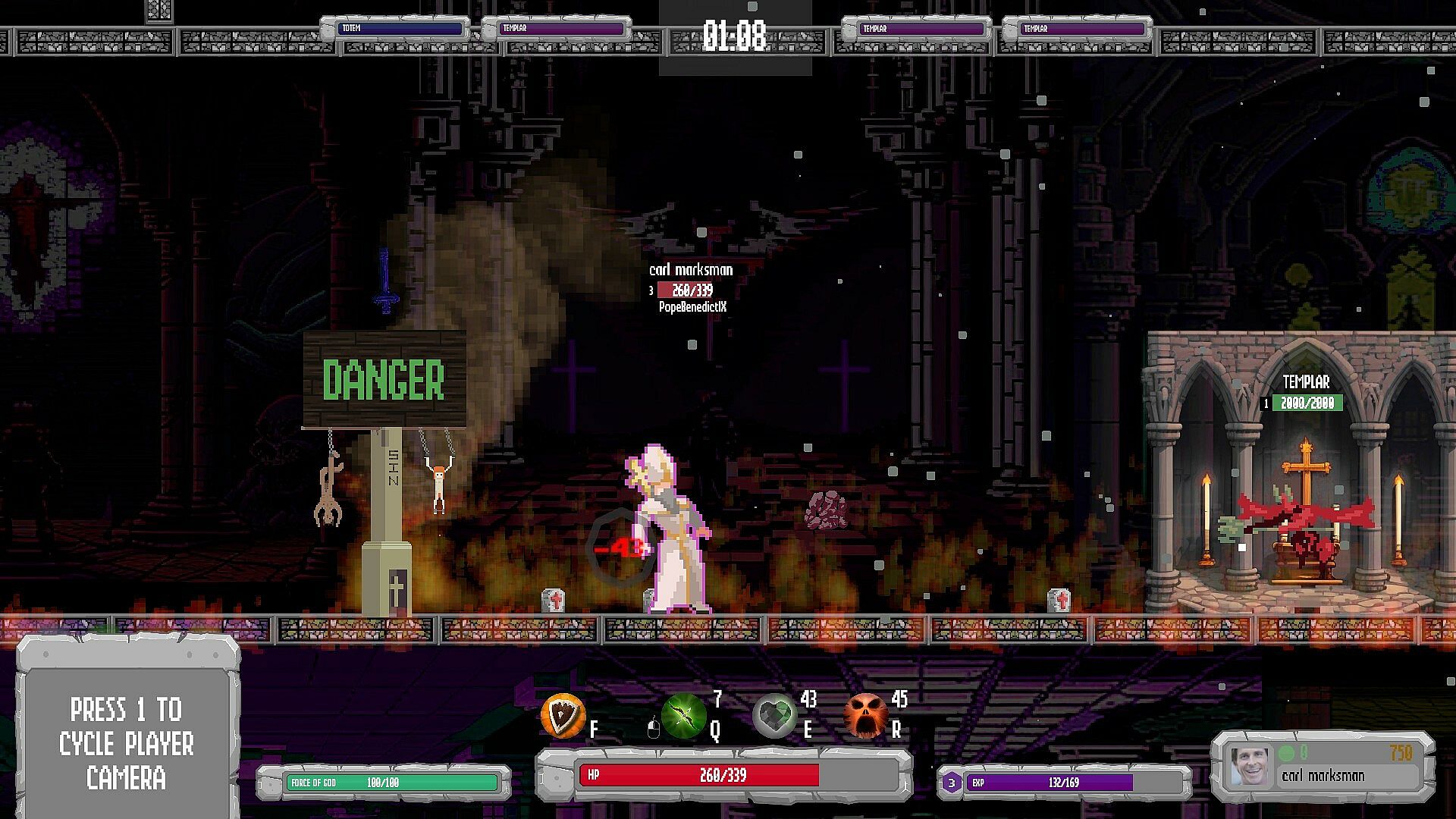 Online multiplayer action pits popes and antipopes against each other in fast-paced 2D sidescrolling MOBA battles on PC. Players select divine champions like Pope Urban VI, who wields melee attacks, a brief block that halts all damage for 2 frames at 50 Force of God cost, and cooldown-based abilities such as Monk's Prayer for 12hp healing or Pomposus that launches a 70hp-damaging flaming skull with 8 DPS fire over 5 seconds. Quick team clashes demand sharp positioning and reflexes, with passives like "The Elected" doubling melee damage for 1.5 seconds after Pomposus. This free to play game draws in action fans who crave straightforward, cooldown-driven combat and lightning-fast pope showdowns.