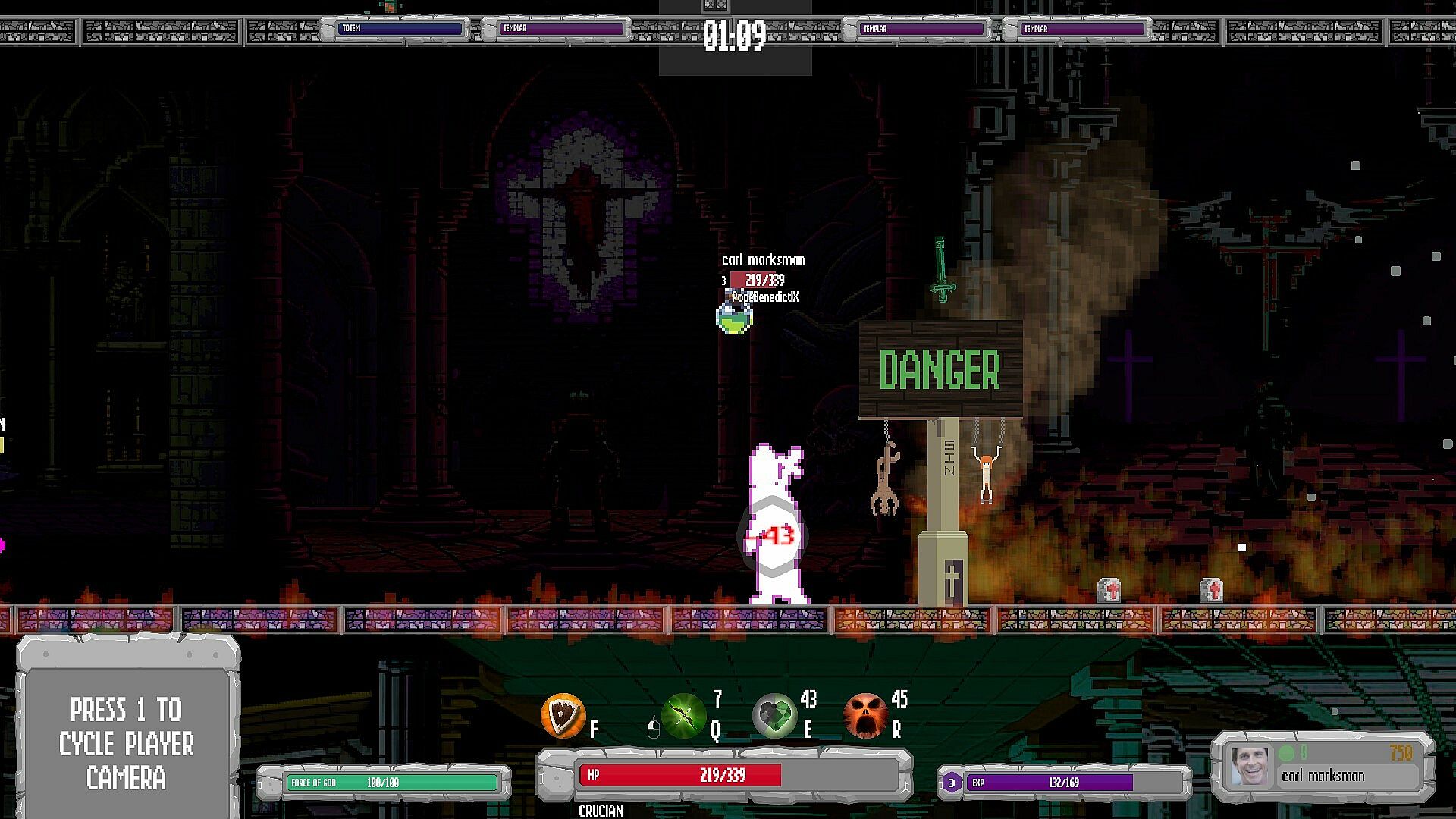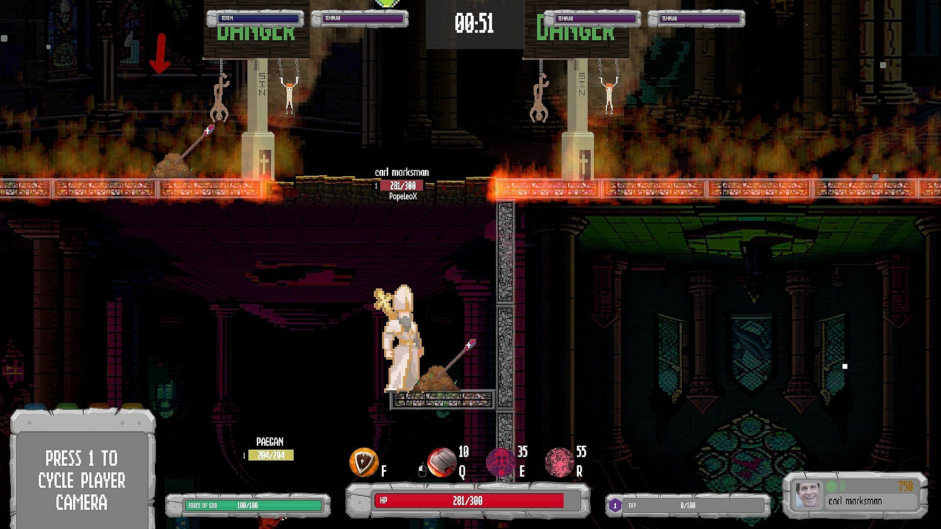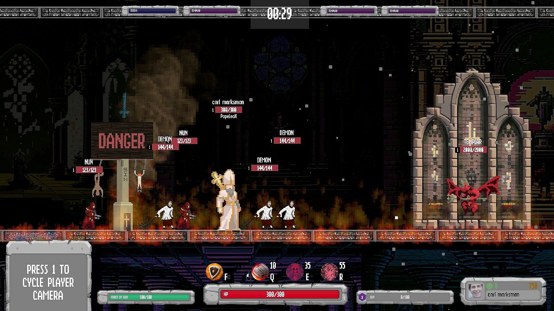 Online multiplayer action pits popes and antipopes against each other in fast-paced 2D sidescrolling MOBA battles on PC. Players select divine champions like Pope Urban VI, who wields melee attacks, a brief block that halts all damage for 2 frames at 50 Force of God cost, and cooldown-based abilities such as Monk's Prayer for 12hp healing or Pomposus that launches a 70hp-damaging flaming skull with 8 DPS fire over 5 seconds. Quick team clashes demand sharp positioning and reflexes, with passives like "The Elected" doubling melee damage for 1.5 seconds after Pomposus. This free to play game draws in action fans who crave straightforward, cooldown-driven combat and lightning-fast pope showdowns.
