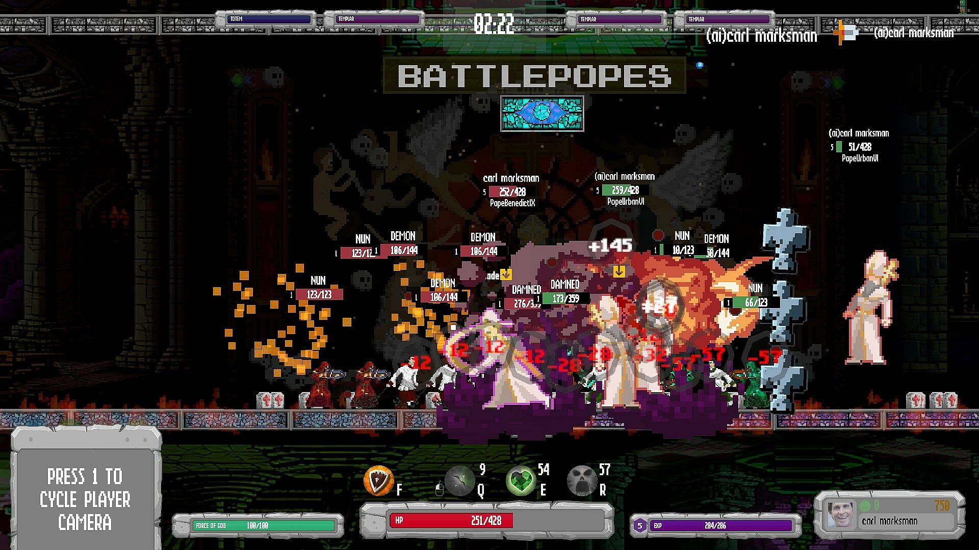 It's online multiplayer popes beating the *&$# out of each other. It's not that complicated. Battlepopes is an action packed 2D Sidescrolling MOBA, with cooldown-based abilities.