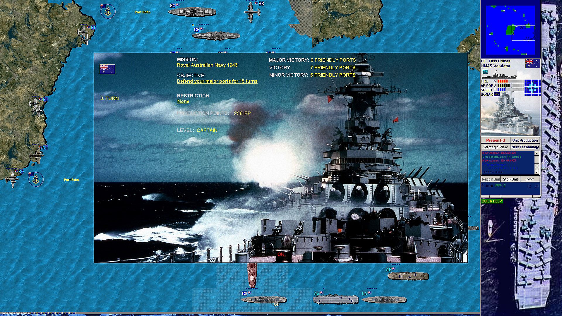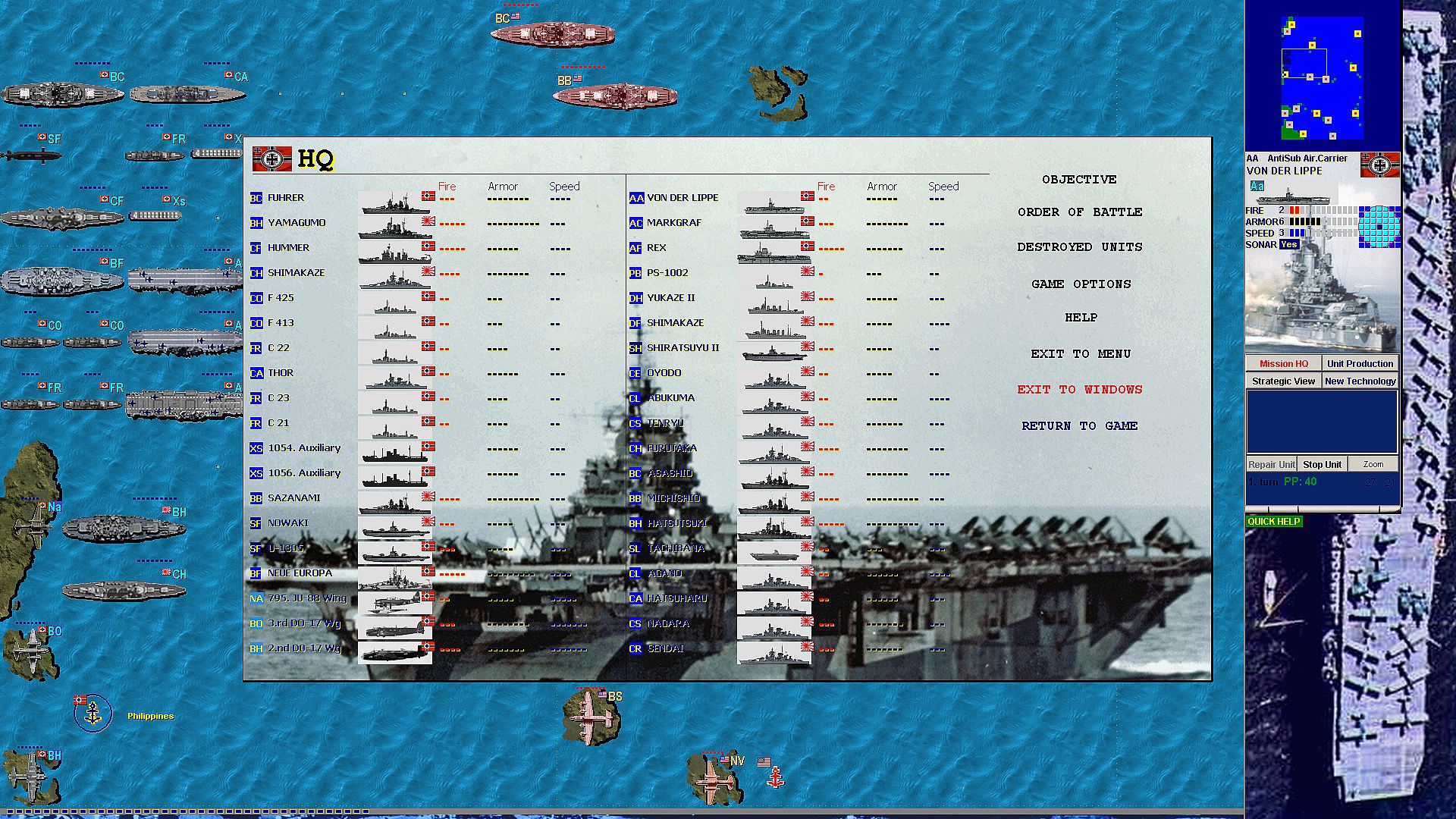 Unit types: (combat ships, submarines, air units, port artillery, radar stations)