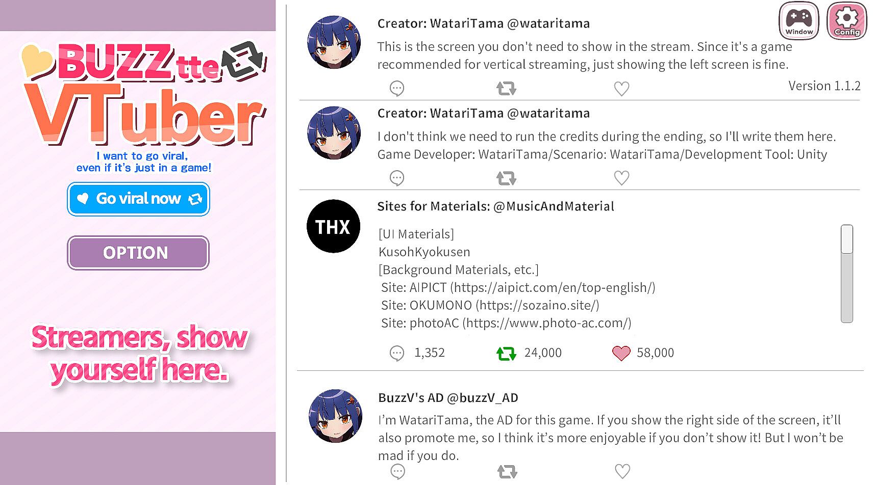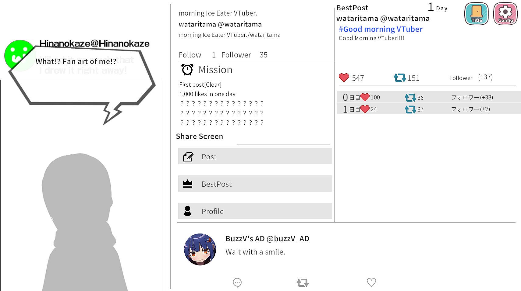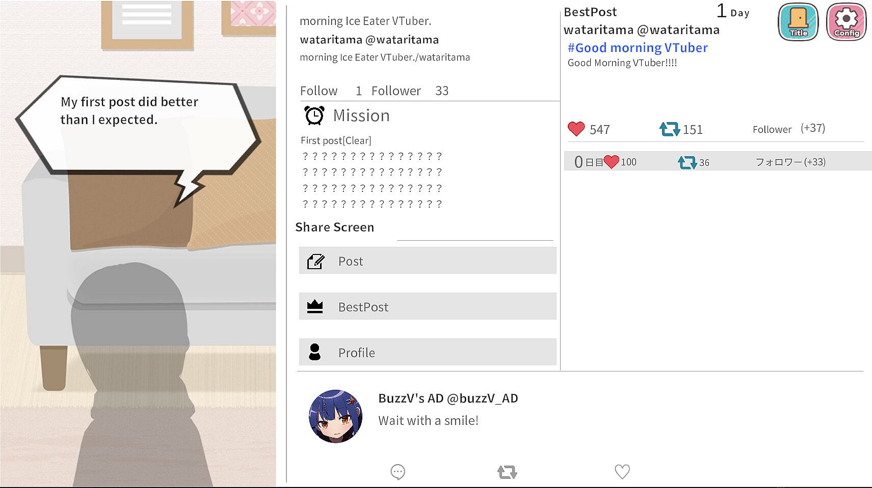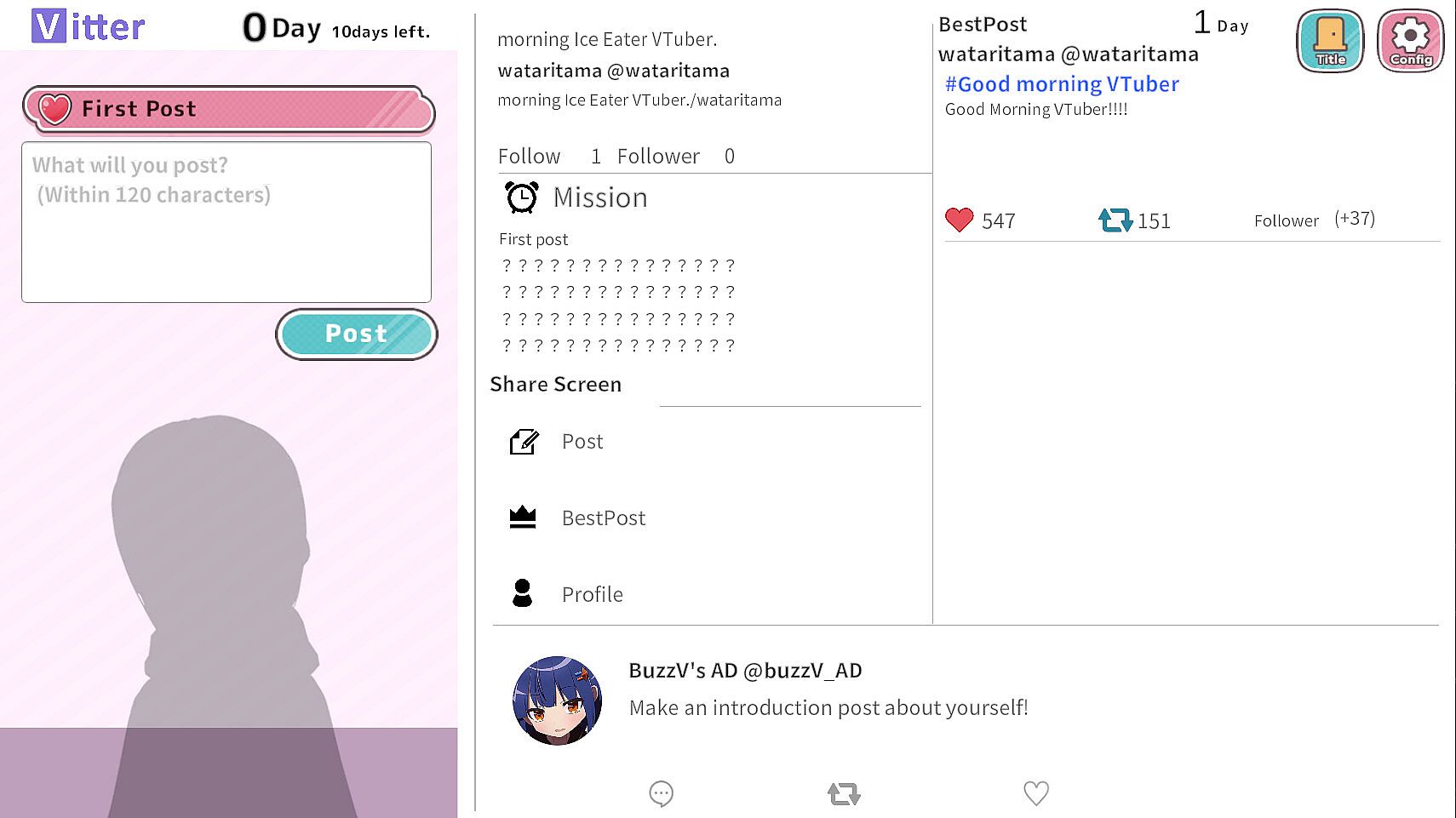 **"Go viral as a VTuber – all it takes is one hit!"** is a social media-inspired simulation game.You are the protagonist, the streamer. How many likes can you earn in the 10 days of gameplay?