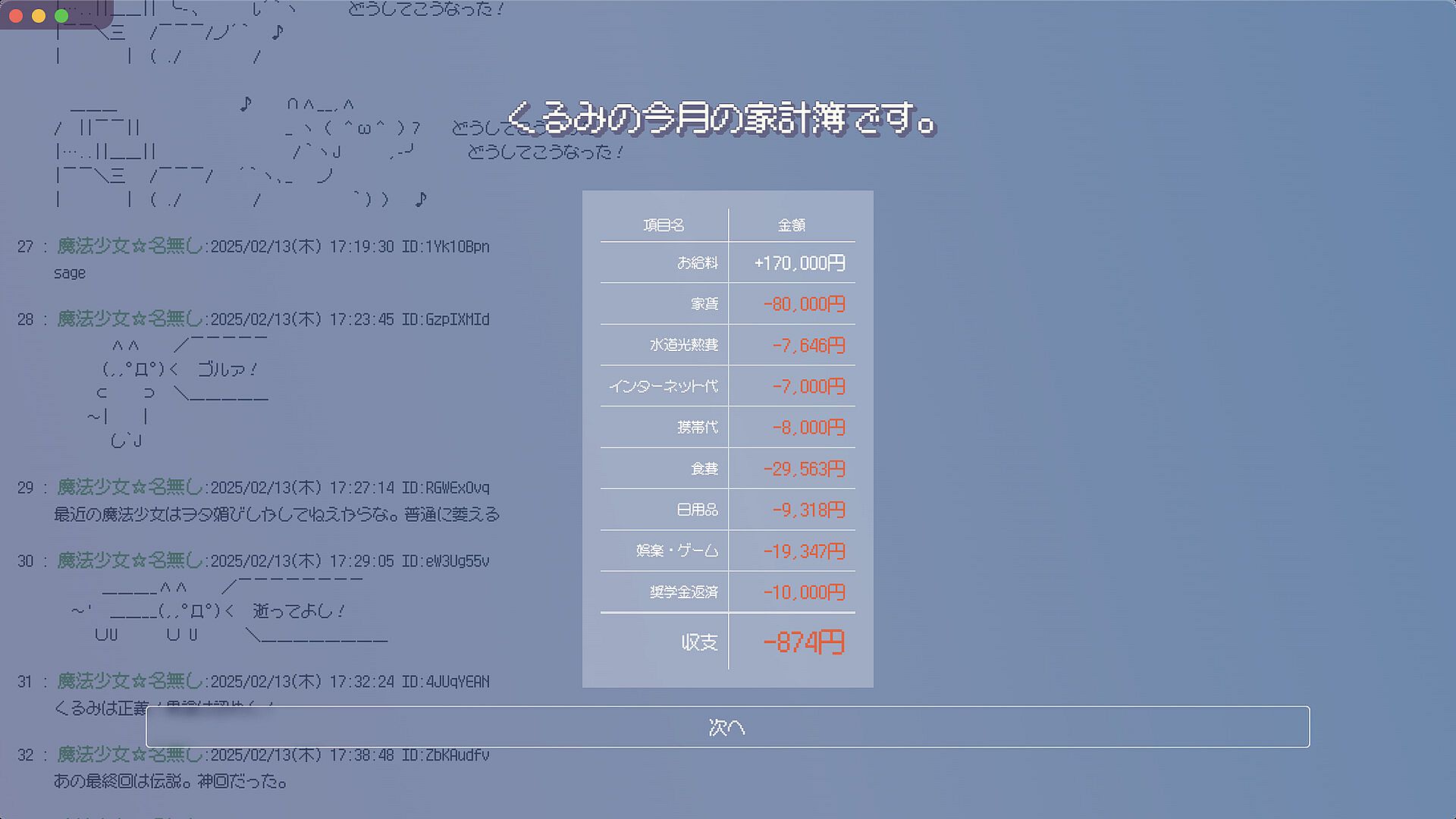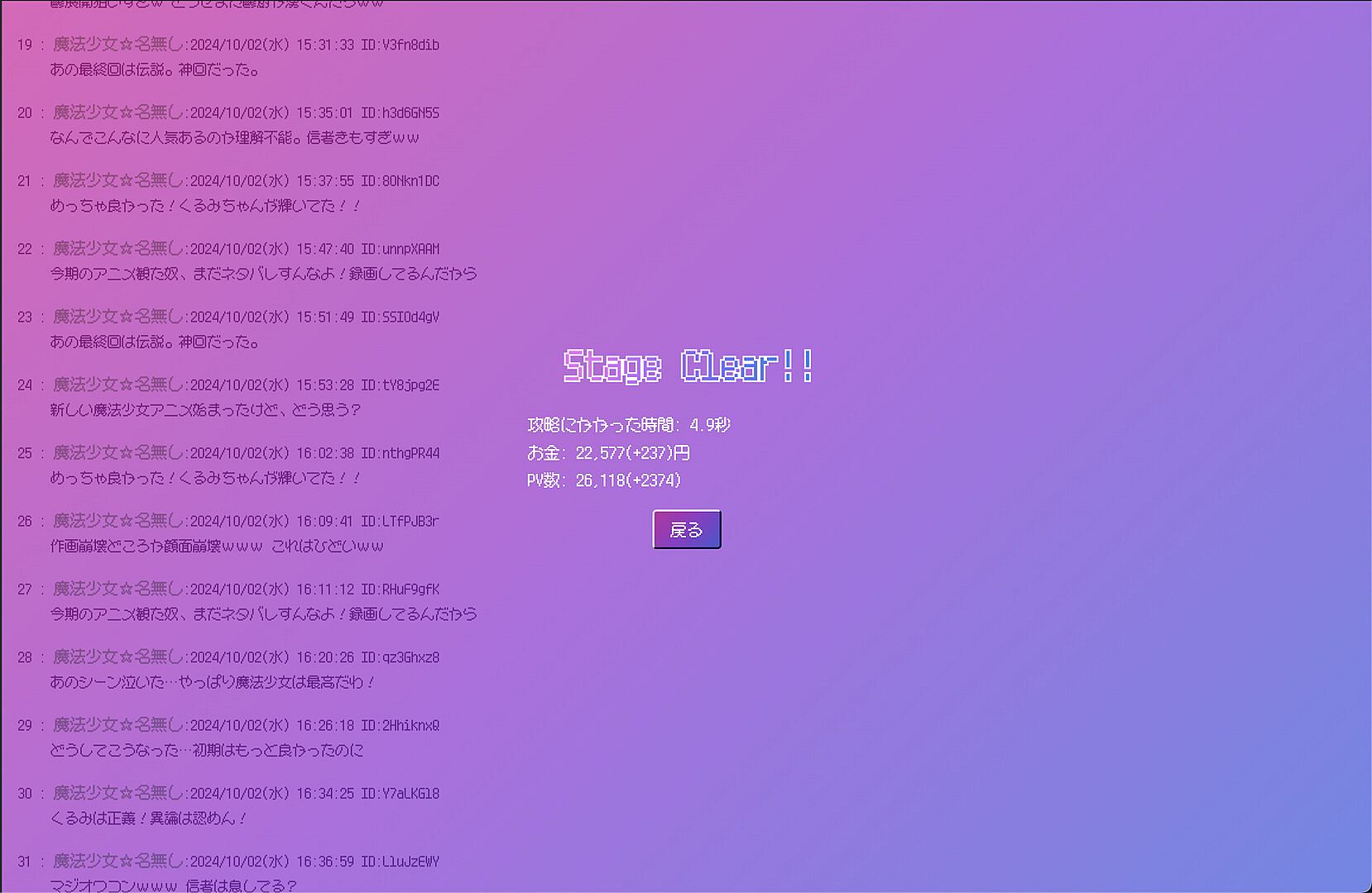 In the past, bulletin boards were a great place to support Kurumi as a magical girl. Kurumi's heyday has passed, and now those bulletin boards are in disrepair. Protect the bulletin board and become popular again in a screen that reminds you of the Internet and CRTs of the Heisei era.