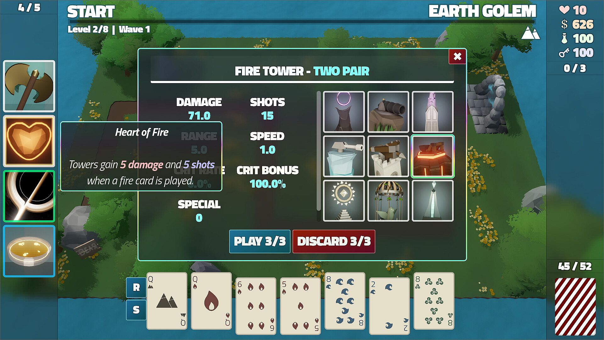 Elemental towers with upgradeable stats and abilities