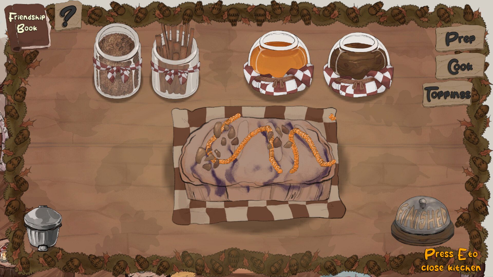 Bearly Baking is a cooking and relationship-building game where you play as a bear running an inn to feed animals for hibernation. You cook bread and muffins in small mini-games, and based on the quality, you build better relationships with your patrons and learn more about their stories.