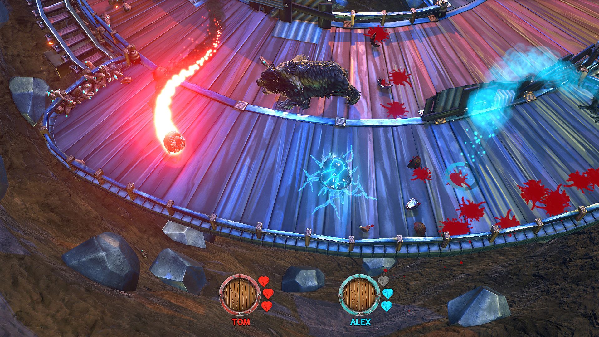 BEARZERKERS is a local multiplayer game of two halves, with a focus on indirect combat and avoidance. HUNT pits you and your friends against each other; where you don't need to run faster than the bear to survive, just faster than the person next to you. GAUNTLET is the ultimate game of moment to moment cooperation where every second counts and a single slip up can be the end for you and your team.