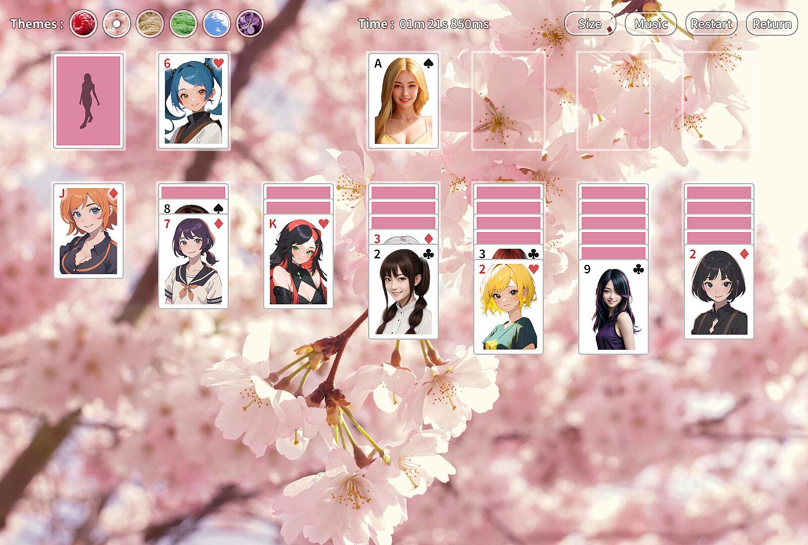 This game, based on the classic gameplay, allows you to relive the fun of the solitaire game in a relaxing and enjoyable manner, through cute girl-themed cards, exquisite game graphics, and heart-touching melodies.