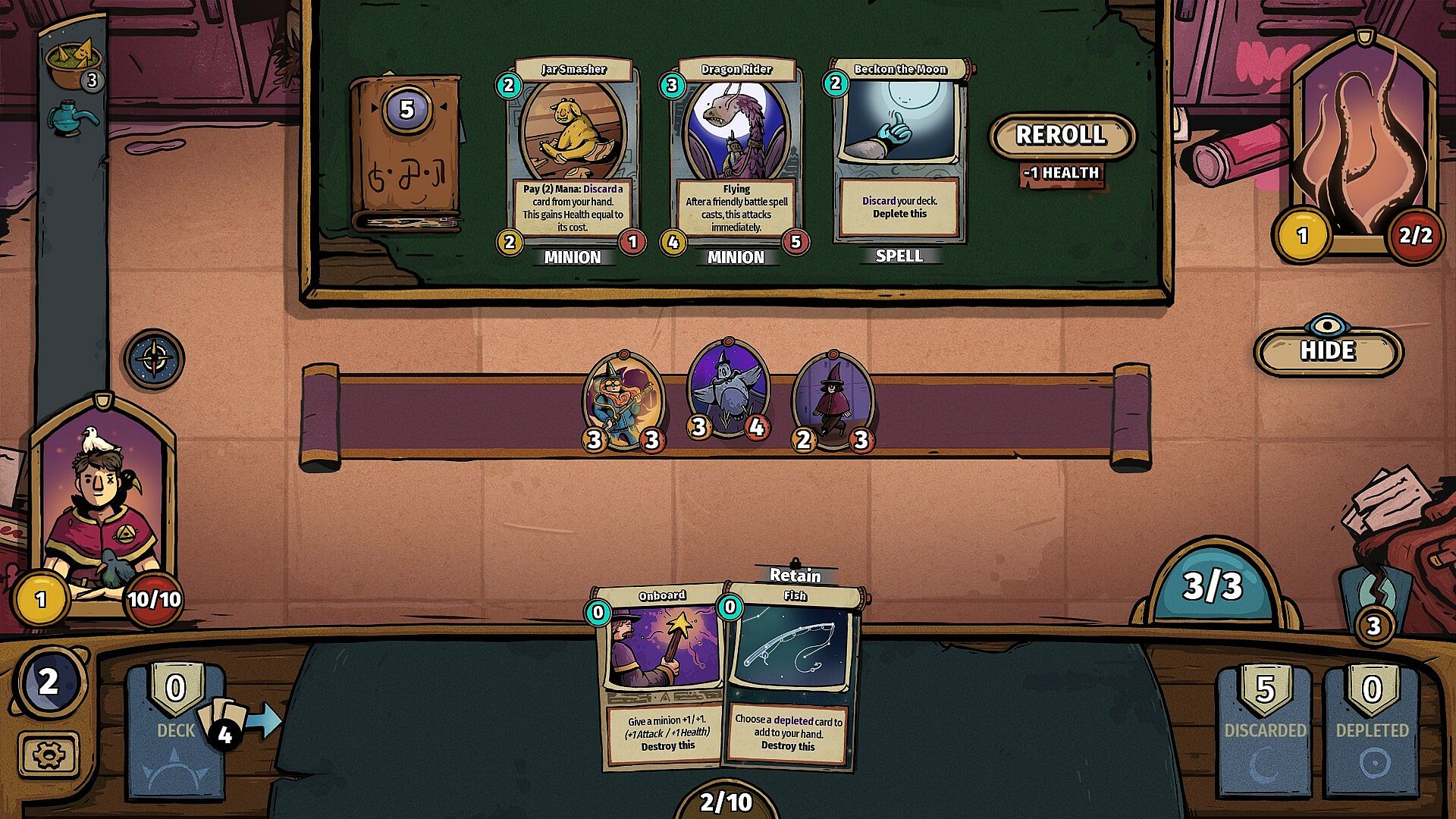 A challenging deck-building auto-battler requiring you to out-think your opponents in your attempt to Become The Moon. Cycle through your decks to level-up and unlock more powerful cards and spells. Consider every move, use your mana wisely, and carefully manage your health. Acquire relics, minions, and spells as you look to overcome the difficult journey that awaits.