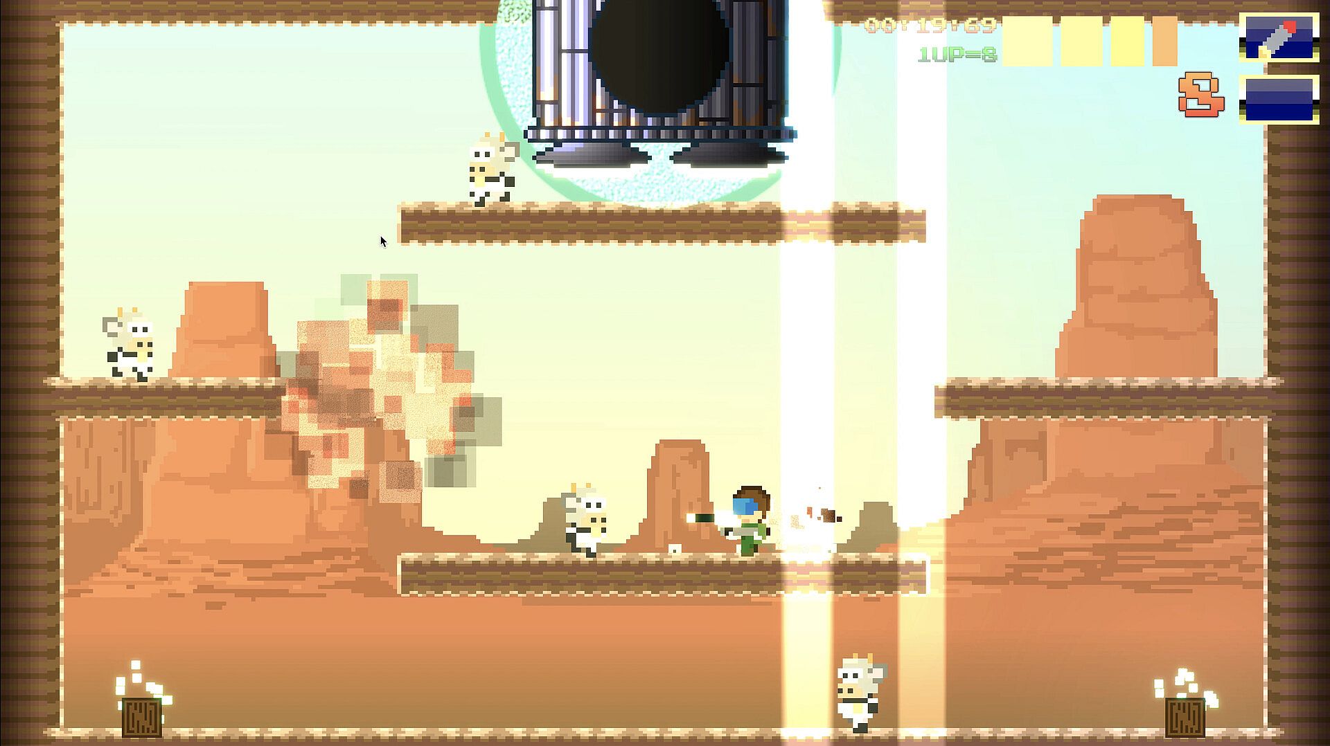 Your mission, should you choose to accept it, is to help MeggaCorps rid the planet of this mutant menace by venturing out into the world and defending its people from the deadly herd. While on tour, you'll meet new people, find weapons, and face the most fearsome boss cows on the ranch.