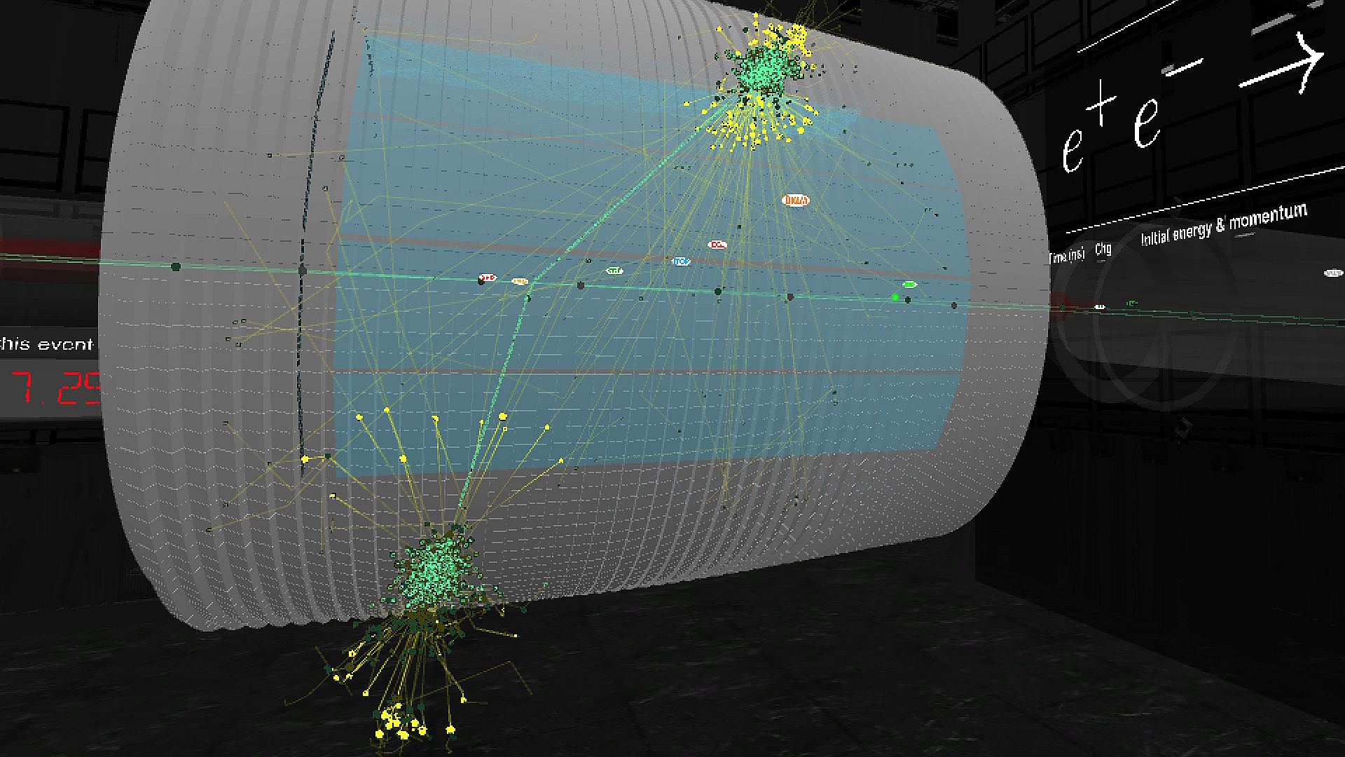 With your controllers, you may move horizontally and vertically to enter the detector's interior and rotate your viewpoint. By turning your head, you may view the detector and the collision by-products from different orientations. You may rewind and fast-forward through the history timeline of each collision event, pause/resume, and slow down or speed up the animation rate. You may zoom in or out with your controllers if you enable this feature in the in-game menu (guide page 6).