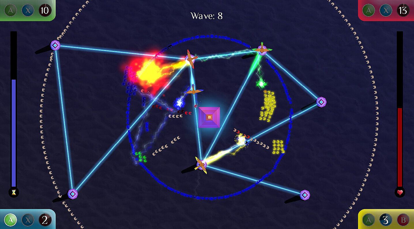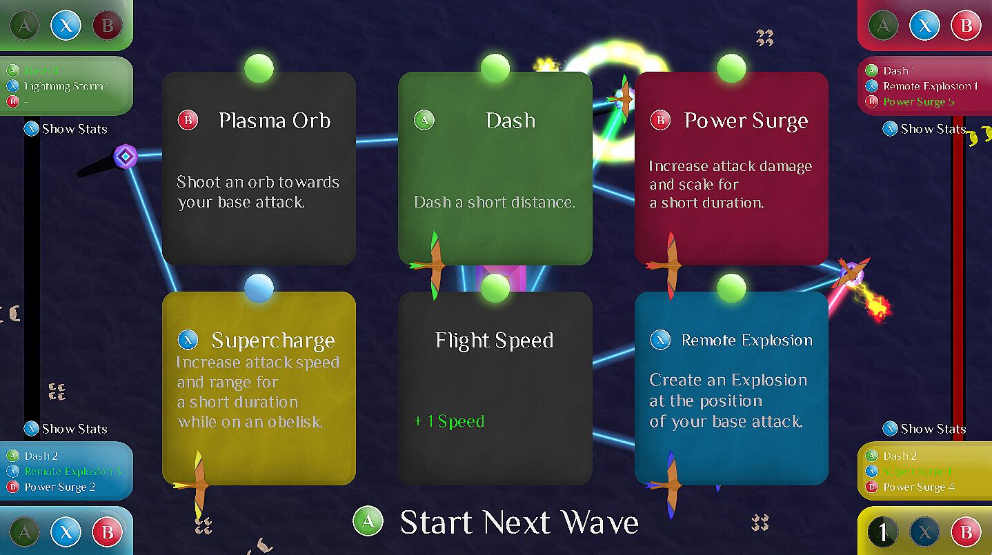 Several of Bennu Bennu's unique spells and upgrades focus on player interaction, including abilities such as connecting birds with lightning, destroying all enemies in its path.