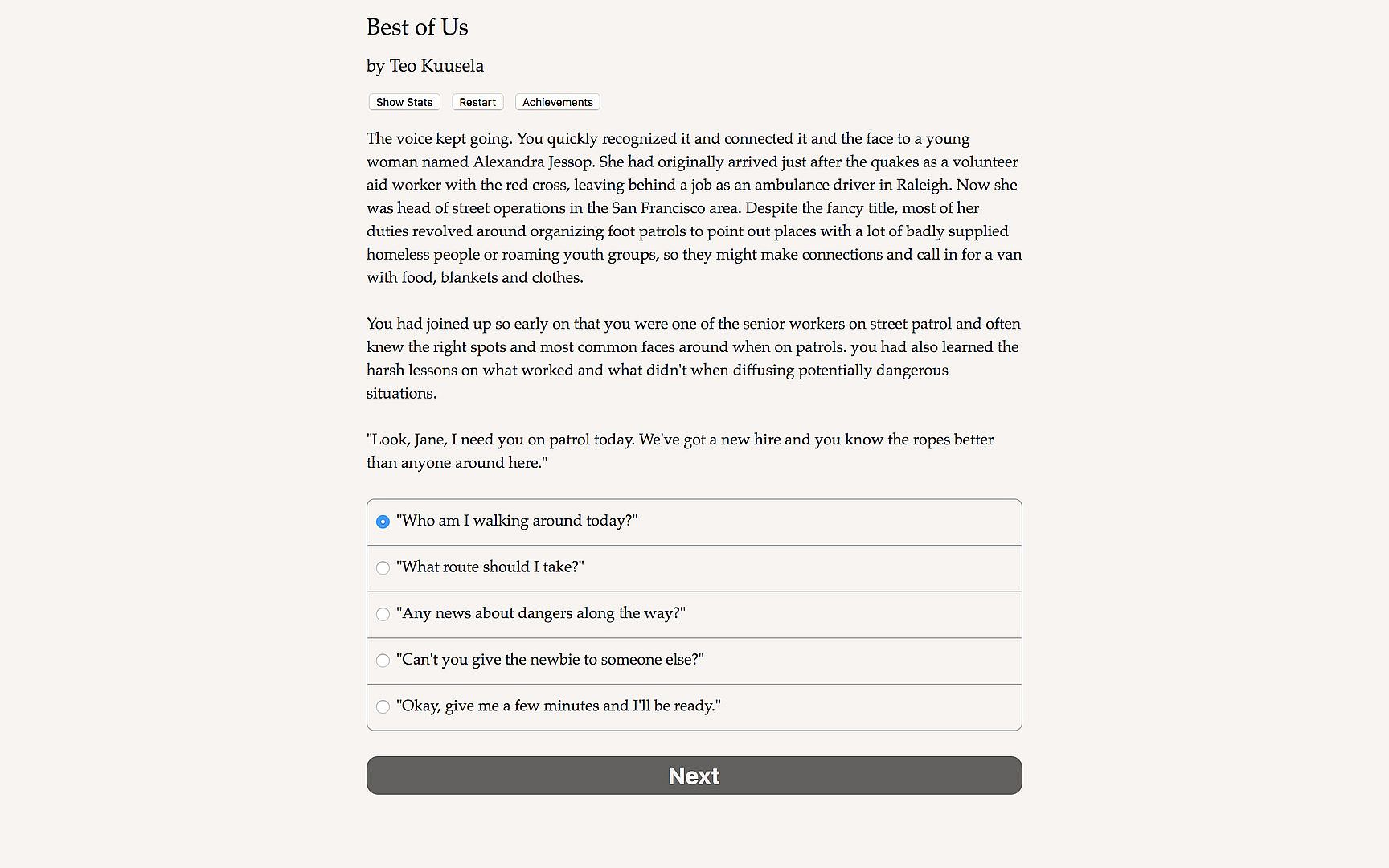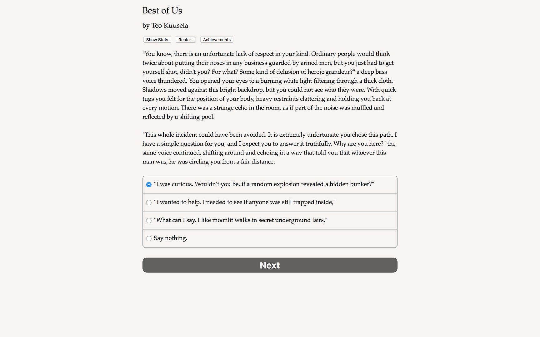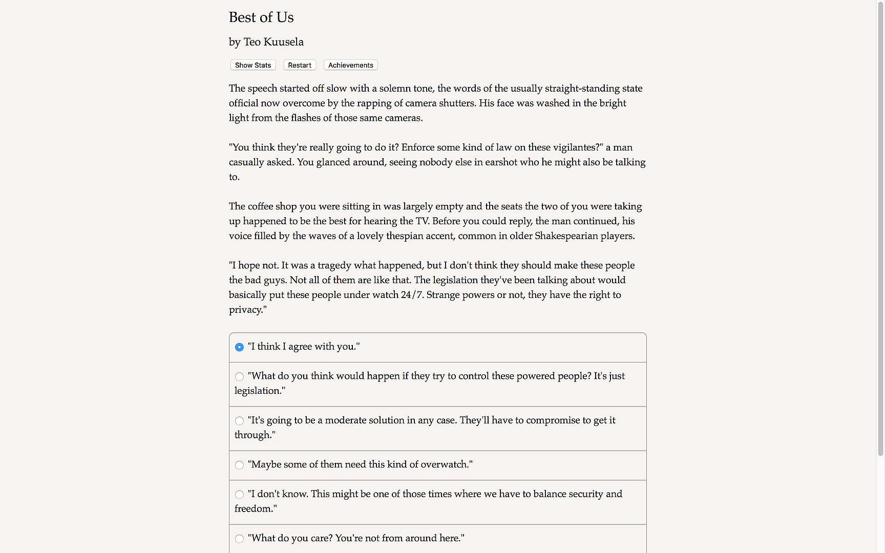 "The Best of Us" is an interactive novel by Teo Kuusela, author of "Lords of Aswick." Your choices control the story. It's entirely text-based--127,000 words, without graphics or sound effects--and fueled by the vast, unstoppable power of your imagination.