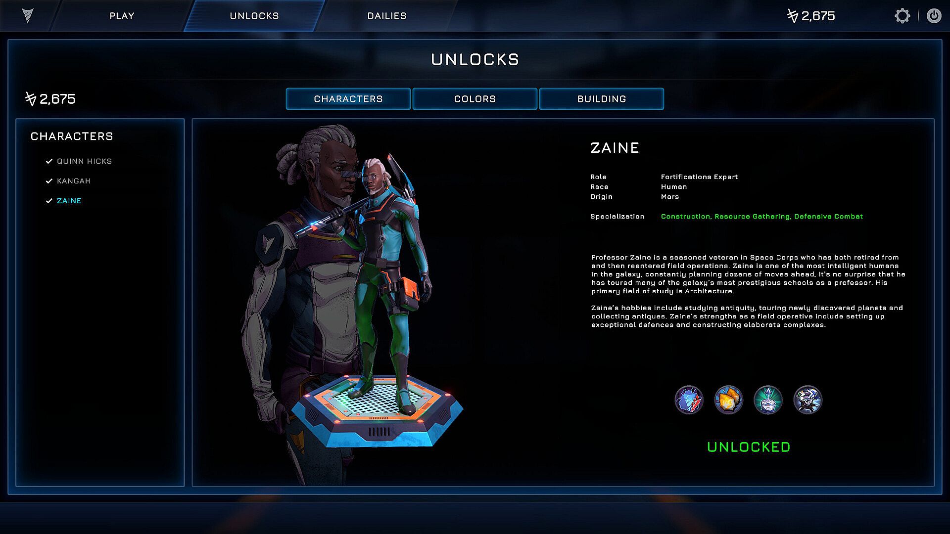 Now featuring a diverse cast of unique playable characters, each with their own skills, abilities, and equipment. Quinn is a versatile generalist, Kangah a fierce warrior, and Professor Zaine an expert builder. A 4th character is being developed and will be added after release.