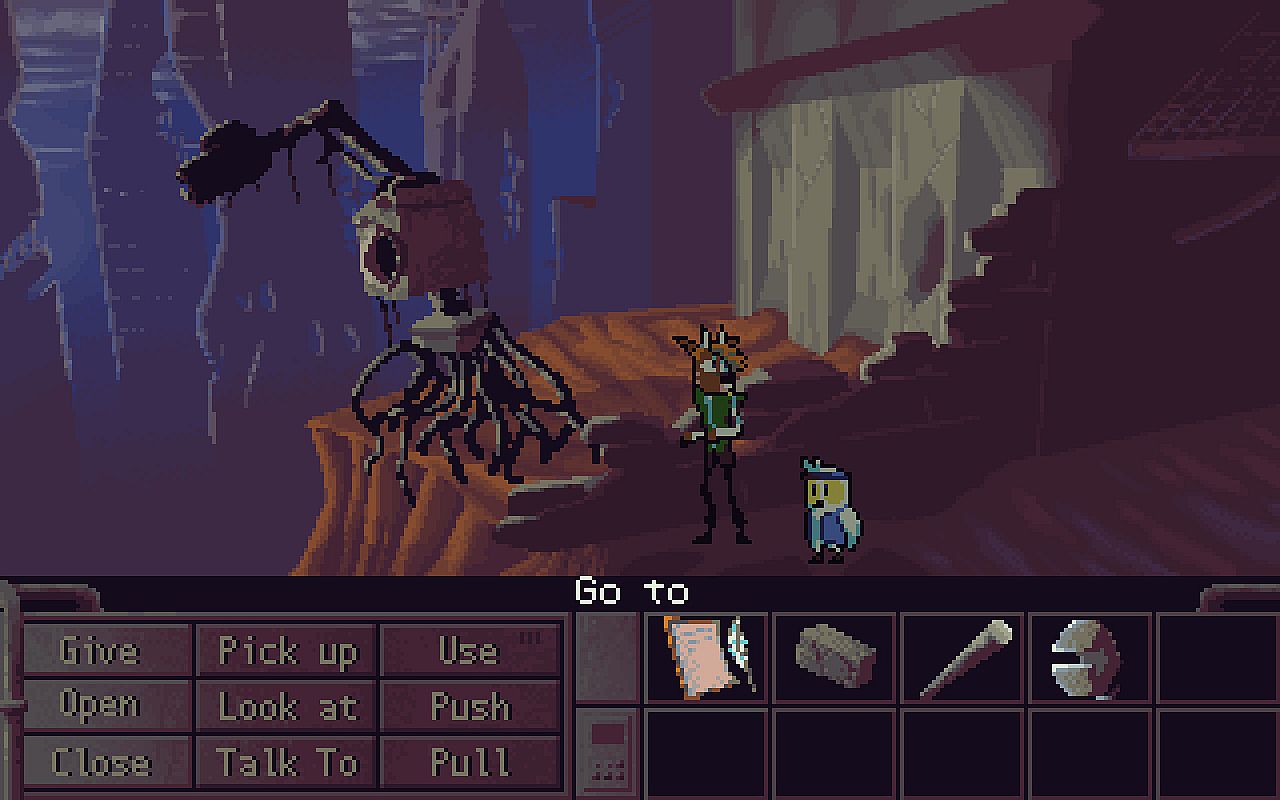• Cinematic cutscenes, reminiscent of hand-drawn animated movies, mixed with a pixel art aesthetic