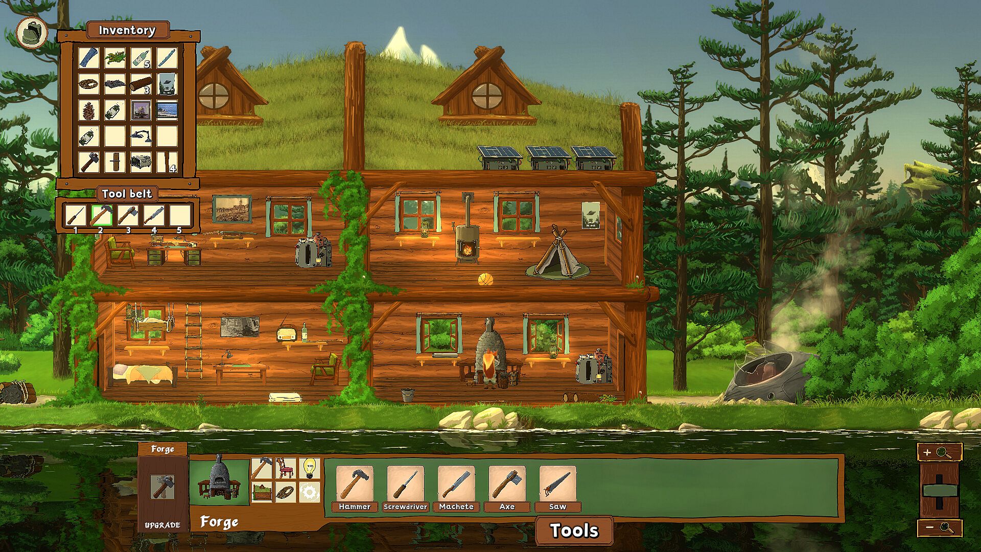 Collect items in the forest and craft from specialized crafting tables: Woodcraft, Kitchen, Electronic, Forge, Chemistry