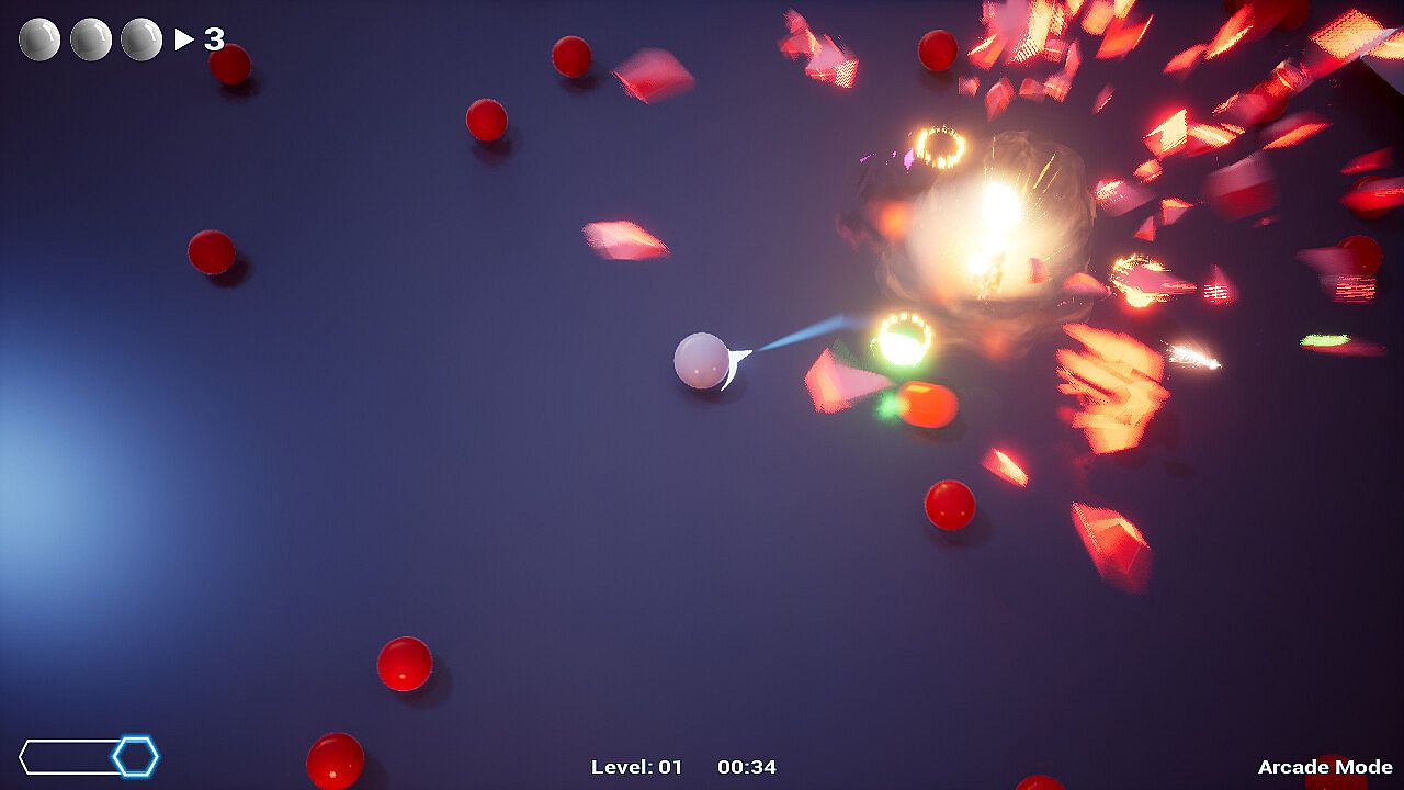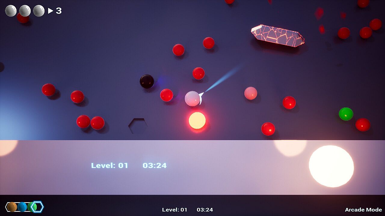 Colliding with a red ball damages it. Shatter it to earn score. Your cue ball has no health bar, so forget about survival—just stay on the offensive. Reach the required Score before time runs out to clear the wave.