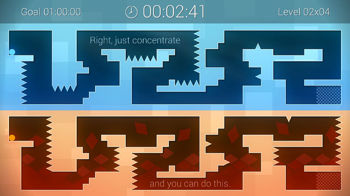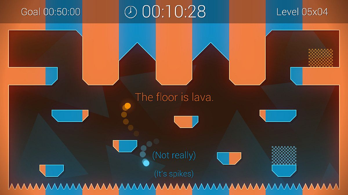 • A funky adaptive music score that ramps up when you do well and chills out if you’re stuck, to help you concentrate. It’s like the game wants you to do well (while it’s throwing spikes at you).