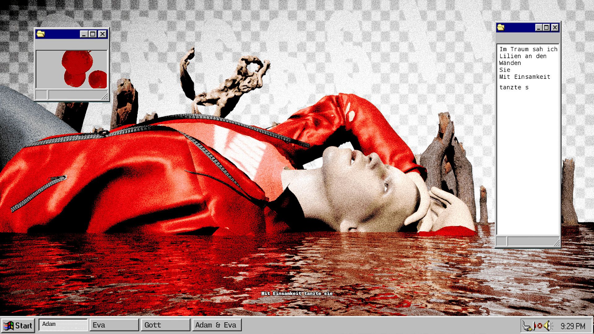 Players navigate digital musical theater scenes in this indie PC experience, blending experimental pop, psychedelic, and techno sounds with virtual theater and space installations. The game recontextualizes a 1920s Yugoslav zenitist drama through four songs: Adam's lament on existence's loneliness, Eve's sensual ode with Balkan pop references, the Abrahamic God's warning in original form, and Adam and Eve's Eden departure. It weaves a kaleidoscope of global landscapes, architecture, and history to explore Abrahamic religions and American pop culture's impact on civilization. This fusion draws from spatial sound installations, video art, musicals, opera, theater, film, and video games, dancing between experiment and pop appeal. New technologies unlock expressive potential in a globalized Eastern European lens, embracing shared USA, Europe, and Eastern values to bridge elite and popular art. Fans of exploratory indie musical theater find a vital, Eros-driven soundscape here.