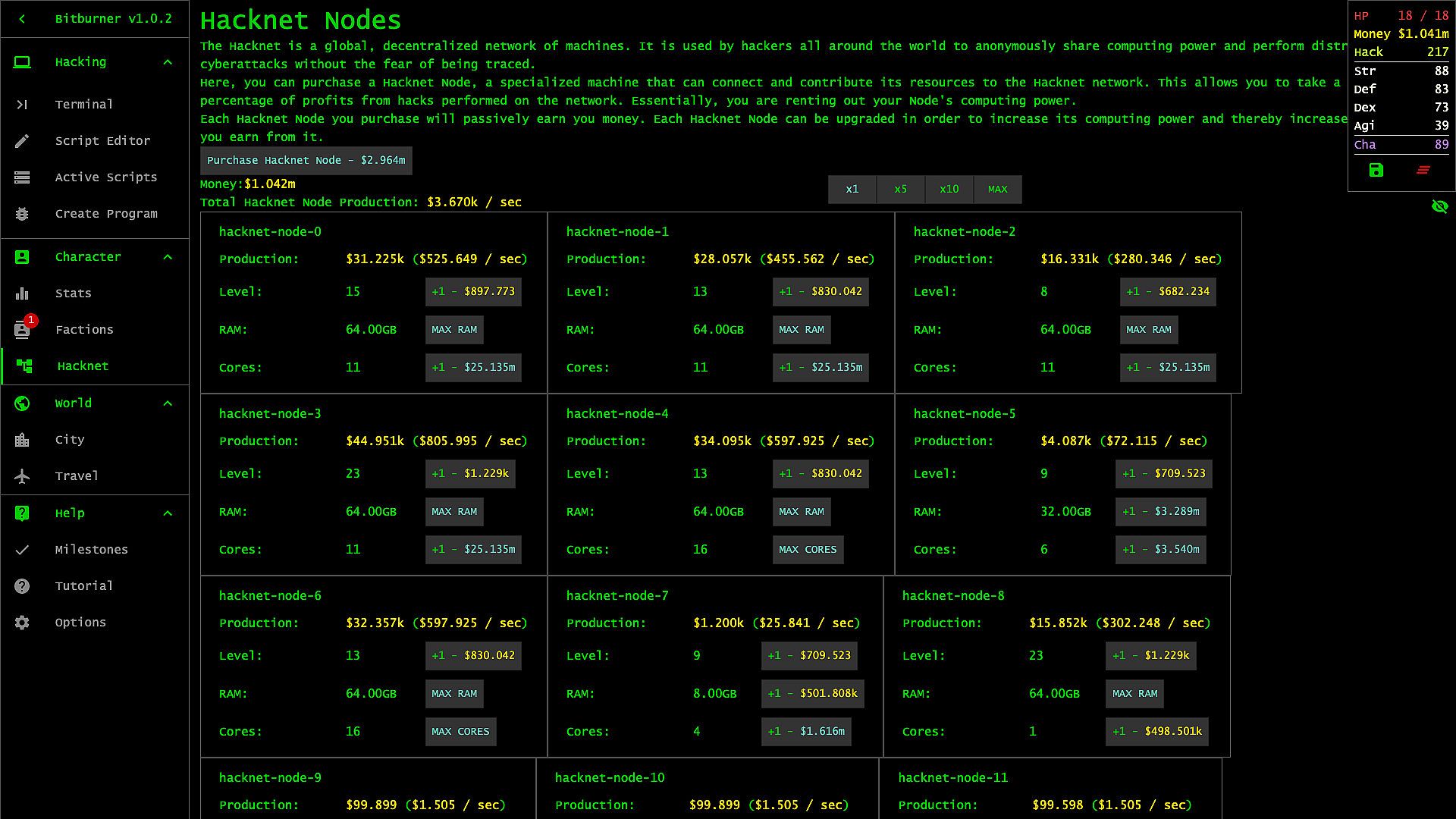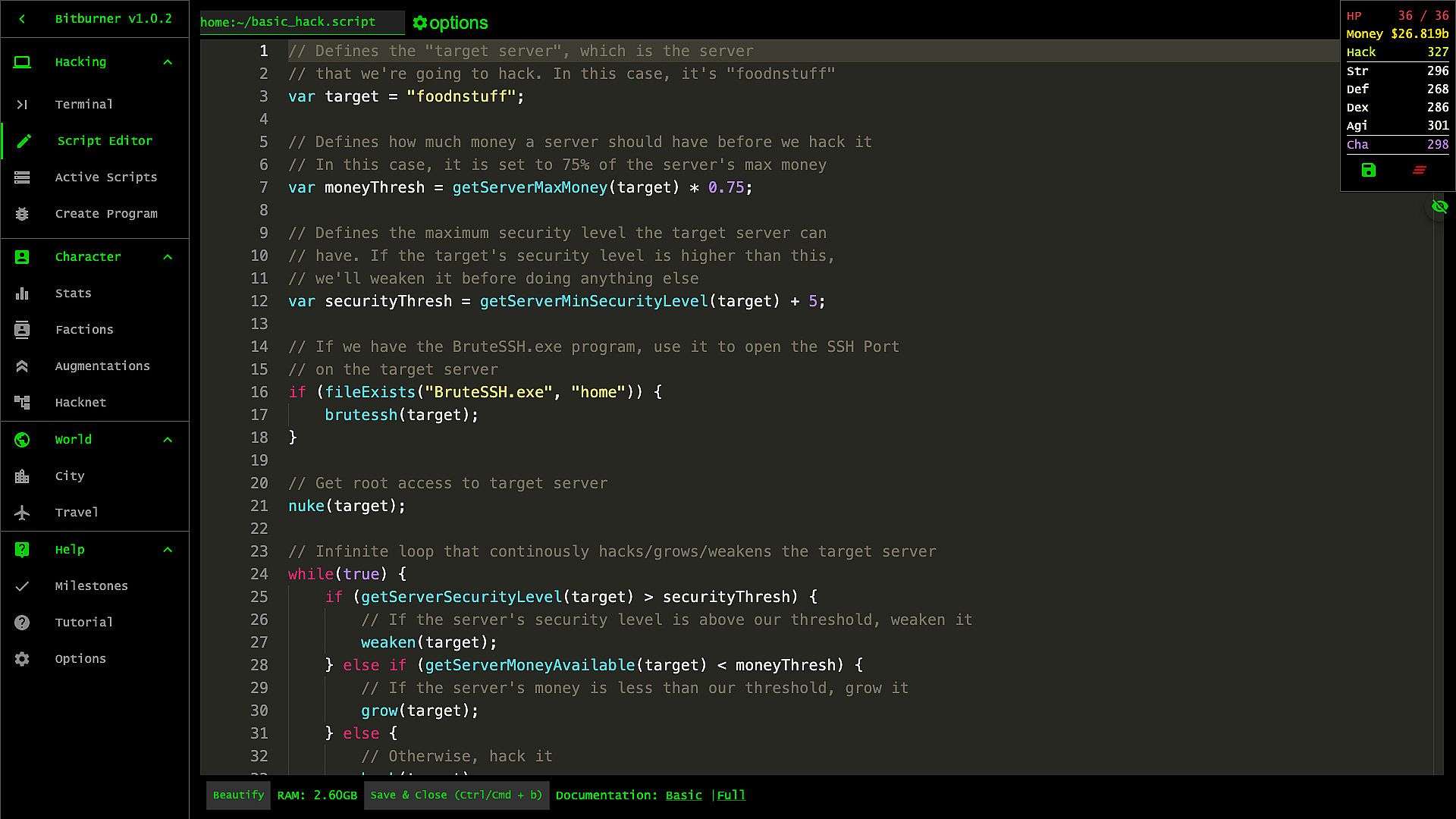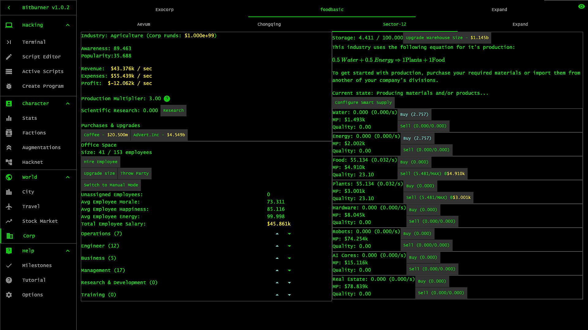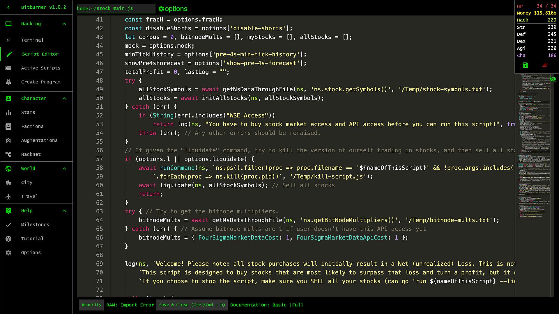 Inspired by games like Else Heart.break(), Hacknet, Uplink, and Deus Ex, Bitburner is a programming-based idle incremental RPG where you, the player, take the role of an unknown hacker in a dark, dystopian world. The game provides a variety of mechanics and systems that can be changed through coding and solved or automated in whatever way you find suitable.