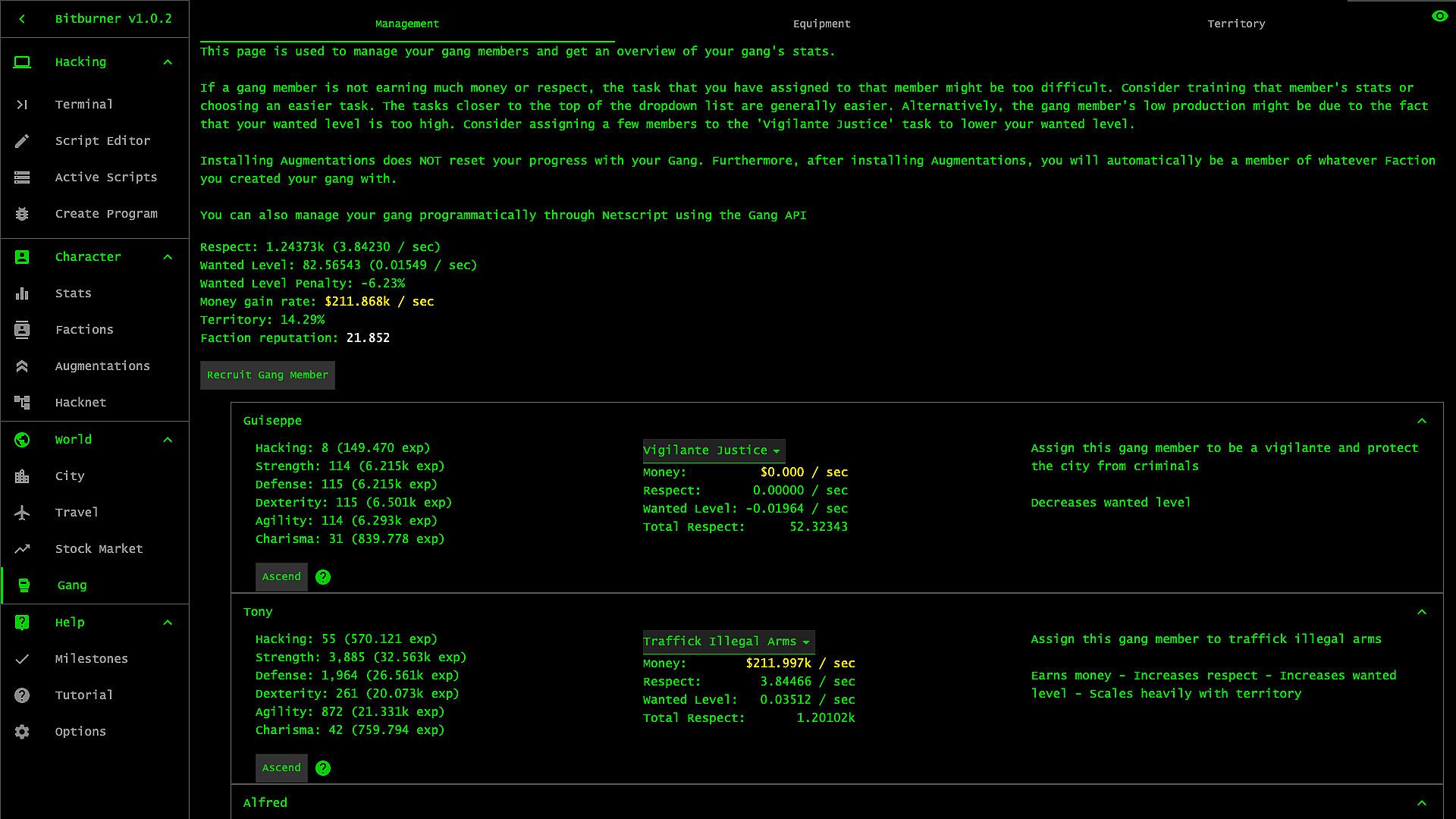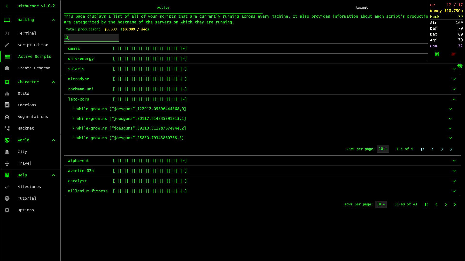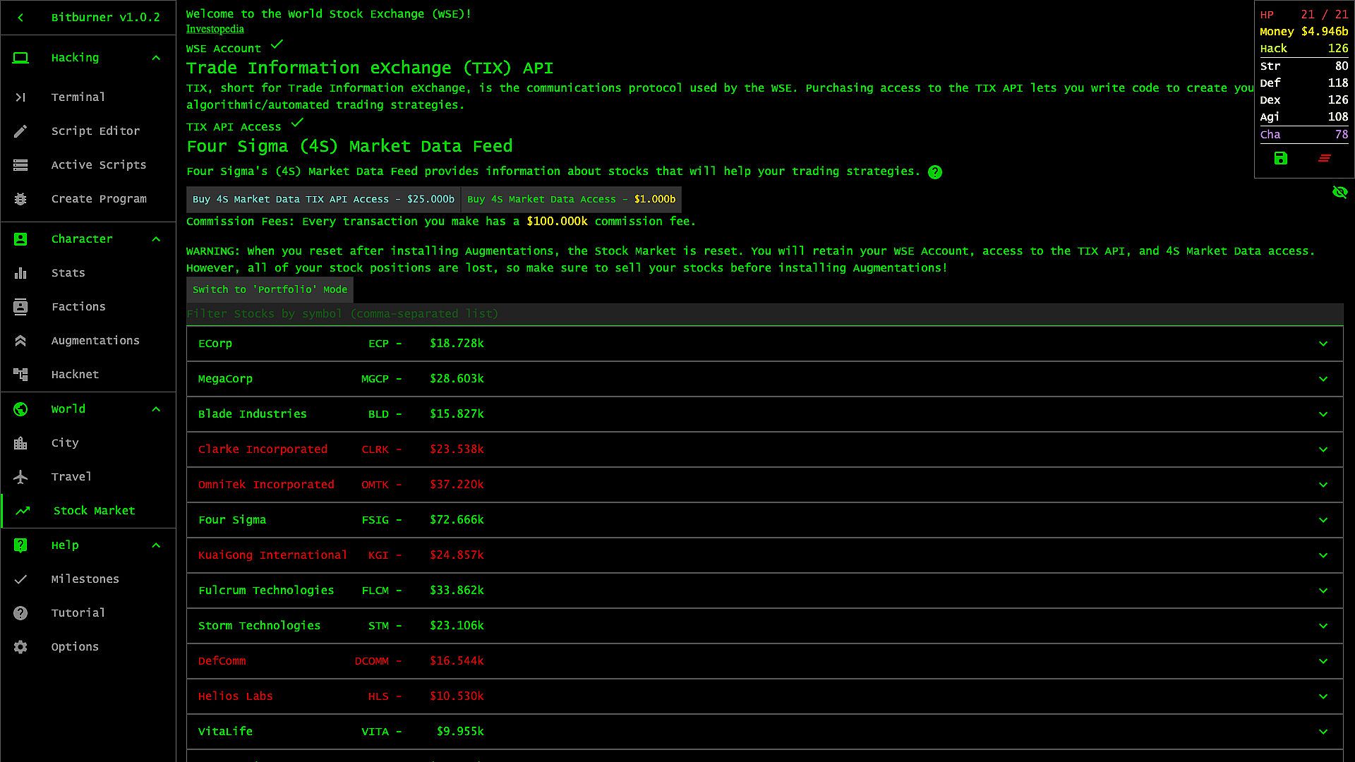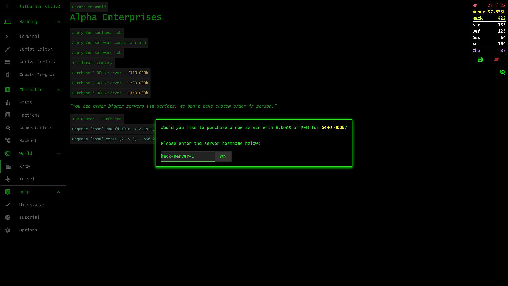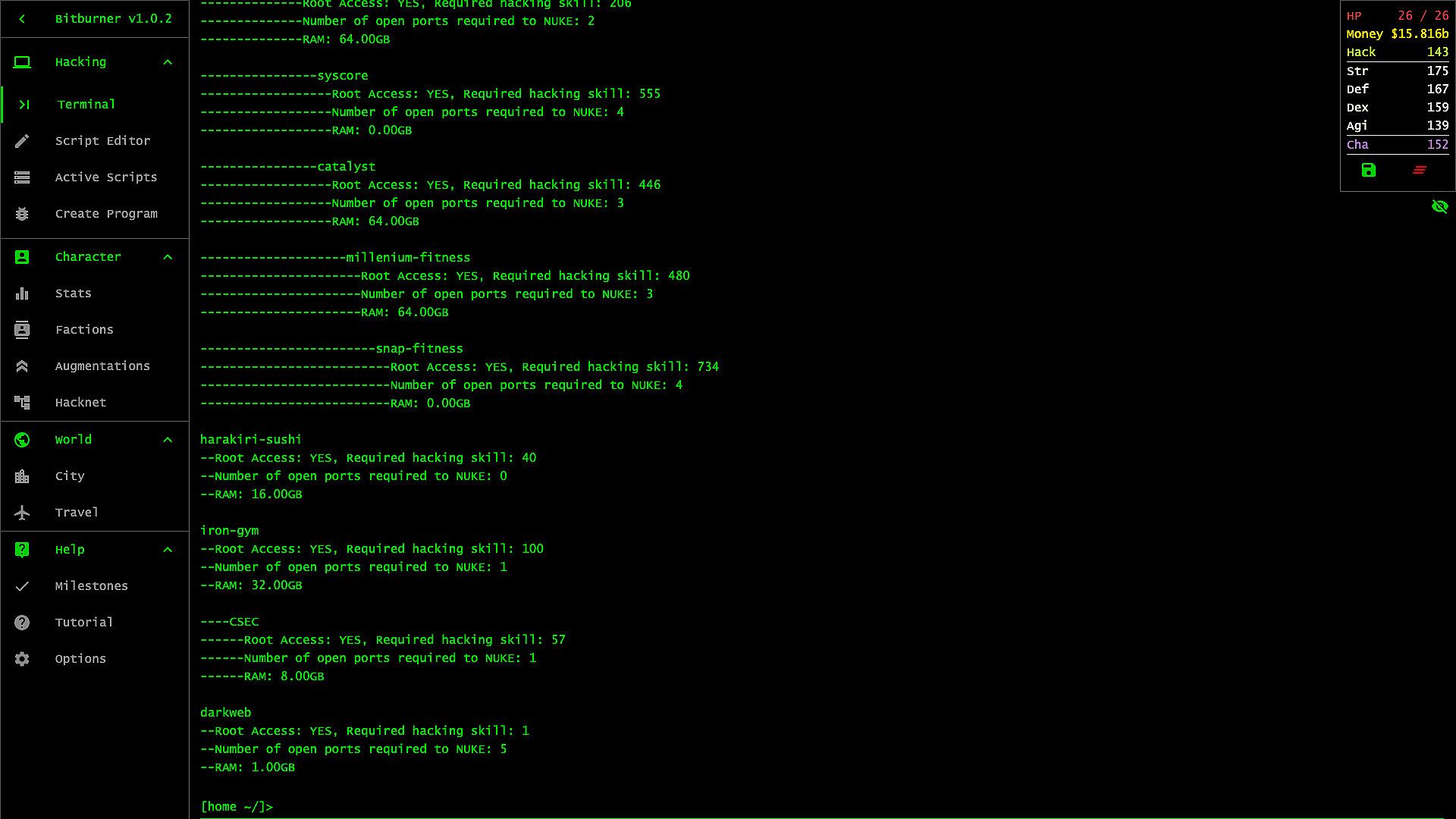 Inspired by games like Else Heart.break(), Hacknet, Uplink, and Deus Ex, Bitburner is a programming-based idle incremental RPG where you, the player, take the role of an unknown hacker in a dark, dystopian world. The game provides a variety of mechanics and systems that can be changed through coding and solved or automated in whatever way you find suitable.