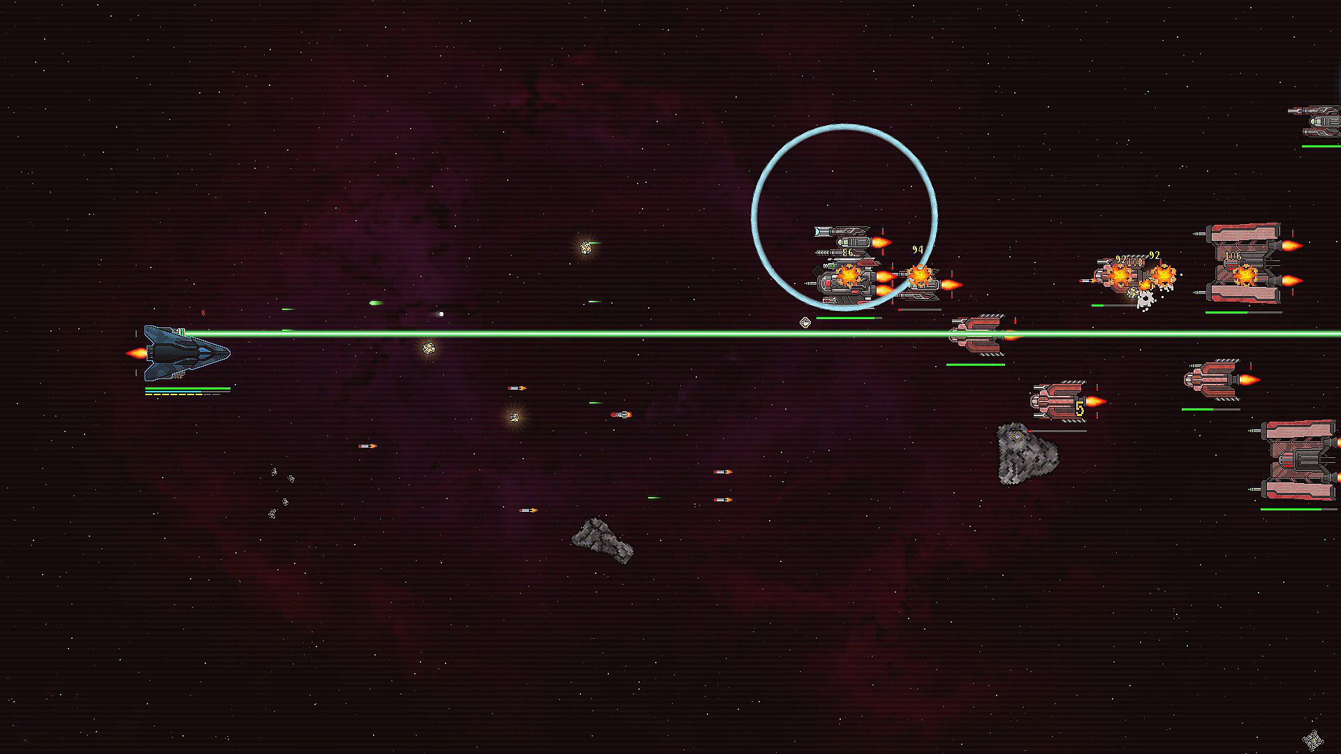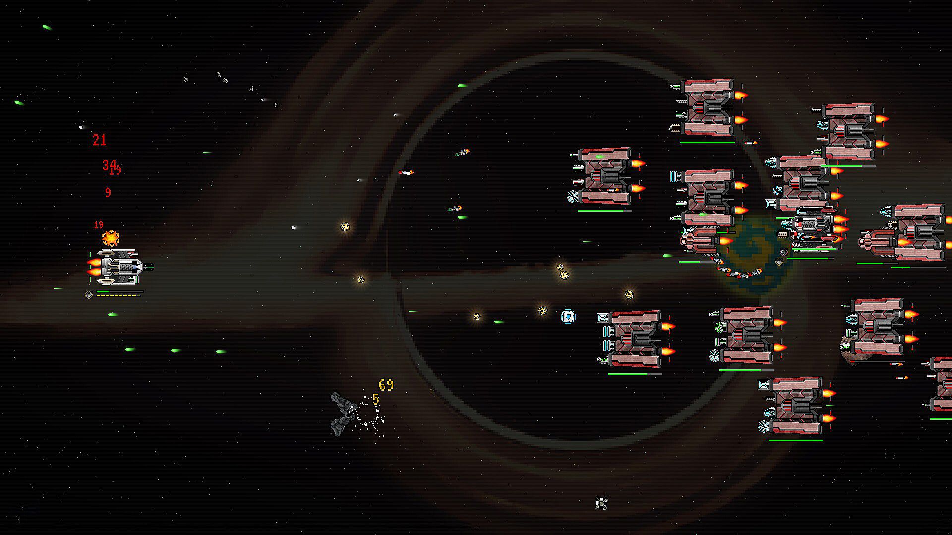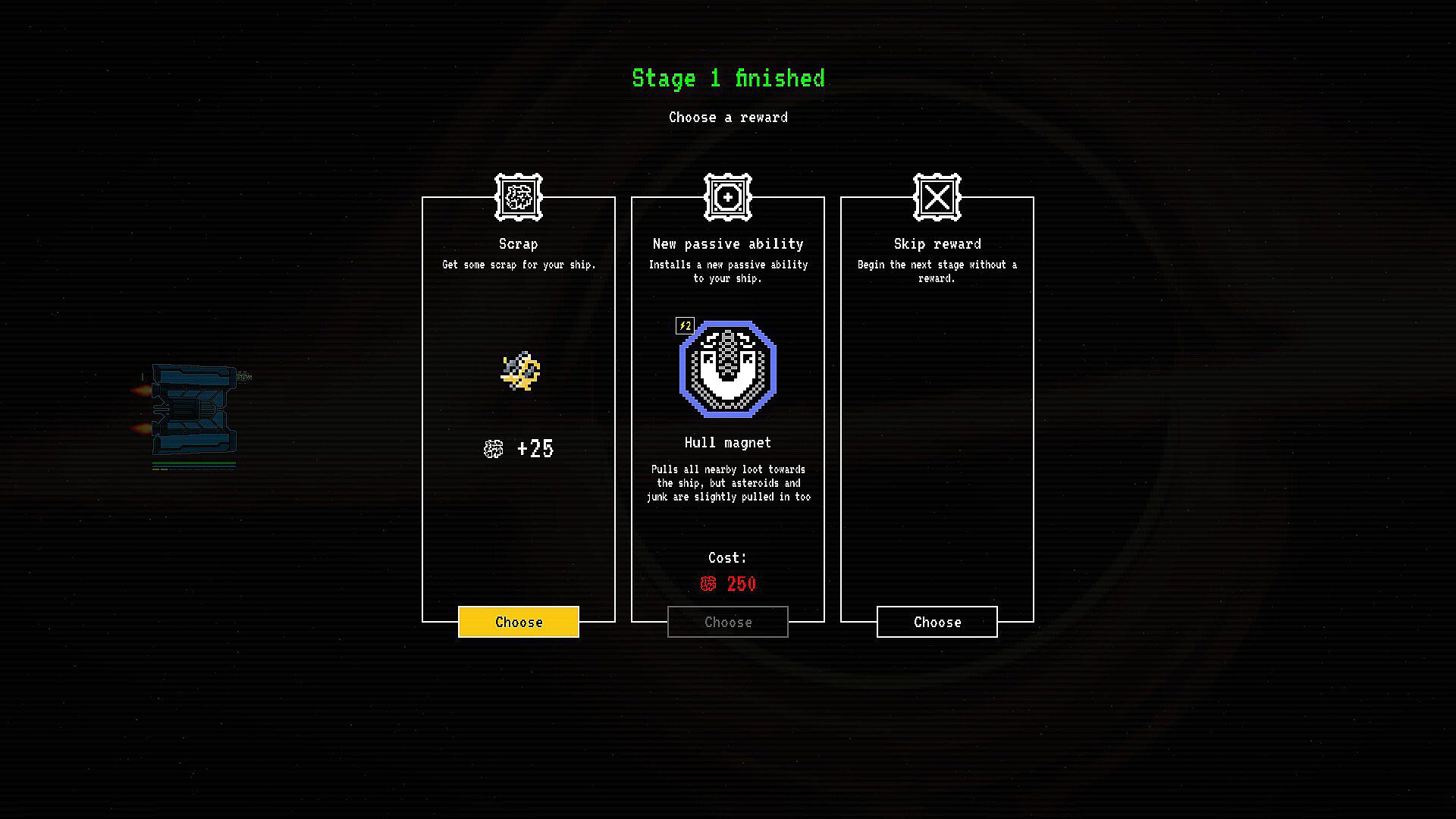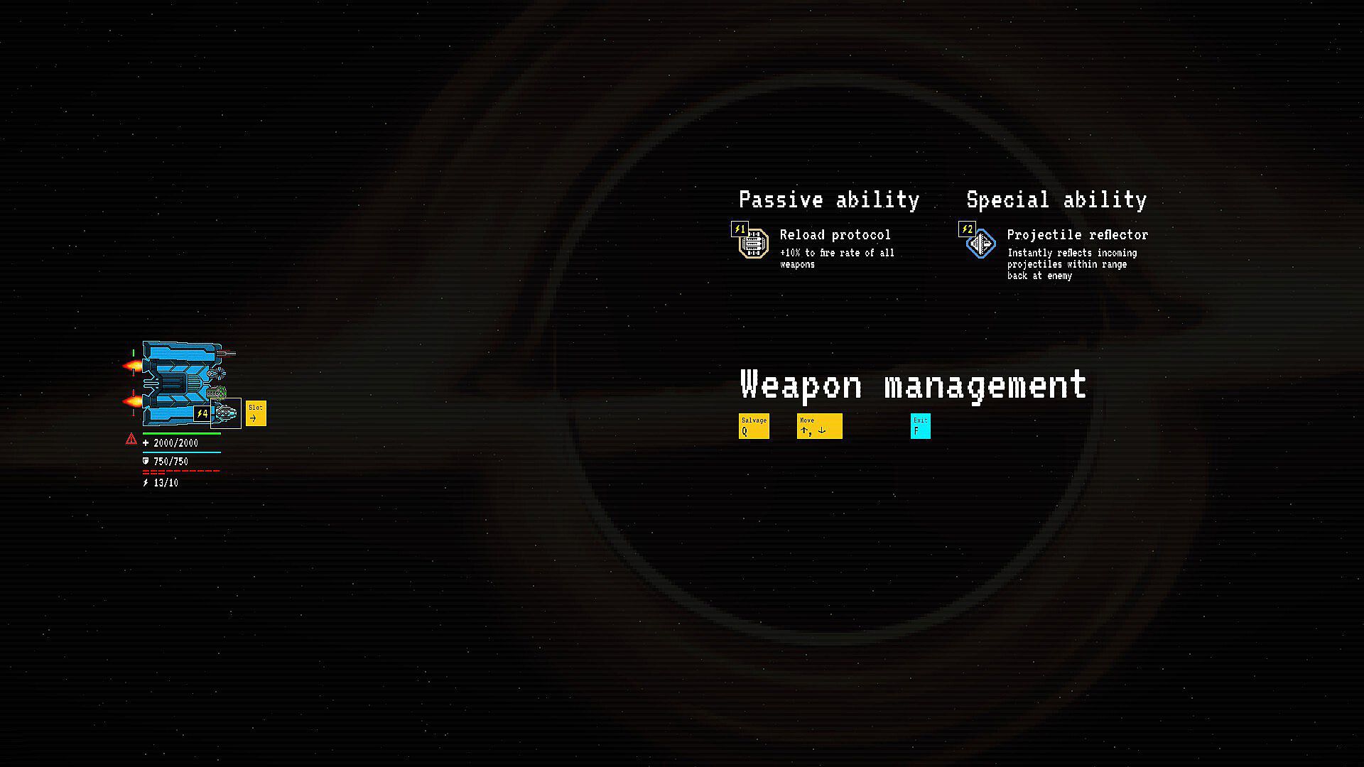 Collect weapons, abilities, and space junk to customize your ship. Mix and match loadouts to suit your style —whether you prefer raw firepower, clever utility, or survival-focused builds.