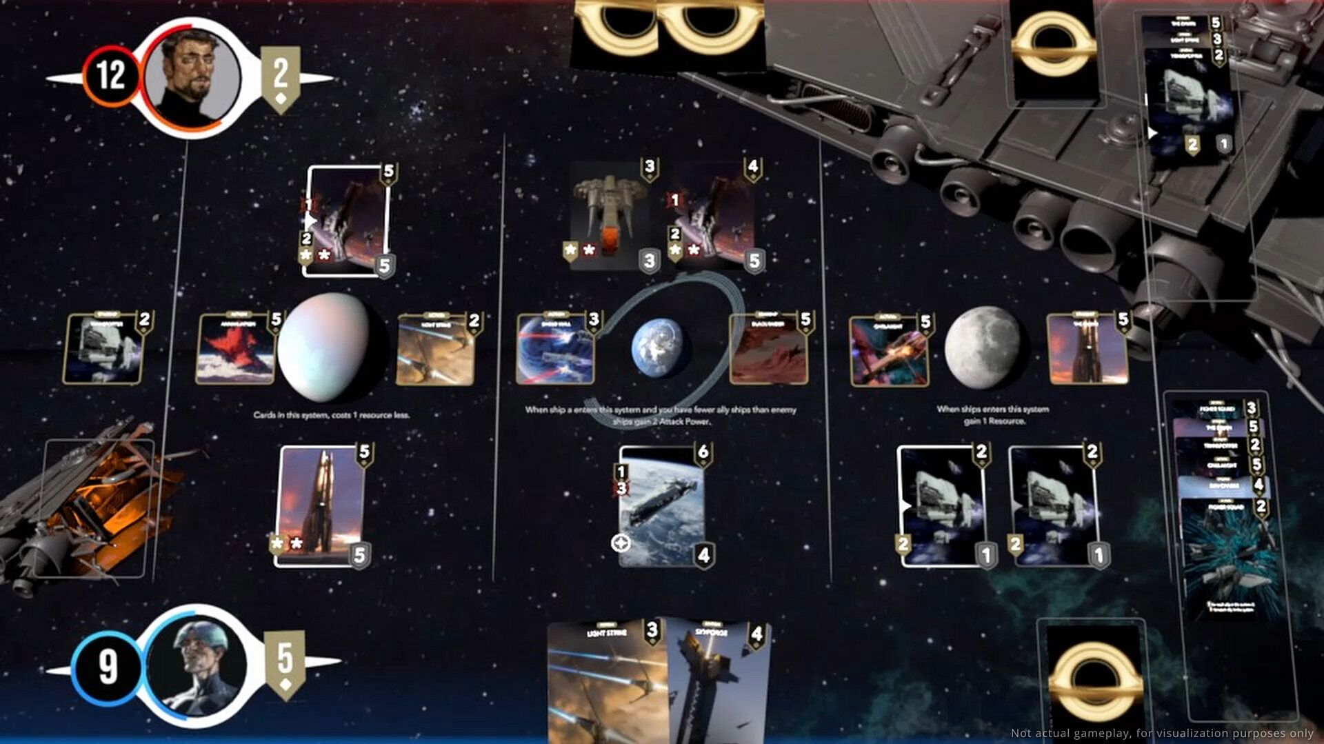 The battlefield in Armada is divided into three systems, acting as strategic lanes where you must carefully place your cards. Ships and stations defend your systems and allow you to acquire new cards, while also positioning you to attack the opponent. Success hinges on smart maneuvering—knowing when to attack, defend, or shift your forces. Ships can warp between systems, enabling you to rebalance the board and change strategies mid-game. Victory is achieved by reducing your opponent’s life points to zero, which requires breaking through enemy defenses and attacking directly.