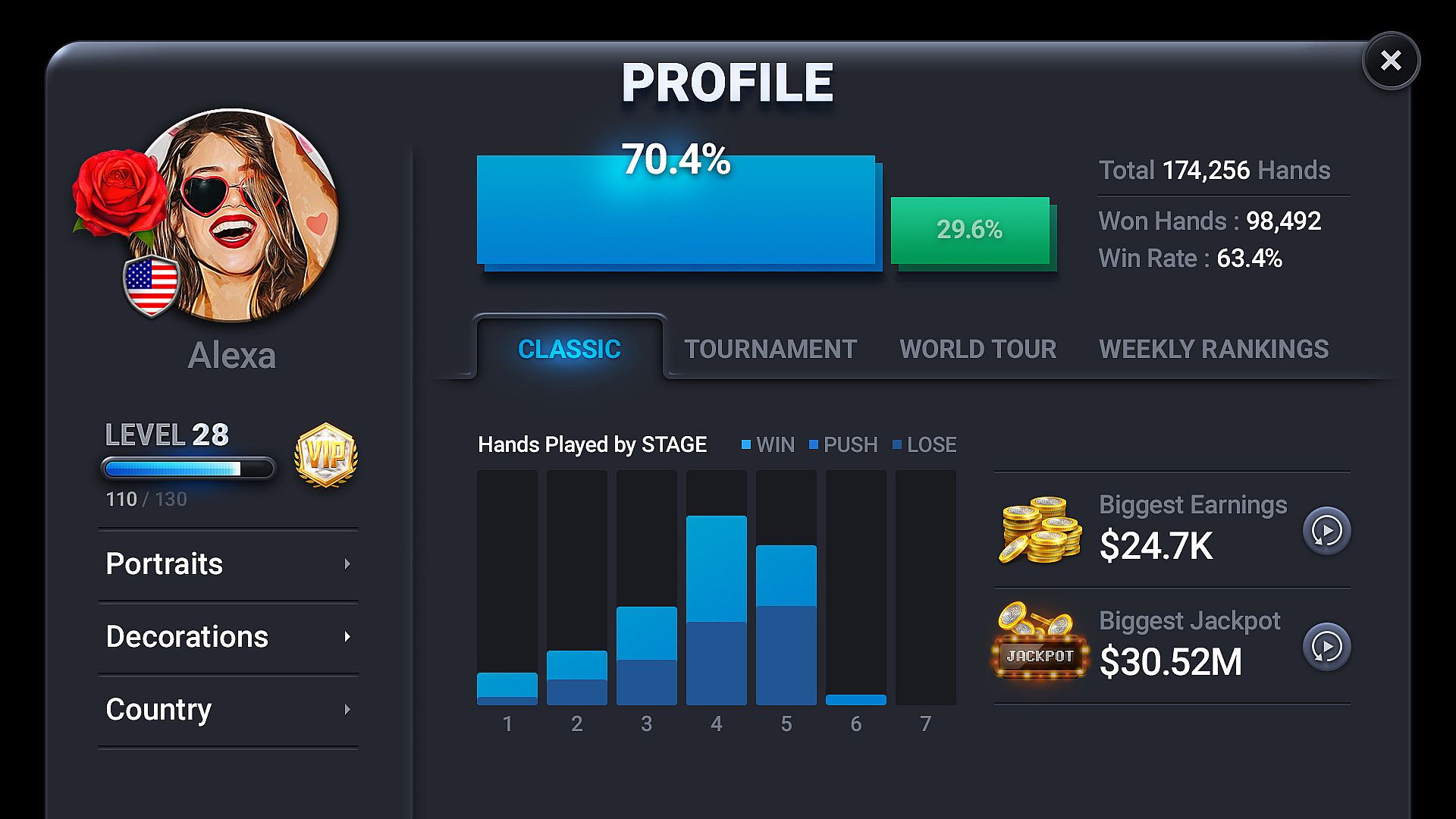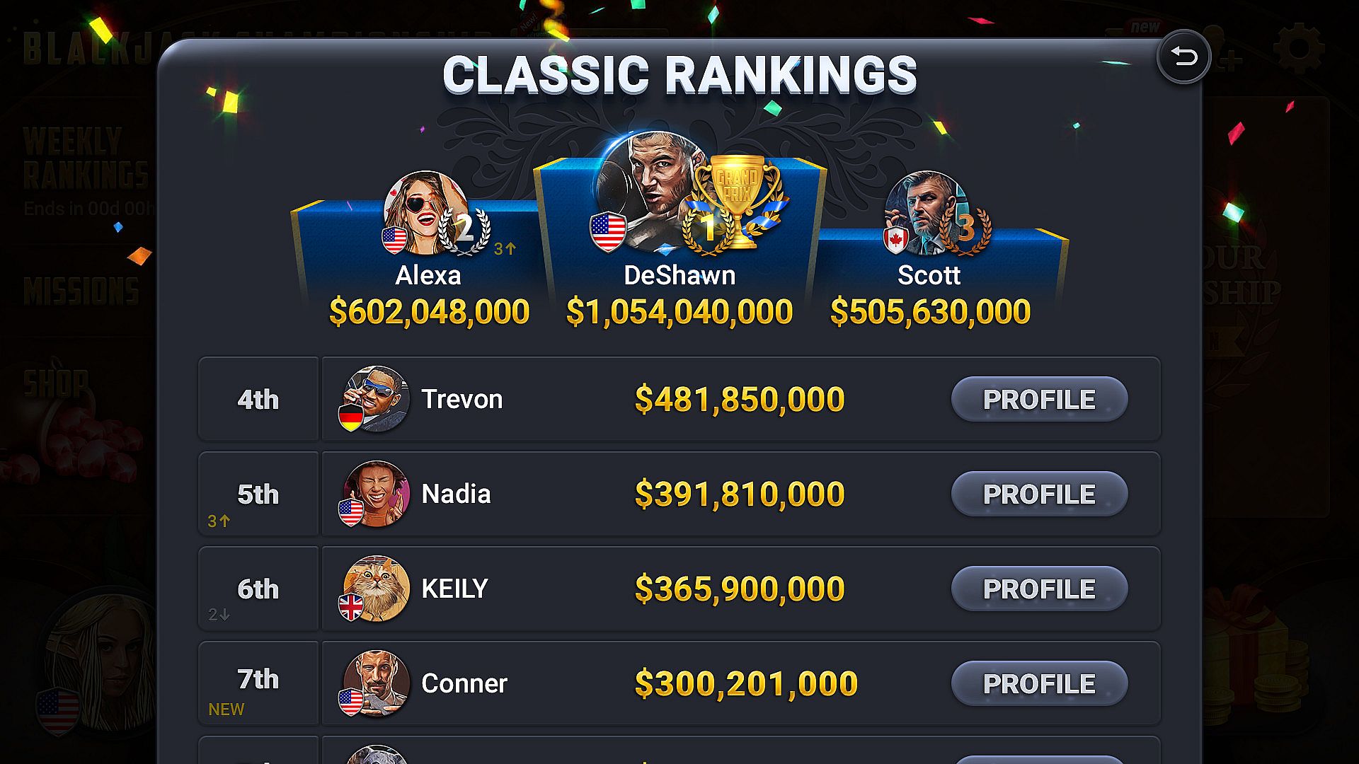 • WEEKLY RANKINGS : Compete with outstanding Blackjack players throughout the world in real time and be the world champion!