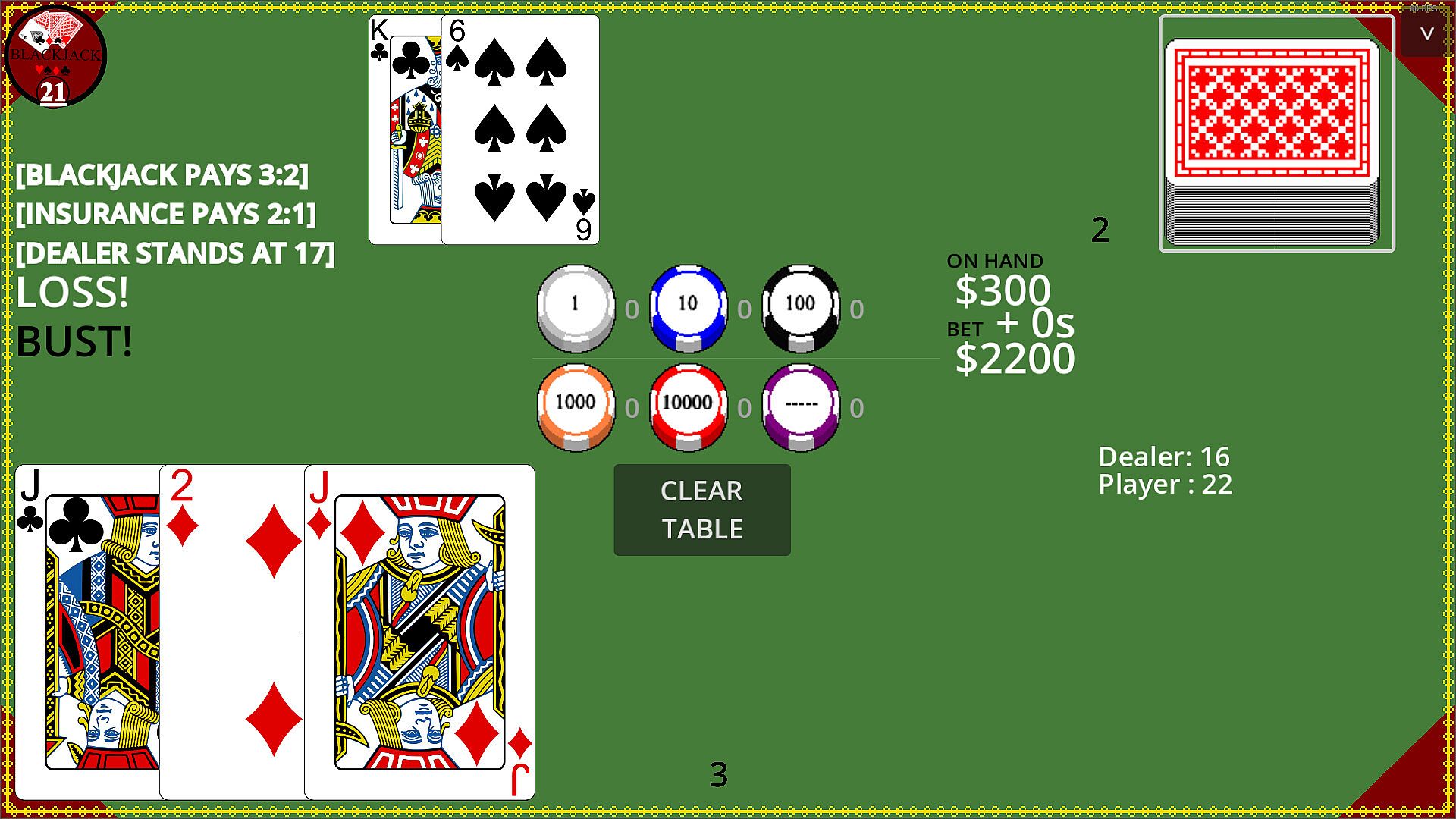 Standard blackjack rules, game can be played with 1 to 10 decks at a time (with the default being 4).