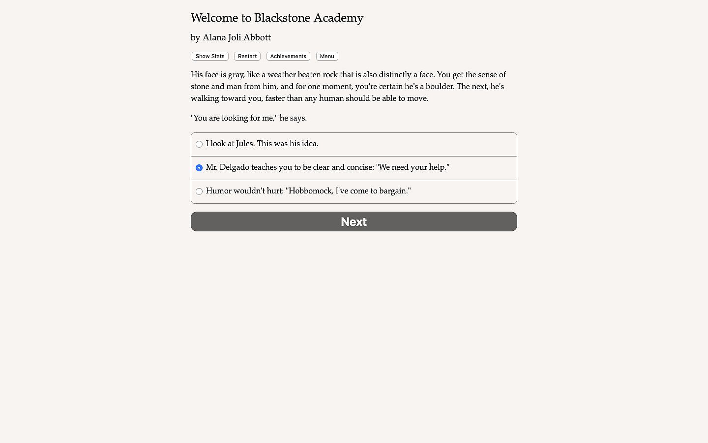 Blackstone Academy for the Magical Arts is a fast-paced 188,000-word interactive YA fantasy novel by Alana Joli Abbott, where your choices control the story. It's entirely text-based, without graphics or sound effects, and fueled by the vast, unstoppable power of your imagination.
