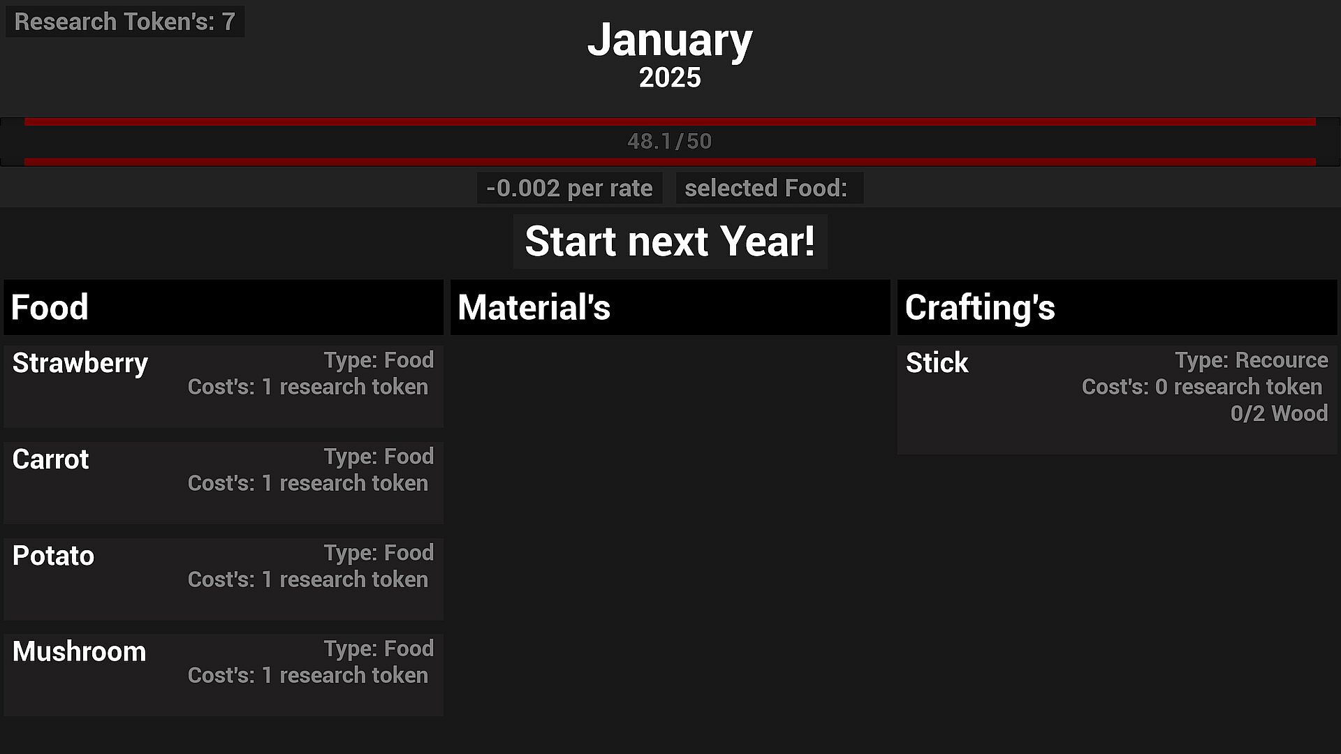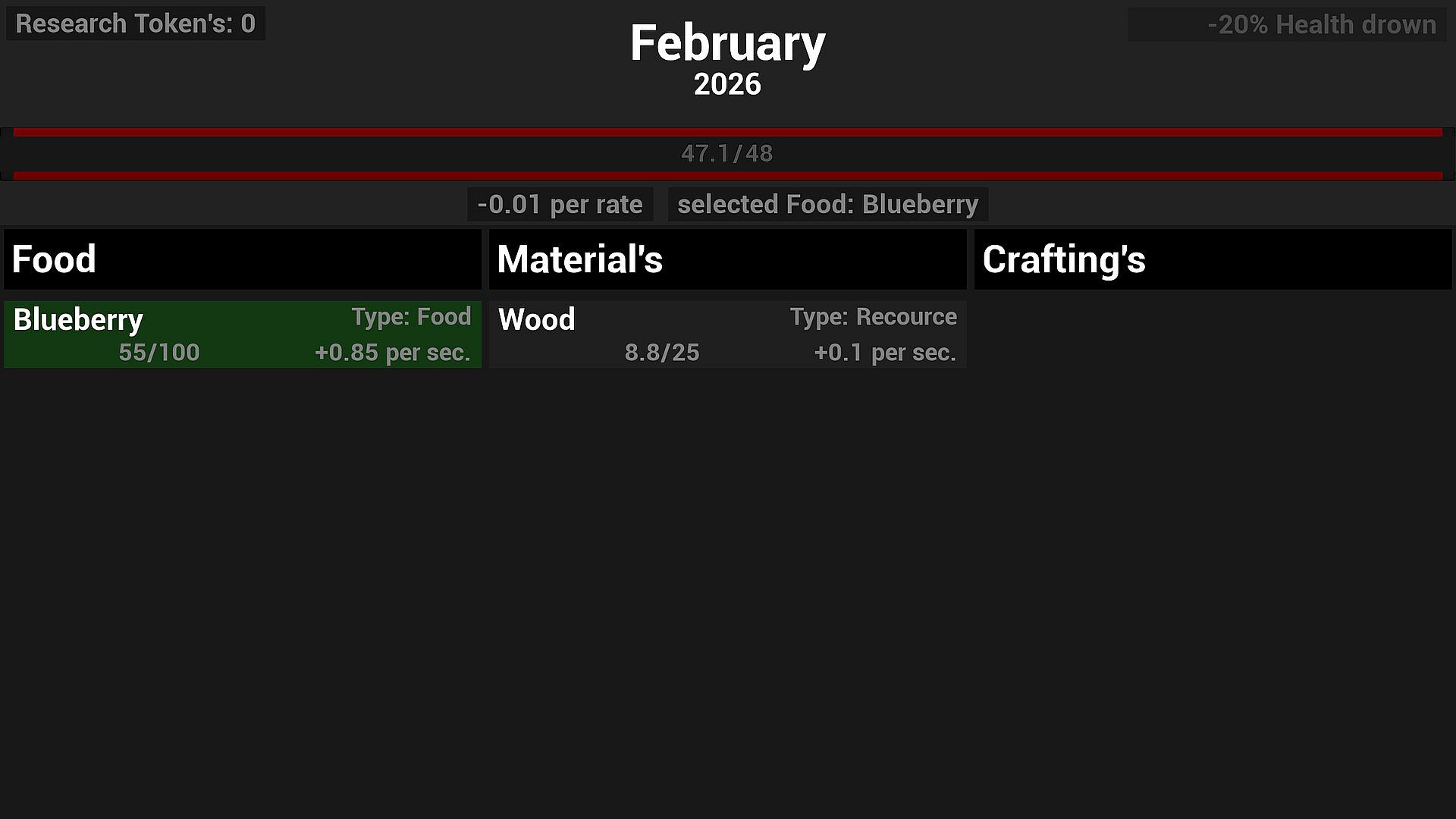 A minimalist Roguelike × Idle: click a tile to mine a resource - while your lifeline constantly drains. Food keeps you alive, materials fuel your research. Each month the drain accelerates. At the end of every year you choose 1 of 3 milestone cards and spend your Research Points in a year-end shop to reshape your run. How long can you keep the line from going flat?