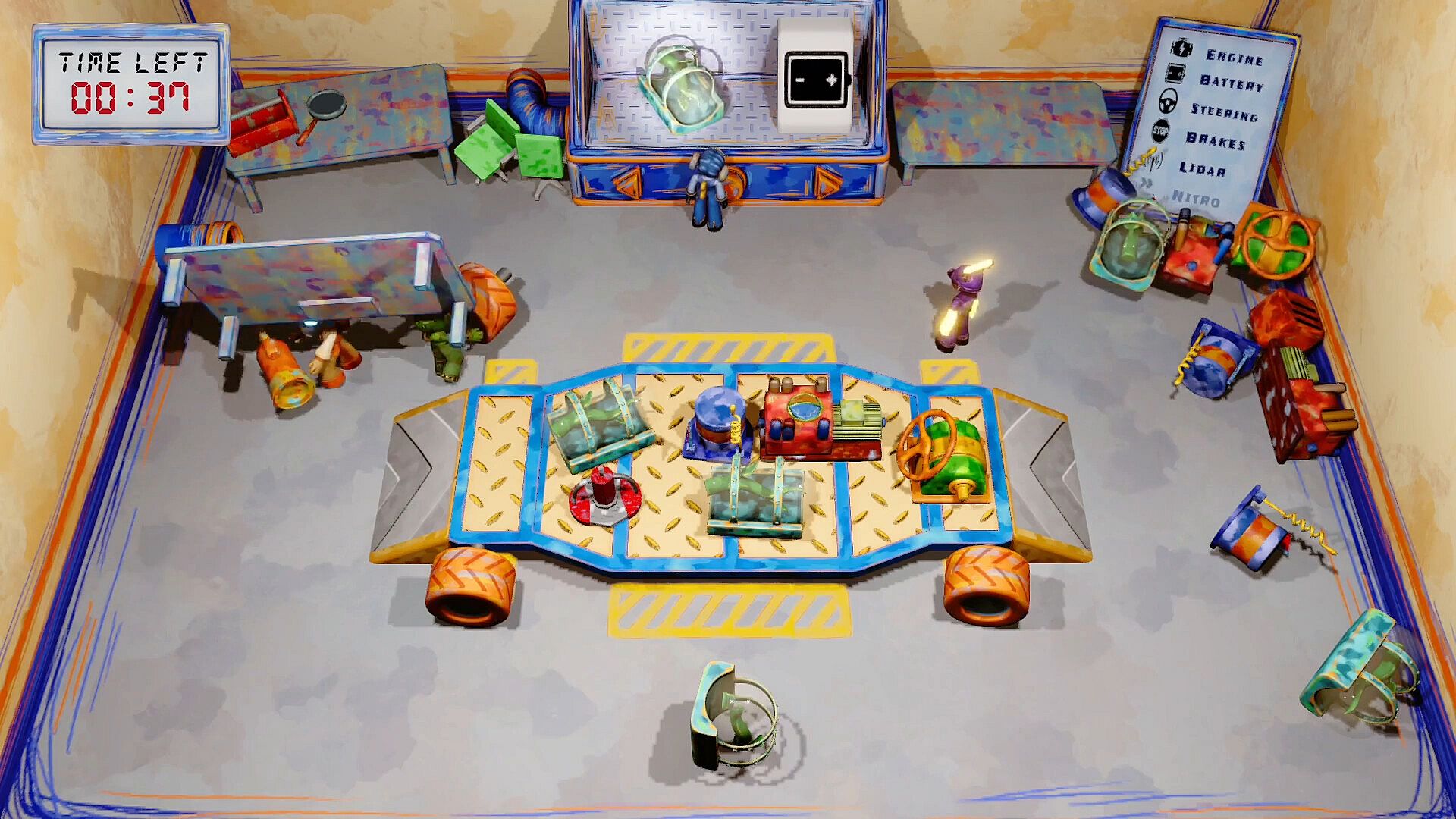 The vehicles are built out of different components. Use the ones that lie around and print everything else with the powerful part printer. Can you get all the necessary parts together to have a functioning vehicle? If you forgot the brakes, you better be careful on the track! Or maybe even the steering? There is little chance you make it past the first curve.