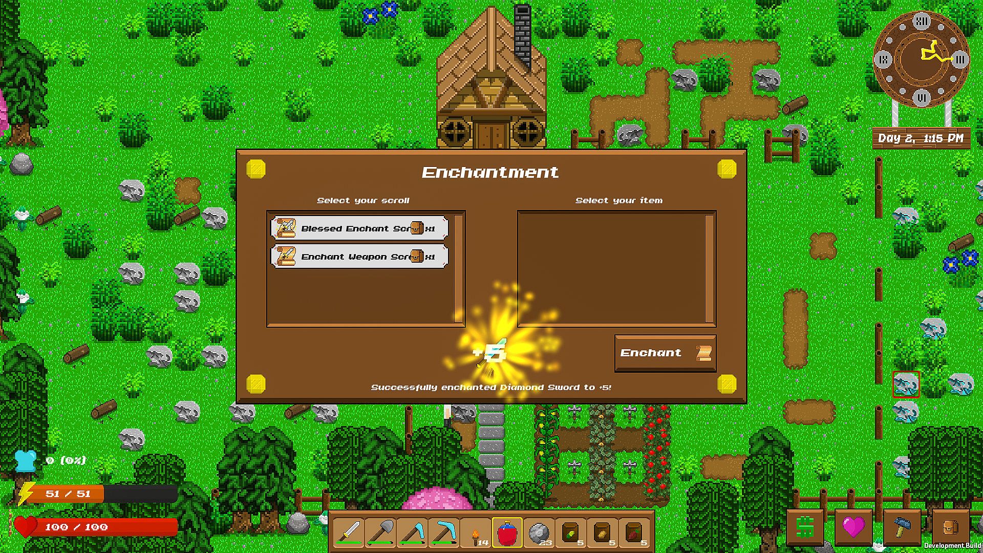 • Enchantment. High quality items are key in everything you do in Blissful Acres. Better armor will save you from the depths. Better tools will allow you to manipulate the landscape quickly and effectively. In Blissful Acres, there is no ceiling! You can infinitely enchant your items!