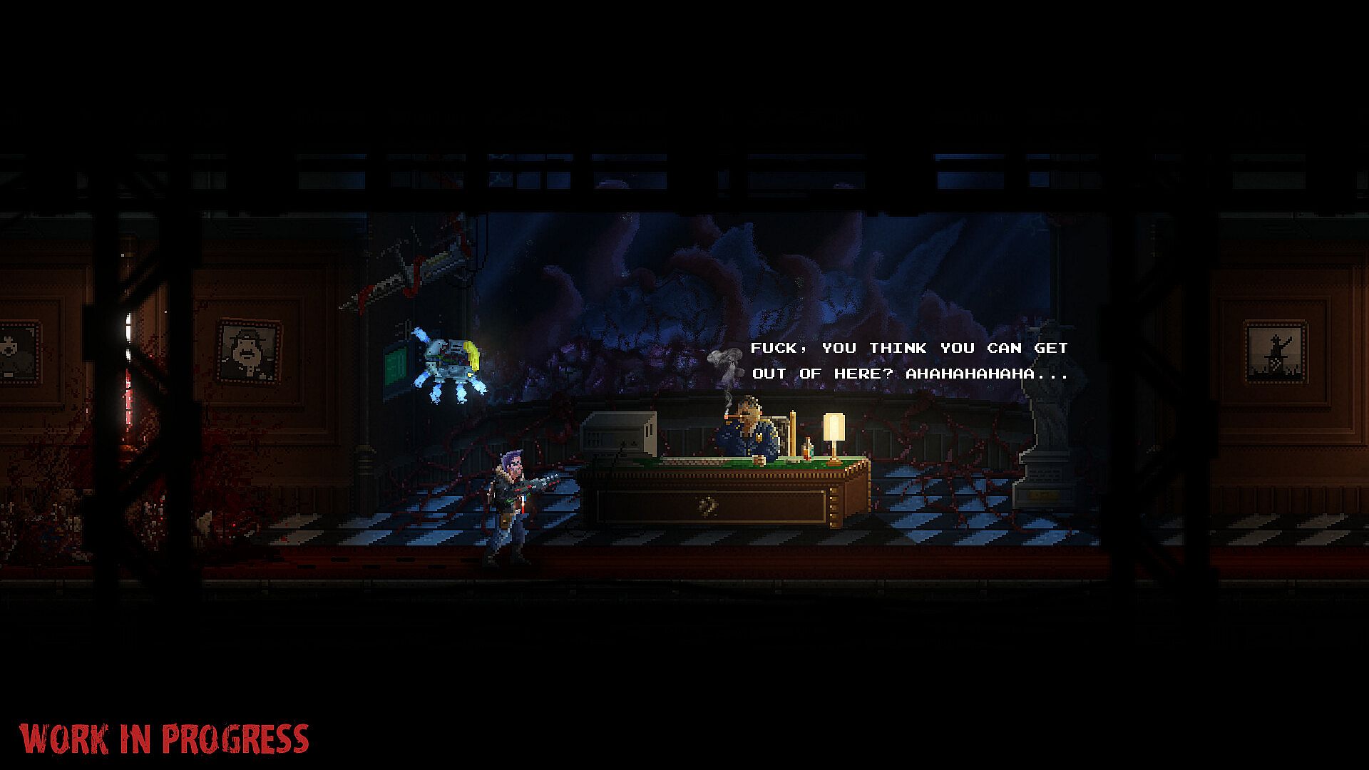 Block 17 is not just a run-and-gun platformer – we want to tell a story, reveal the personalities of our characters, and breathe life into this world. When you're surrounded by darkness and fear, the best way to fight terror is with humor: certain situations, dialogues, or characters break the tension with cynical, darkly funny moments.