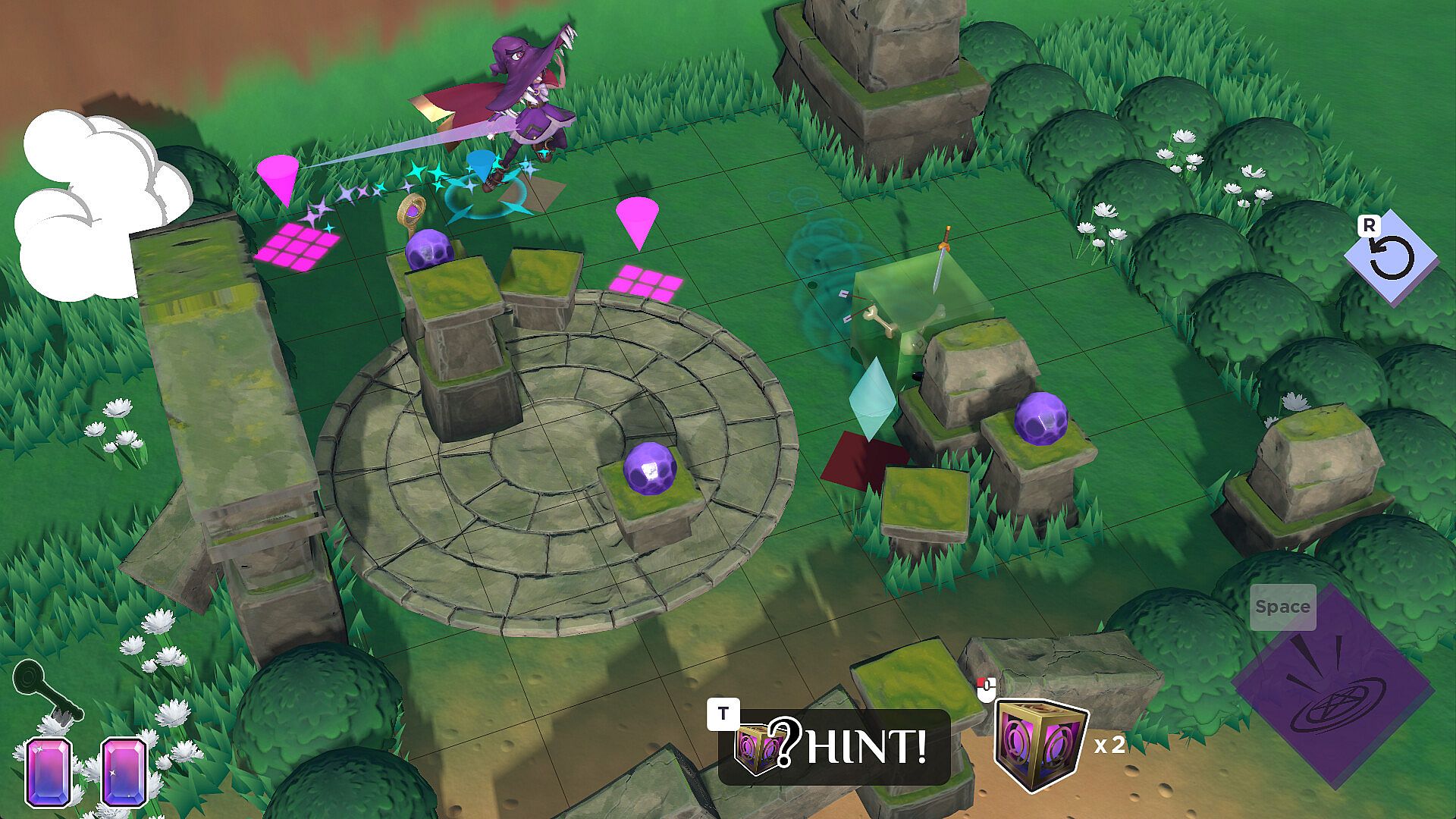 Play through fun and challenging maze-like levels by floating through the space, and not stopping until you reach a solid surface. Defeat or avoid enemies, and various arcane mechanisms, don’t forget to utilise each witch’s special abilities.