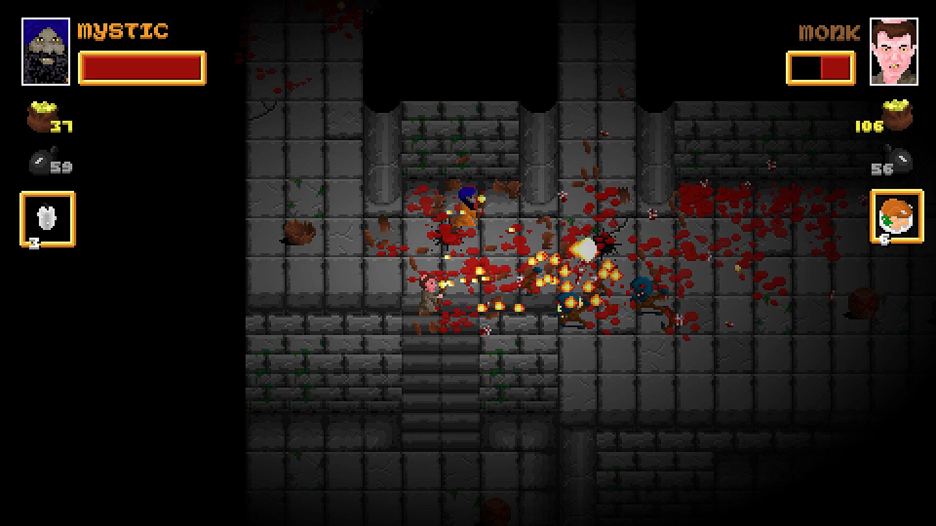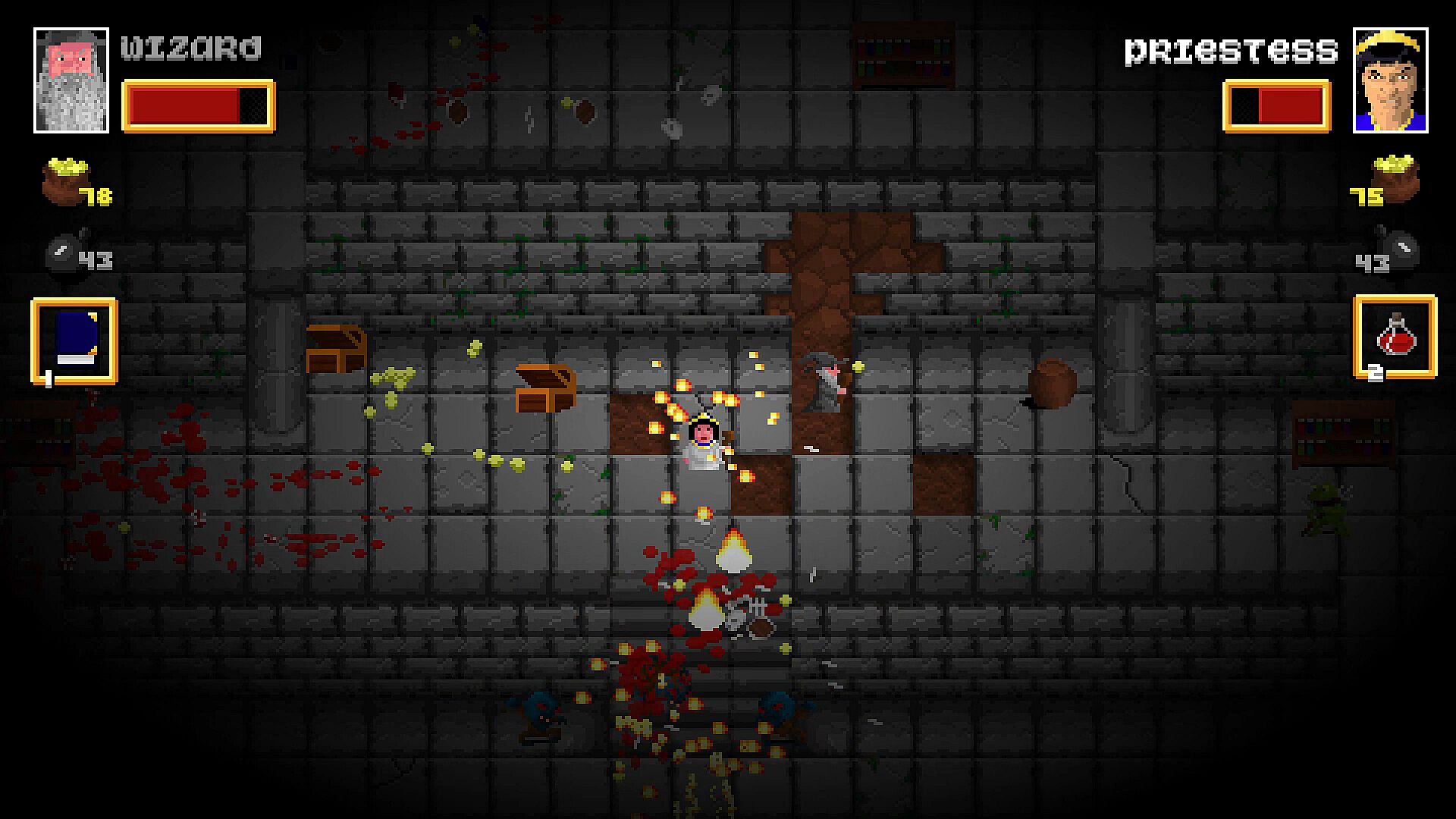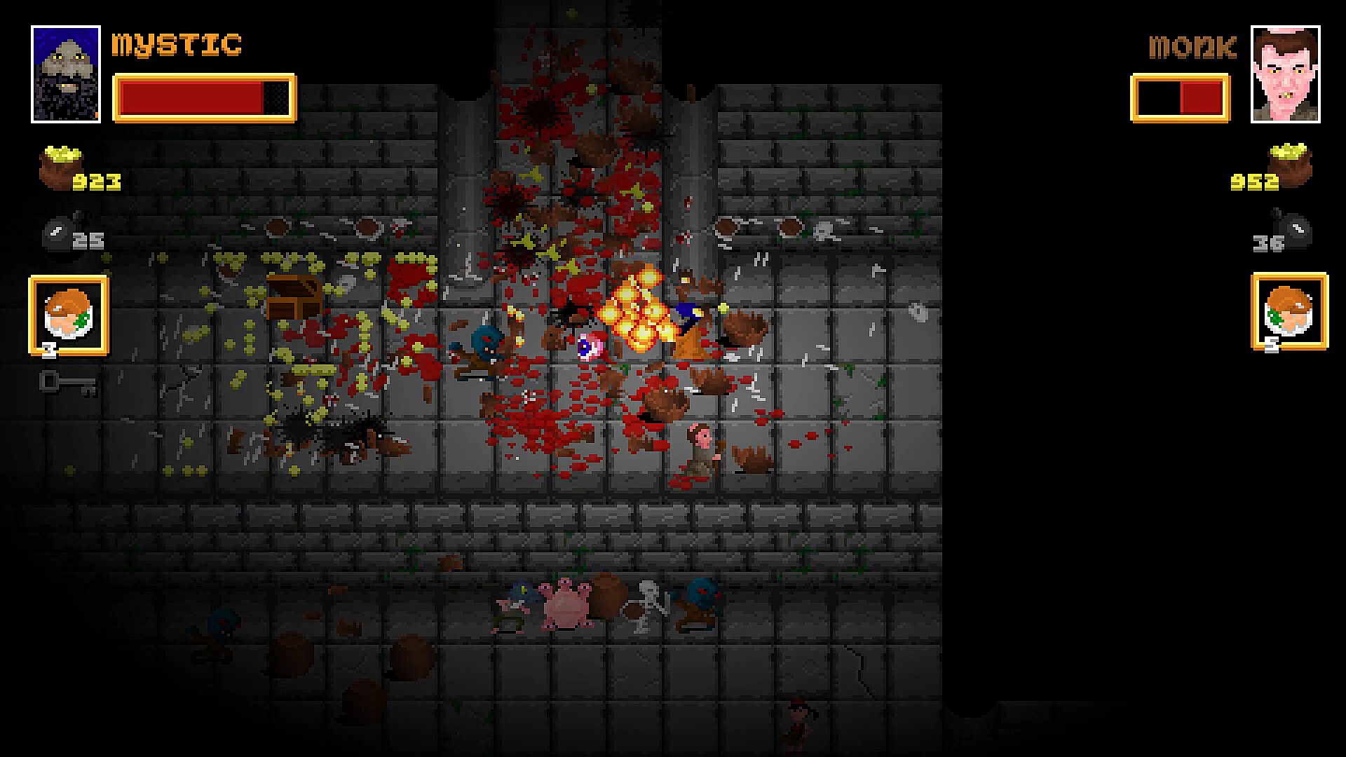 Pick from six characters with unique stats to unleash fireballs, bombs, and an arsenal of potions, spells, and magical items, shredding monsters in fountains of gore. Explore dungeons with fluid, eight-way movement and spend hard-earned coins on stat boosts in shops. Join a friend in two-player co-op to dominate the blood-soaked battlefield.