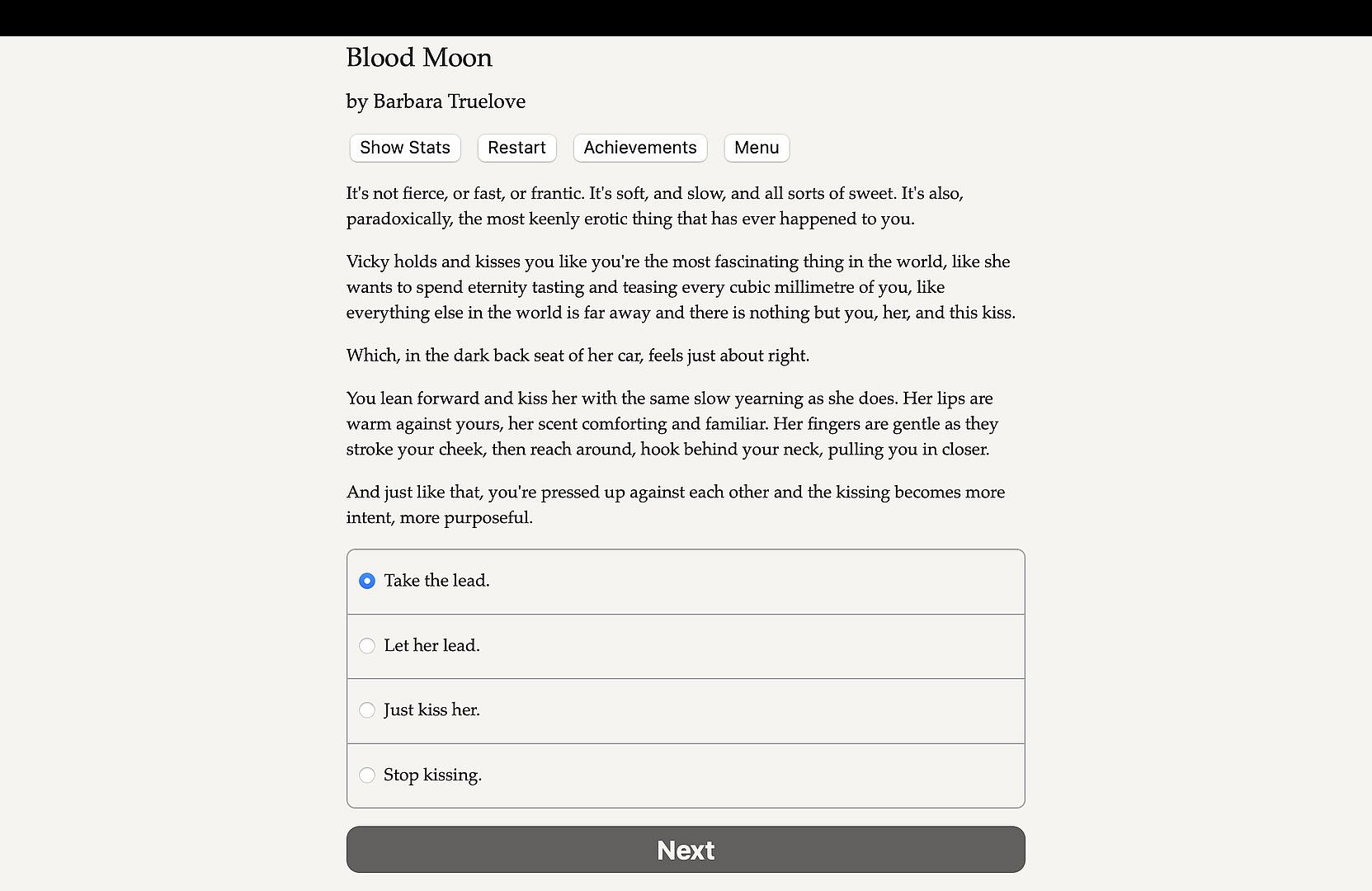 Blood Moon is a 445,000 word interactive novel by Barbara Truelove. It’s entirely text-based, without graphics or sound effects, and fueled by the vast, unstoppable power of your imagination.