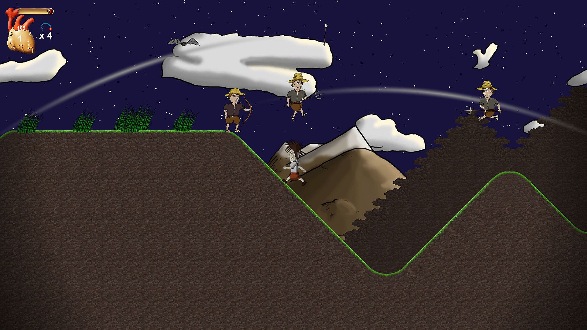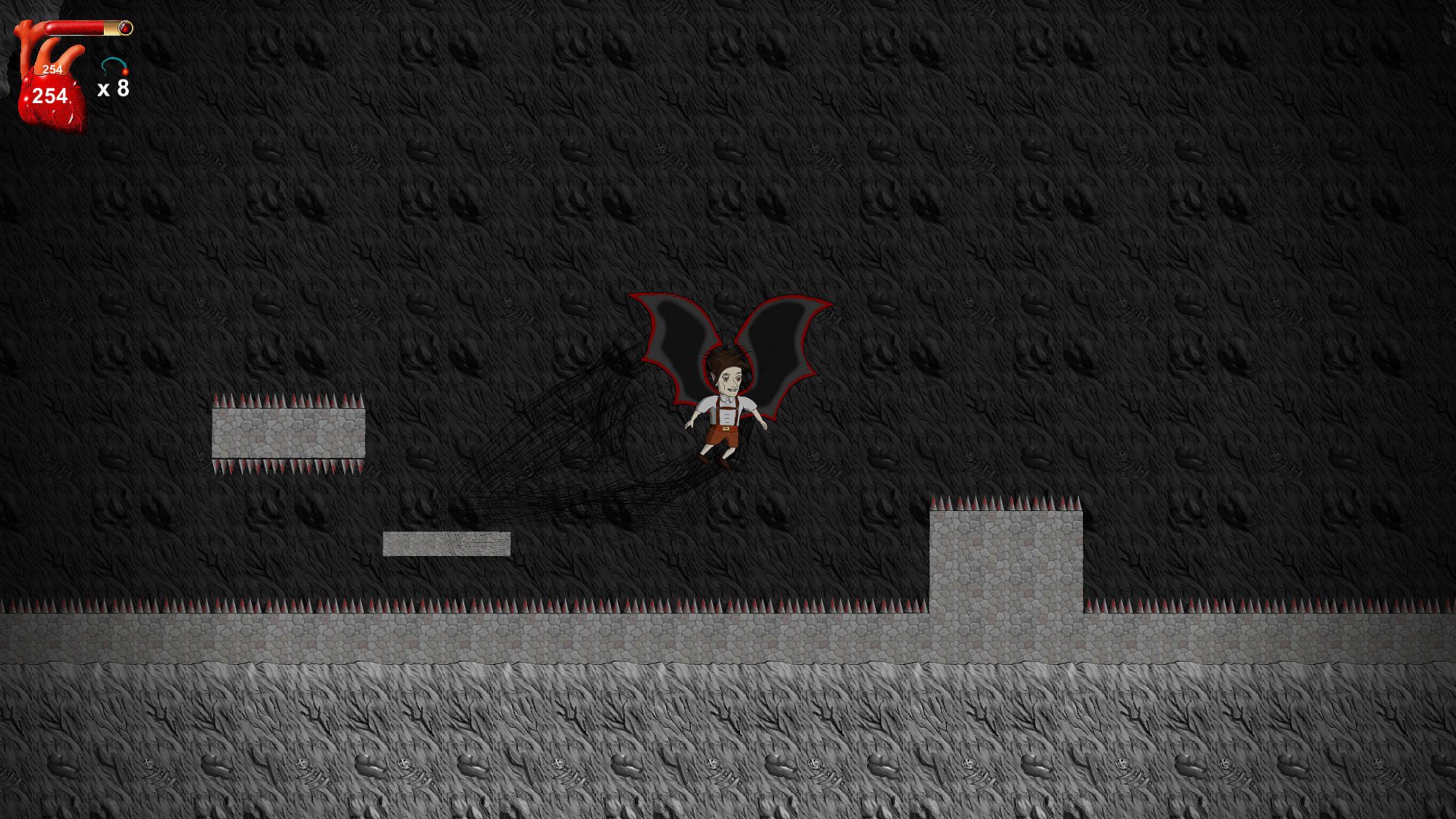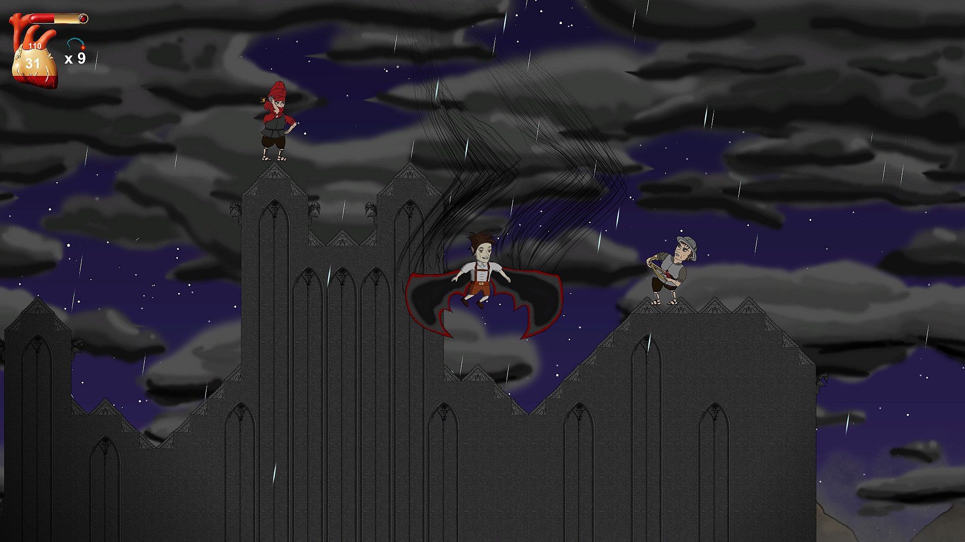Control Layne, who wakes up and finds out that he has been bitten by a vampire. A dark voice whispers to Layne in his head and teaches him how to defend himself with magic and how to get stronger! Now Layne will have to face his creator, who lives in his castle on the mountains. A random set of bosses will challenge Layne on his way to the top, like the Black Mage, who can help you to become human again. Layne might be haunted by the old castle ghost, who eventually transforms into his old rotten body. Sometimes a vampire hunter will show up, to challenge Layne to a duel. An Assassin might stop Layne and lets him dance to avoid a rain of bombs.