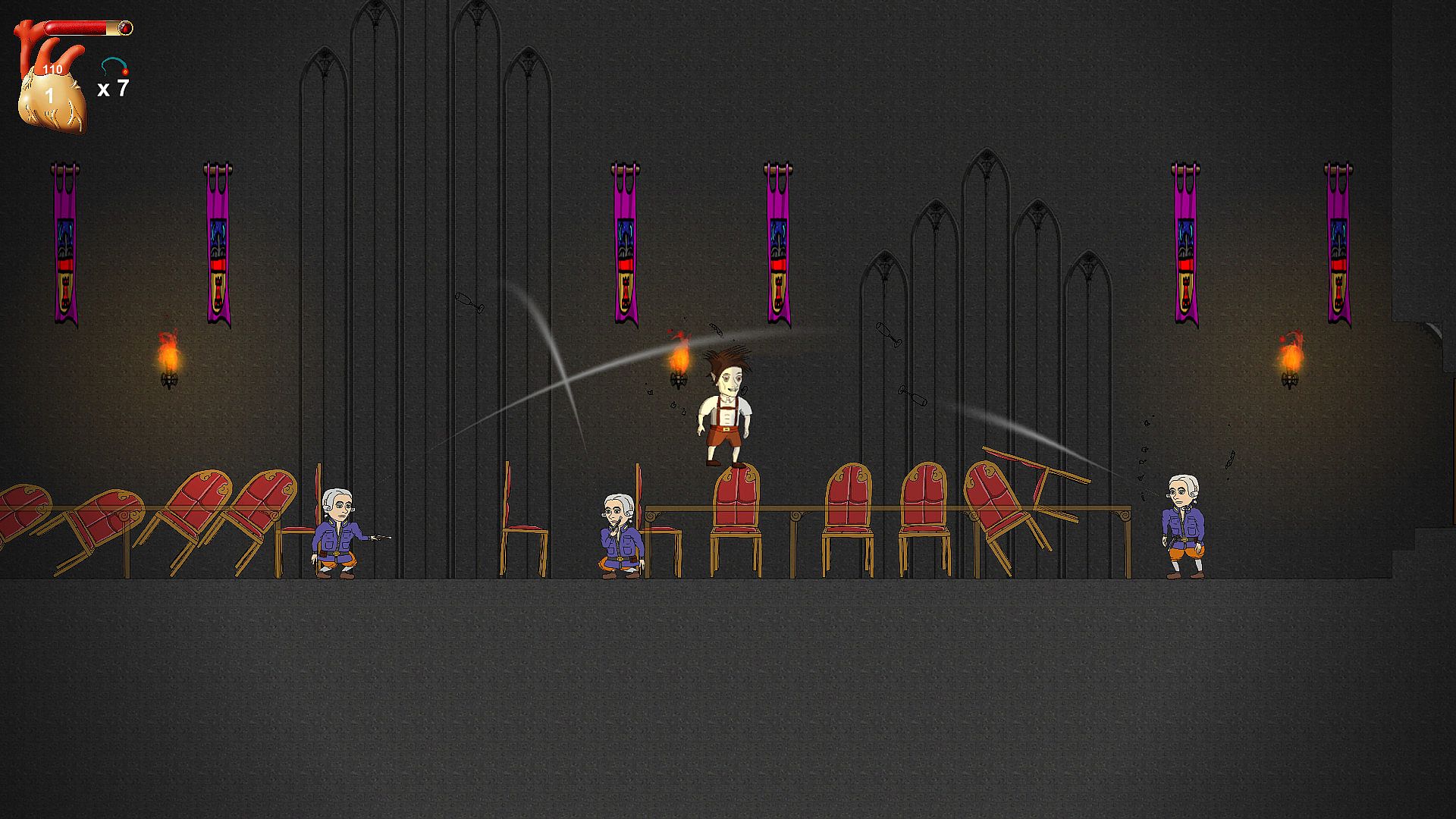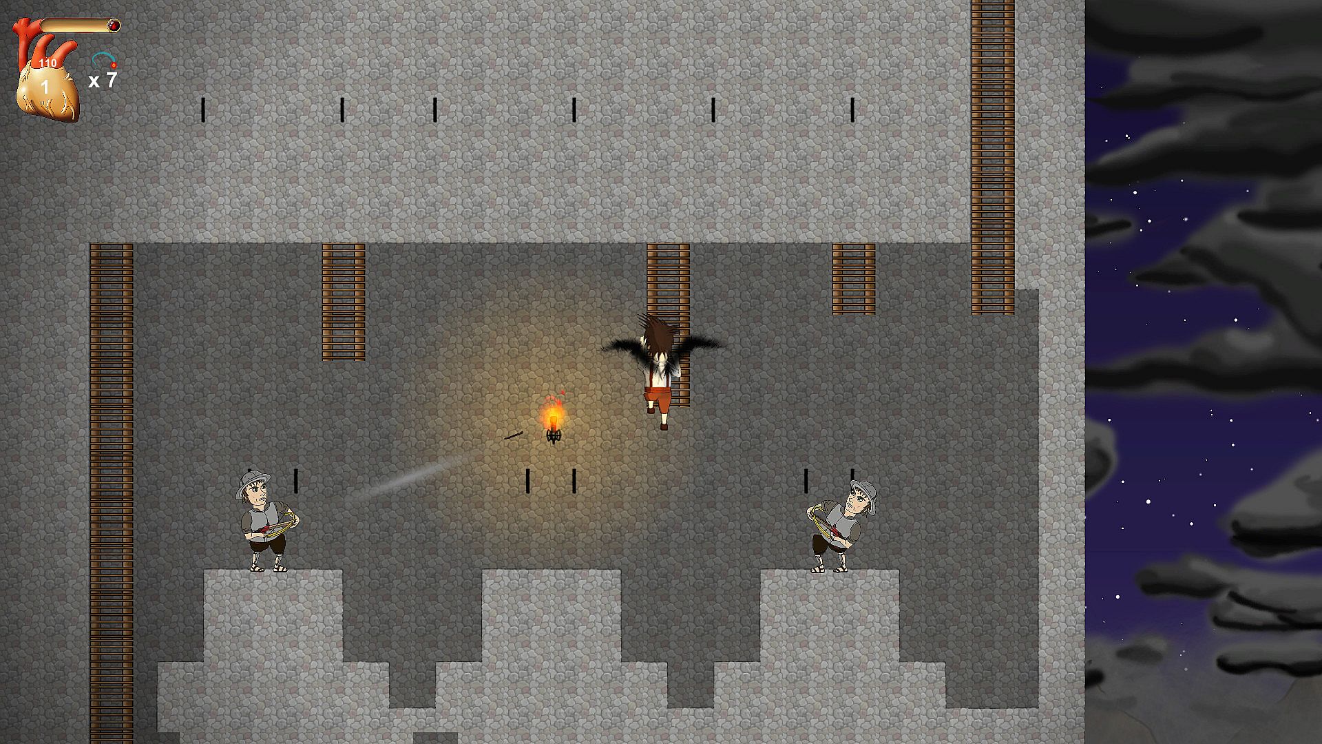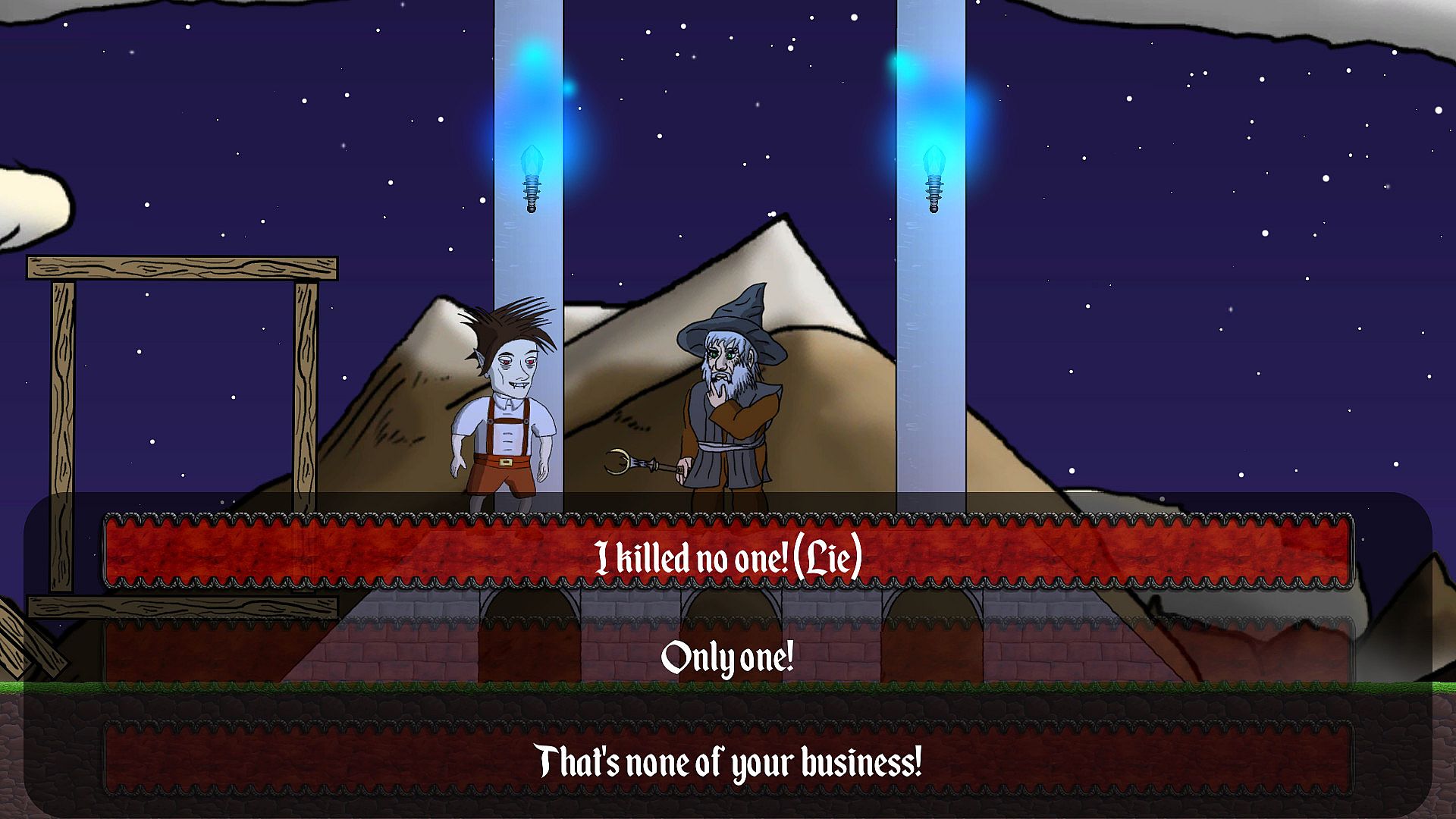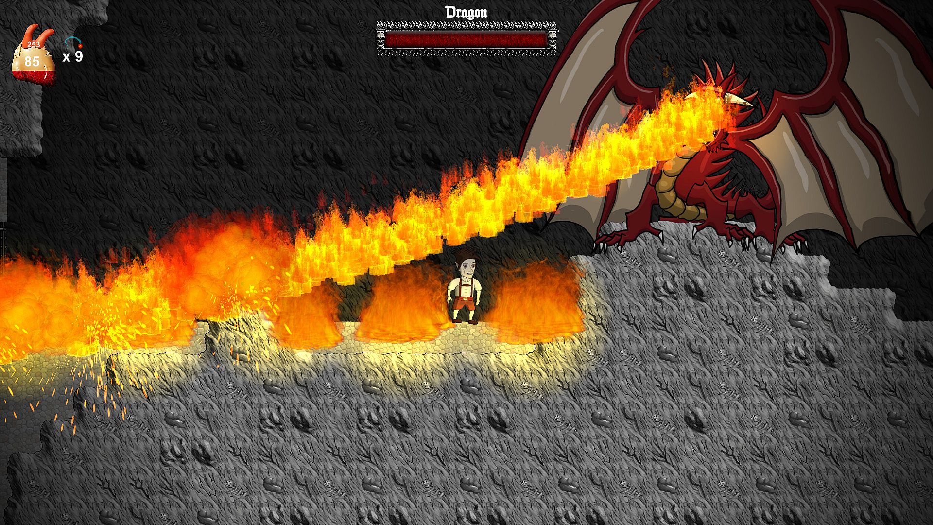 Control Layne, who wakes up and finds out that he has been bitten by a vampire. A dark voice whispers to Layne in his head and teaches him how to defend himself with magic and how to get stronger! Now Layne will have to face his creator, who lives in his castle on the mountains. A random set of bosses will challenge Layne on his way to the top, like the Black Mage, who can help you to become human again. Layne might be haunted by the old castle ghost, who eventually transforms into his old rotten body. Sometimes a vampire hunter will show up, to challenge Layne to a duel. An Assassin might stop Layne and lets him dance to avoid a rain of bombs.