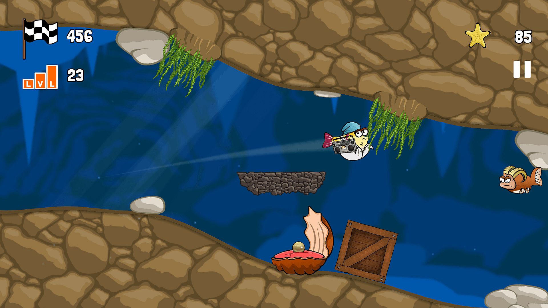 You will collect starfish during your runs which can be exchanged for cosmetic items to beautify your fish. Items can be combined, and no one will stop you from creating a blowfish in a suit sporting a mohawk with hipster glasses.
