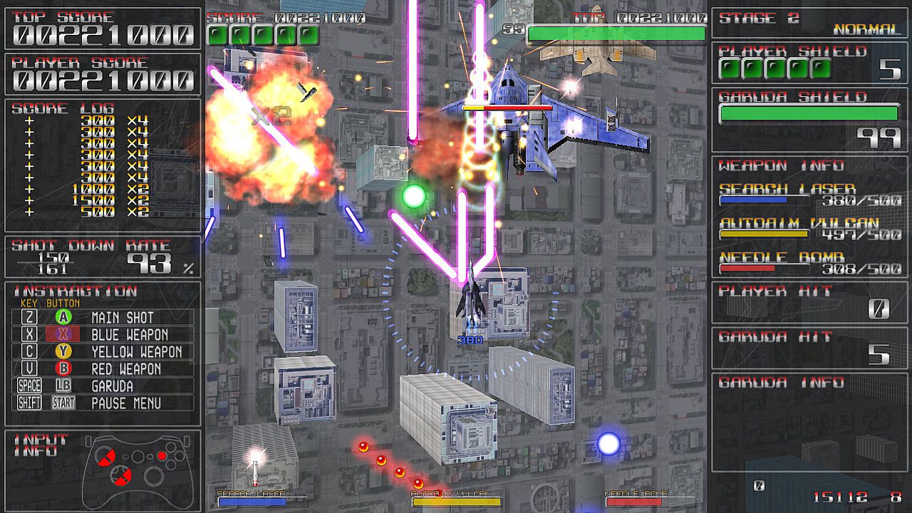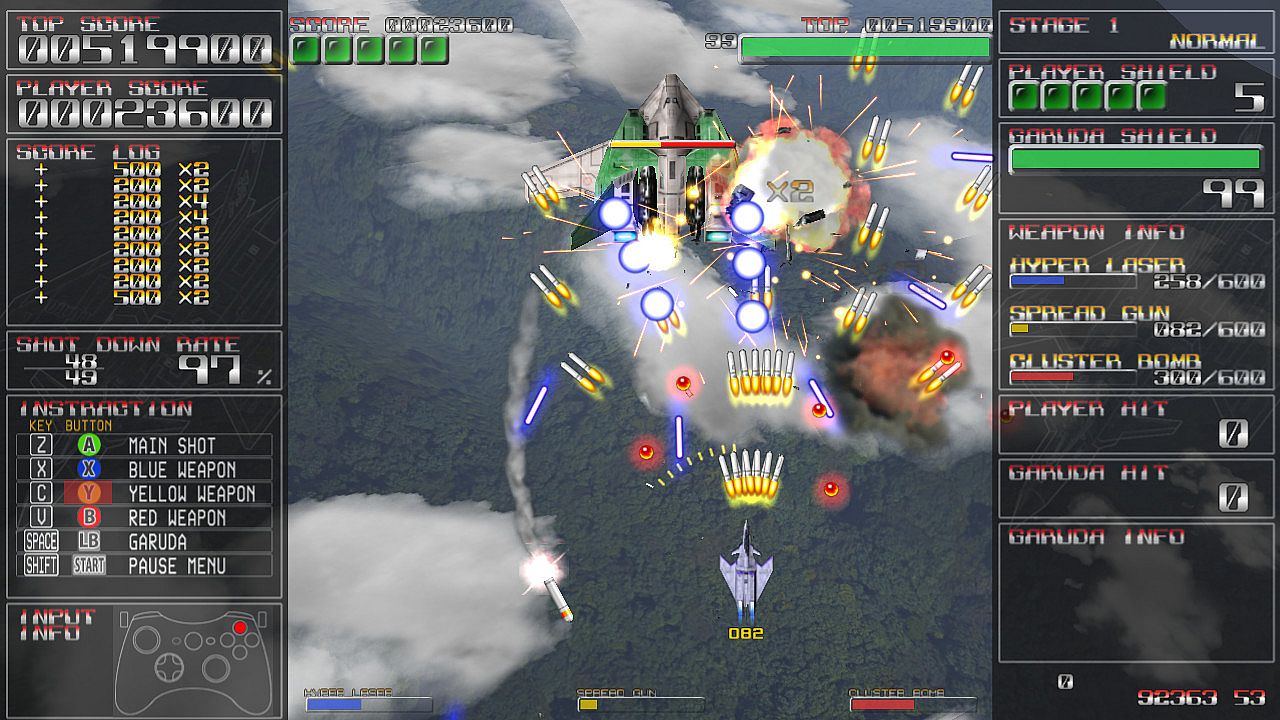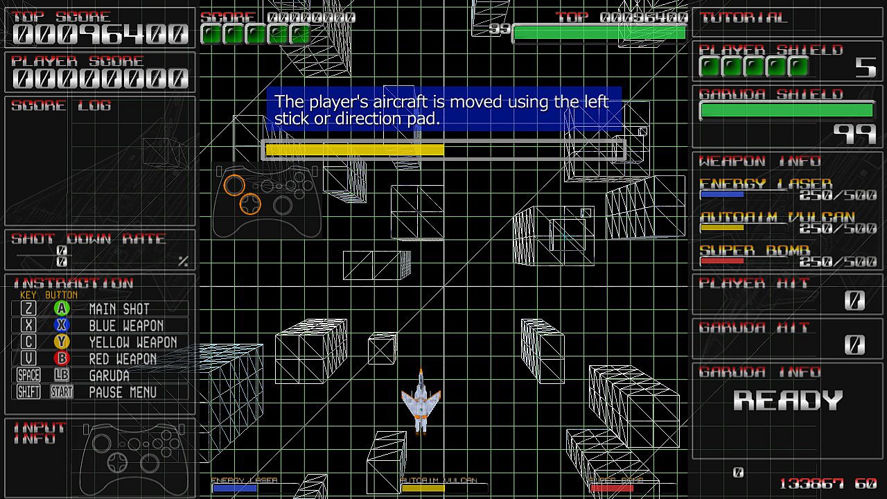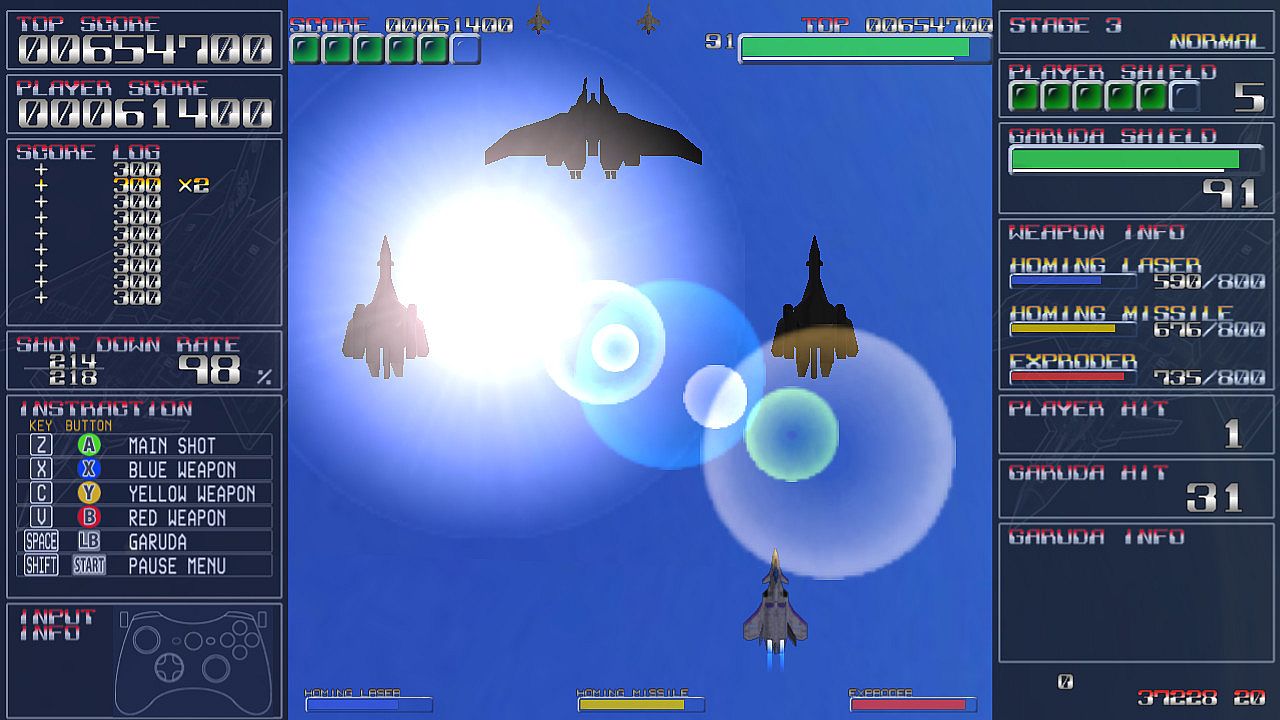 Calling for your support aircraft, Garuda, allows you to refuel your special weapons and restore your ship's shields.