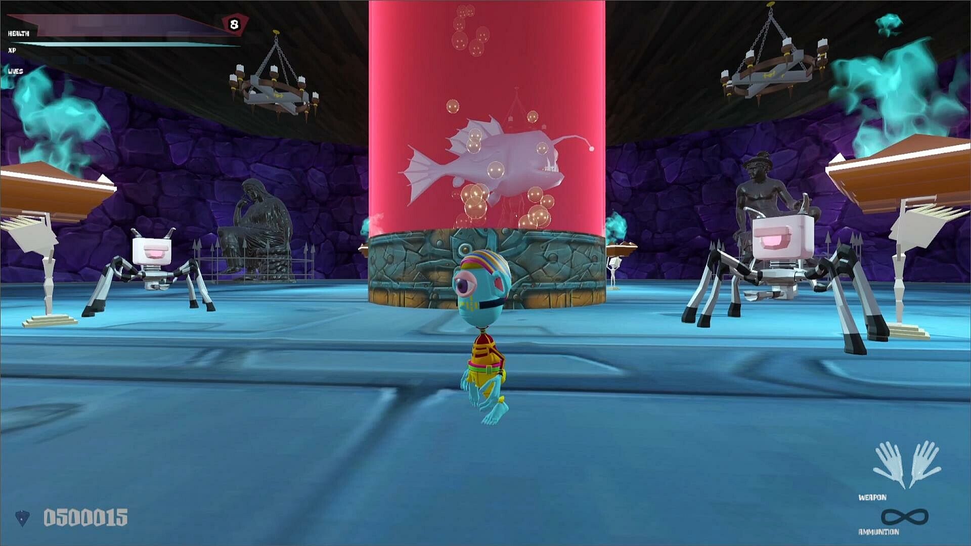 In his quest, Bluebie will travel through mines,  mountains, desert and different other places where the cyborgs settled and launched their operation. He will fight the generals of Dr Cybex to free as much prisoners as he can while developing and purchasing new skills thanks to his colorful closet plenty of different outfits.