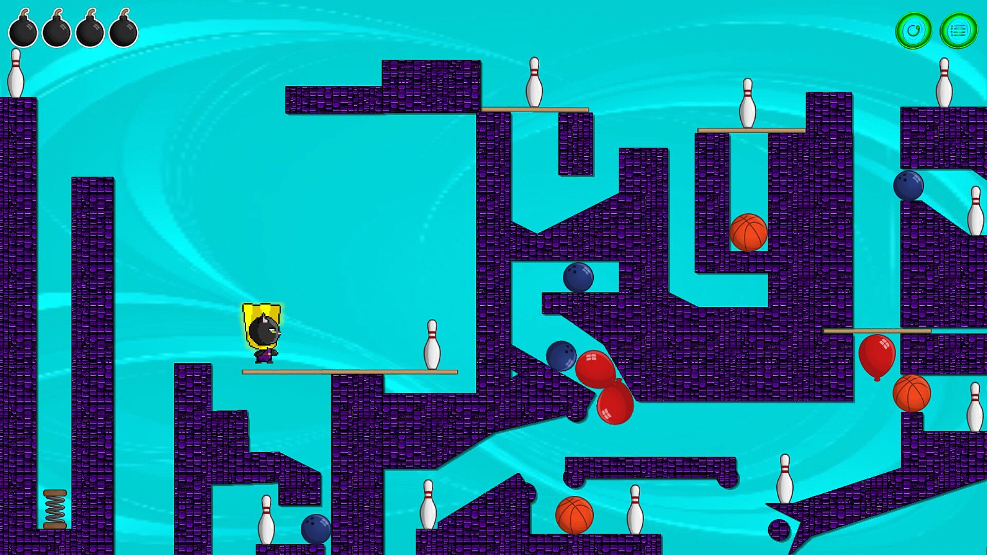 The goal of the game is to complete levels by knocking pins off the screen. This can be done by exploding bombs that set various objects in motion (bowling balls, pins, basketballs, canes, balloons)