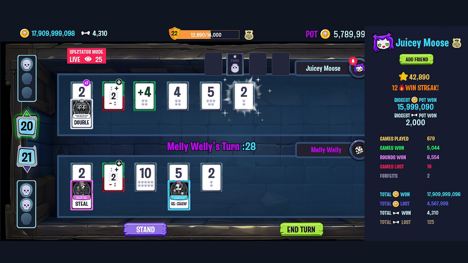 Dive into the most bone-rattling card game in town! Outwit opponents, play Power Cards wisely, and race to reach 21 without busting. Spice things up with strategic bets and win three rounds to become the ultimate Bonez champion! Every draw counts so shuffle the deck, place your bets, and join the Bonez revolution now!
