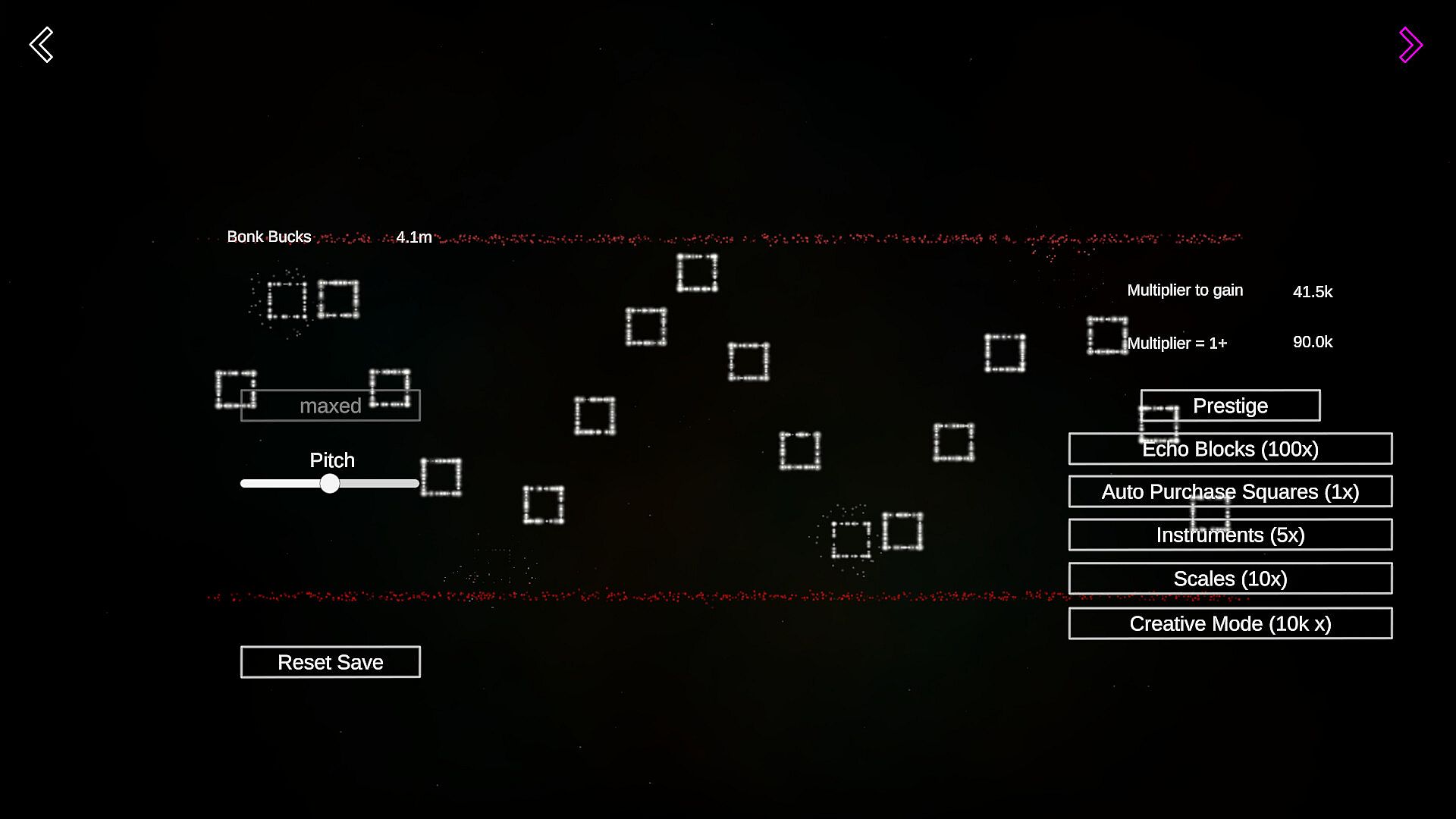 Squares move up and down playing notes and awarding 'bonk bucks' when changing directions. Once you get enough 'bonk bucks', you can buy more squares. Once you get 100 'bonk bucks', you can prestige to add a multiplier to every bonk. Then you can spend the multiplier to unlock more features such as other scales and instruments. Once you get a whole bunch of multiplier you can unlock the Creative Mode which allows custom scales, speed change, and setting the number of blocks directly.