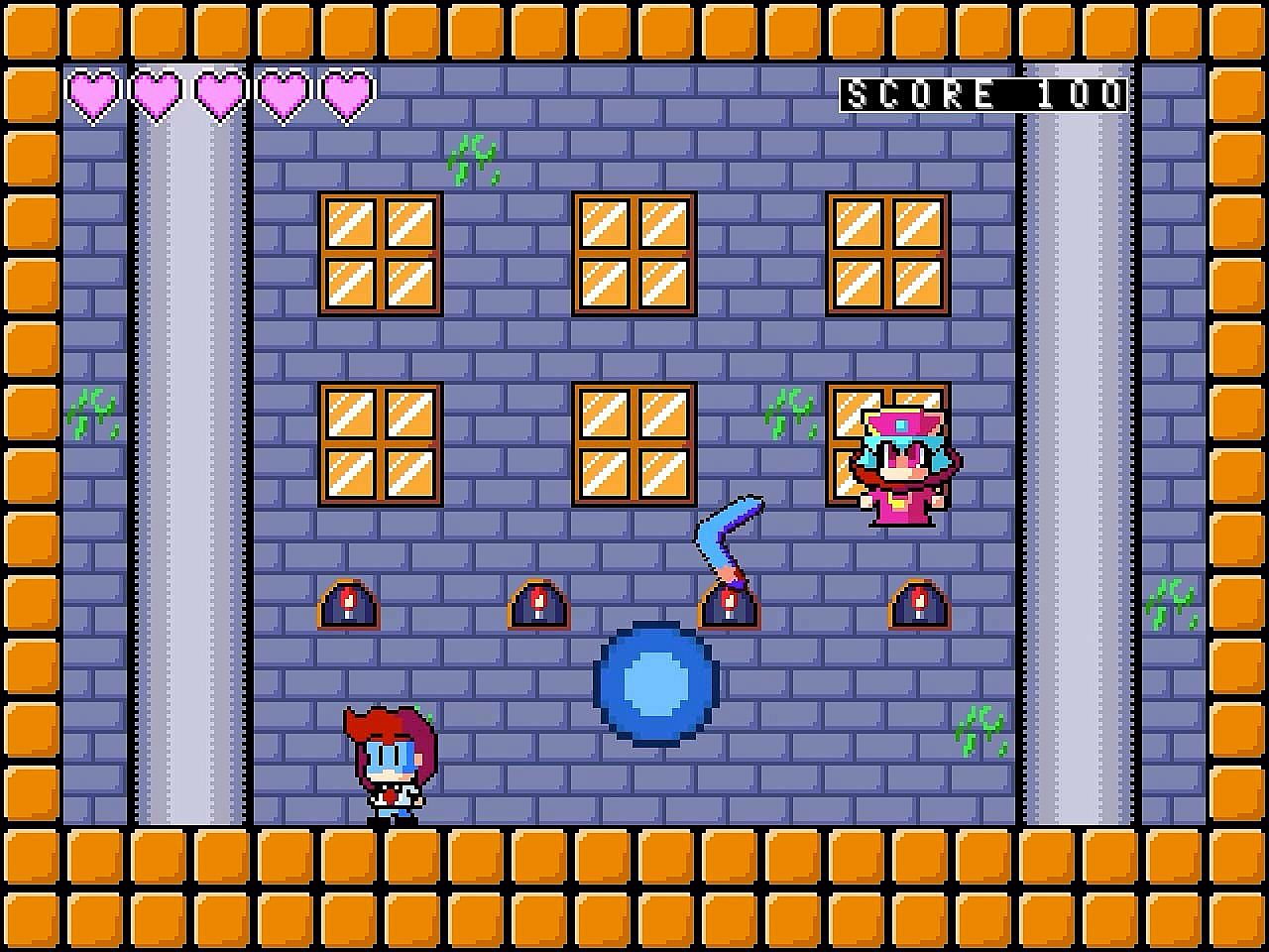 A player will control 'Kyoko Senbonbashi', who always stands on the side of justice, to defeat an evil organization 'Dokuro-dan' by using a boomerang thrown to 8 directions and passing all 8 stages that each consists of 2 areas and a final boss.