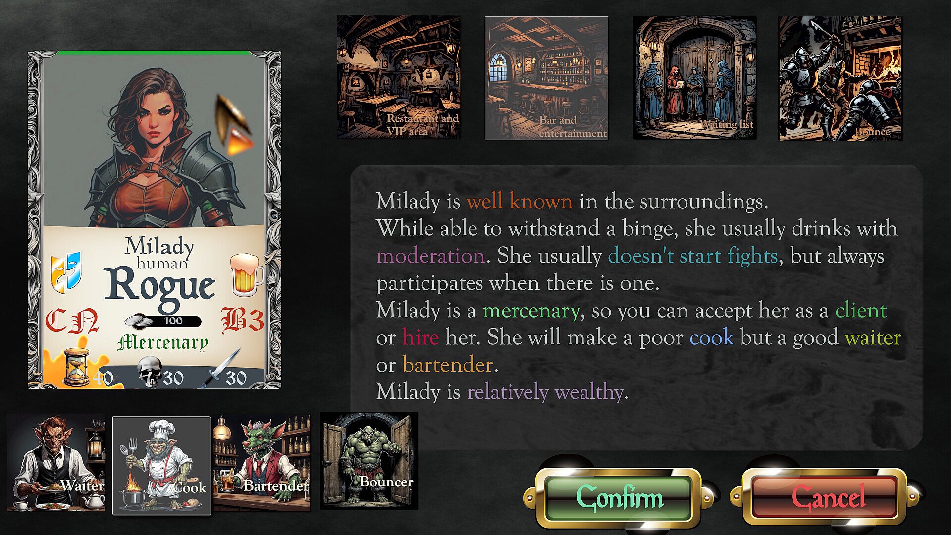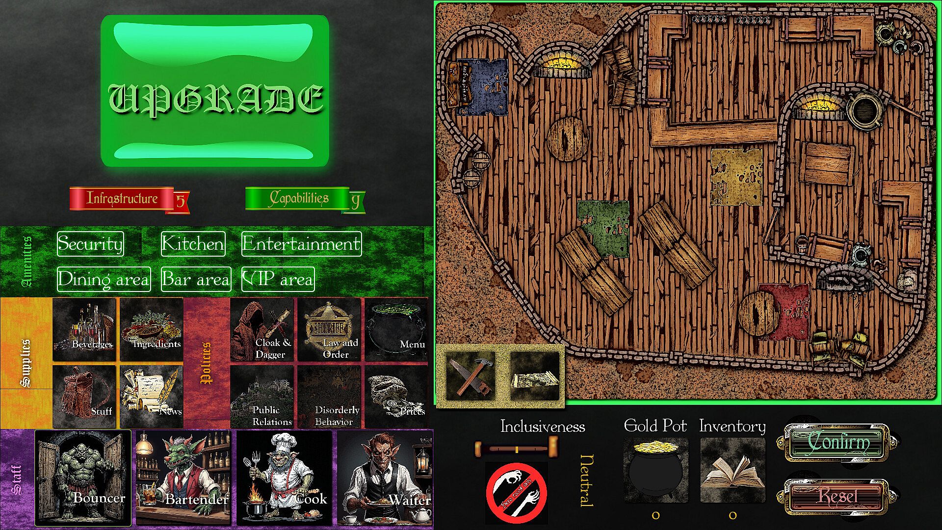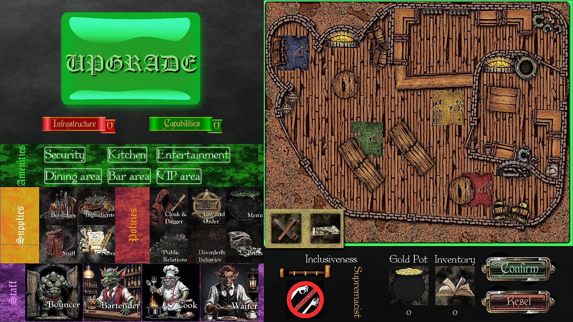 Will you align with strict conservative heroes values by keeping the lesser races (goblins, trolls, ogres and the like) in their servile position of staff members, or will you champion inclusivity by allowing them to mix with your clientele? Would you go as far as to welcoming some undead? What is your stance on ghouls admission? All these decisions will shape your business and determine your future.