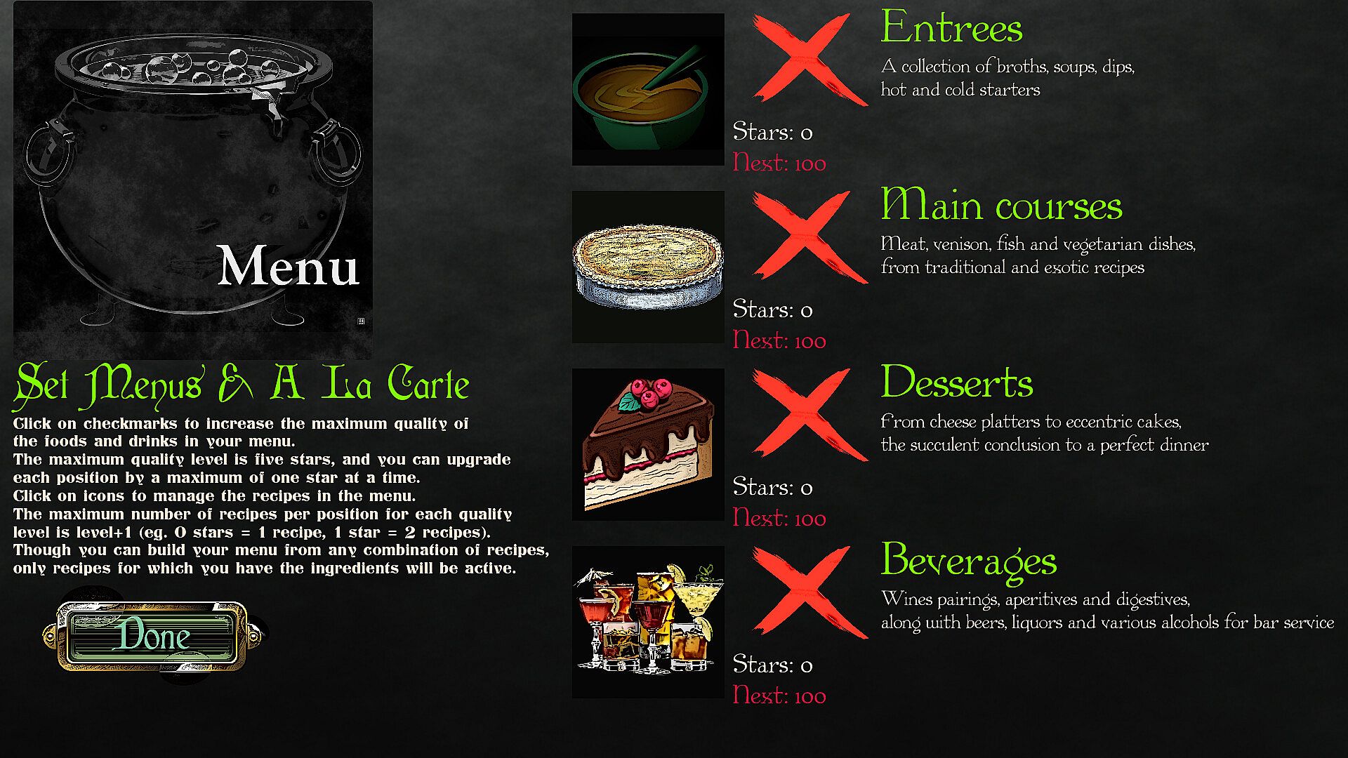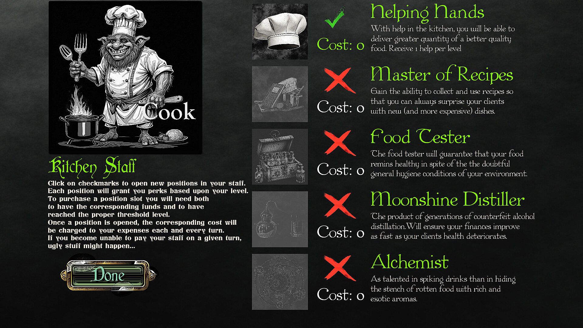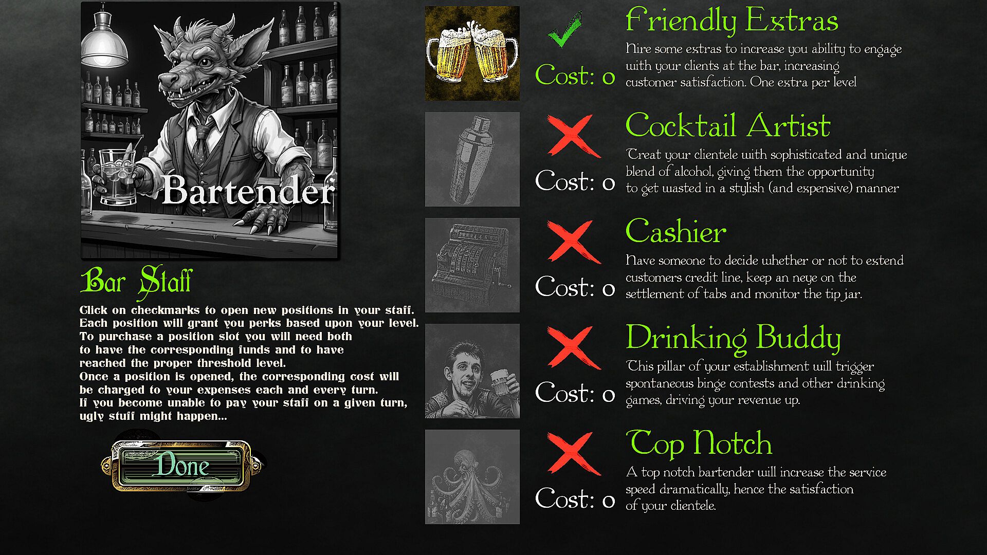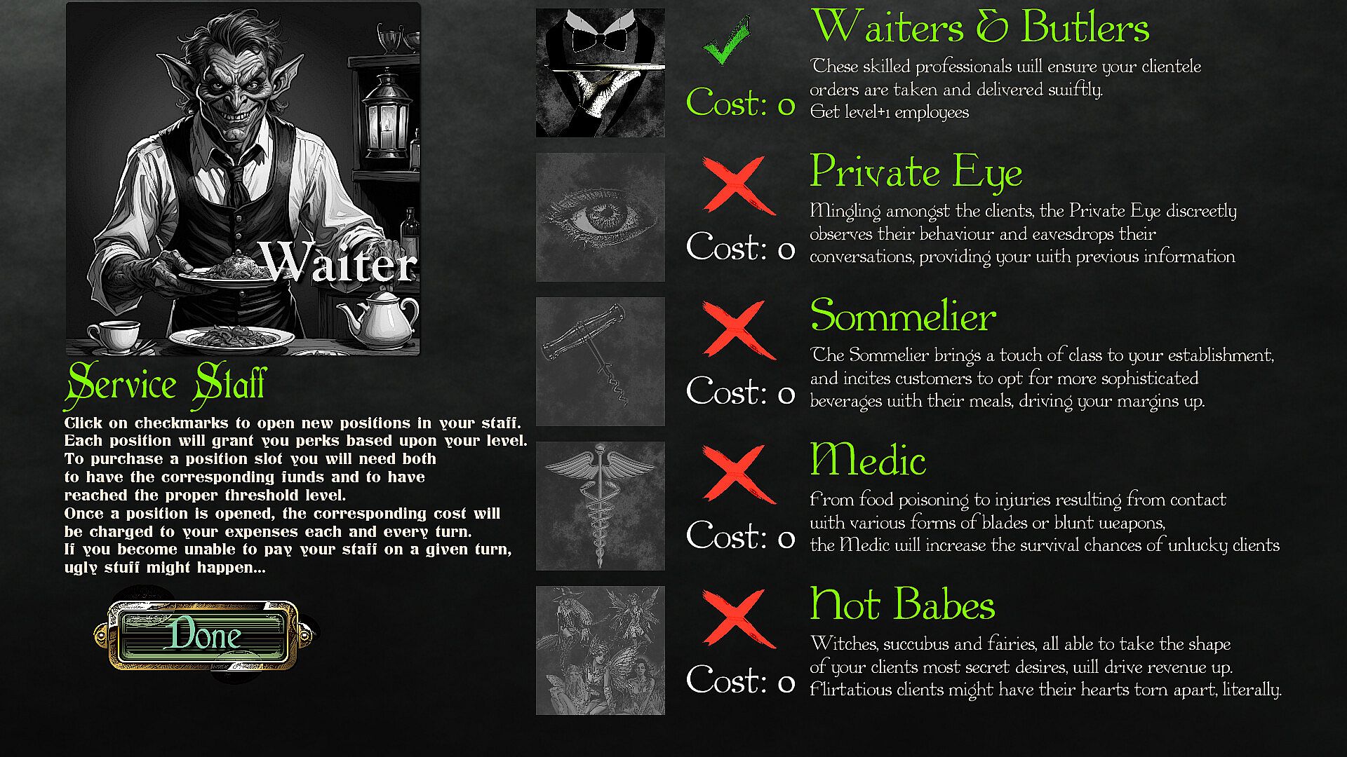 Will you align with strict conservative heroes values by keeping the lesser races (goblins, trolls, ogres and the like) in their servile position of staff members, or will you champion inclusivity by allowing them to mix with your clientele? Would you go as far as to welcoming some undead? What is your stance on ghouls admission? All these decisions will shape your business and determine your future.